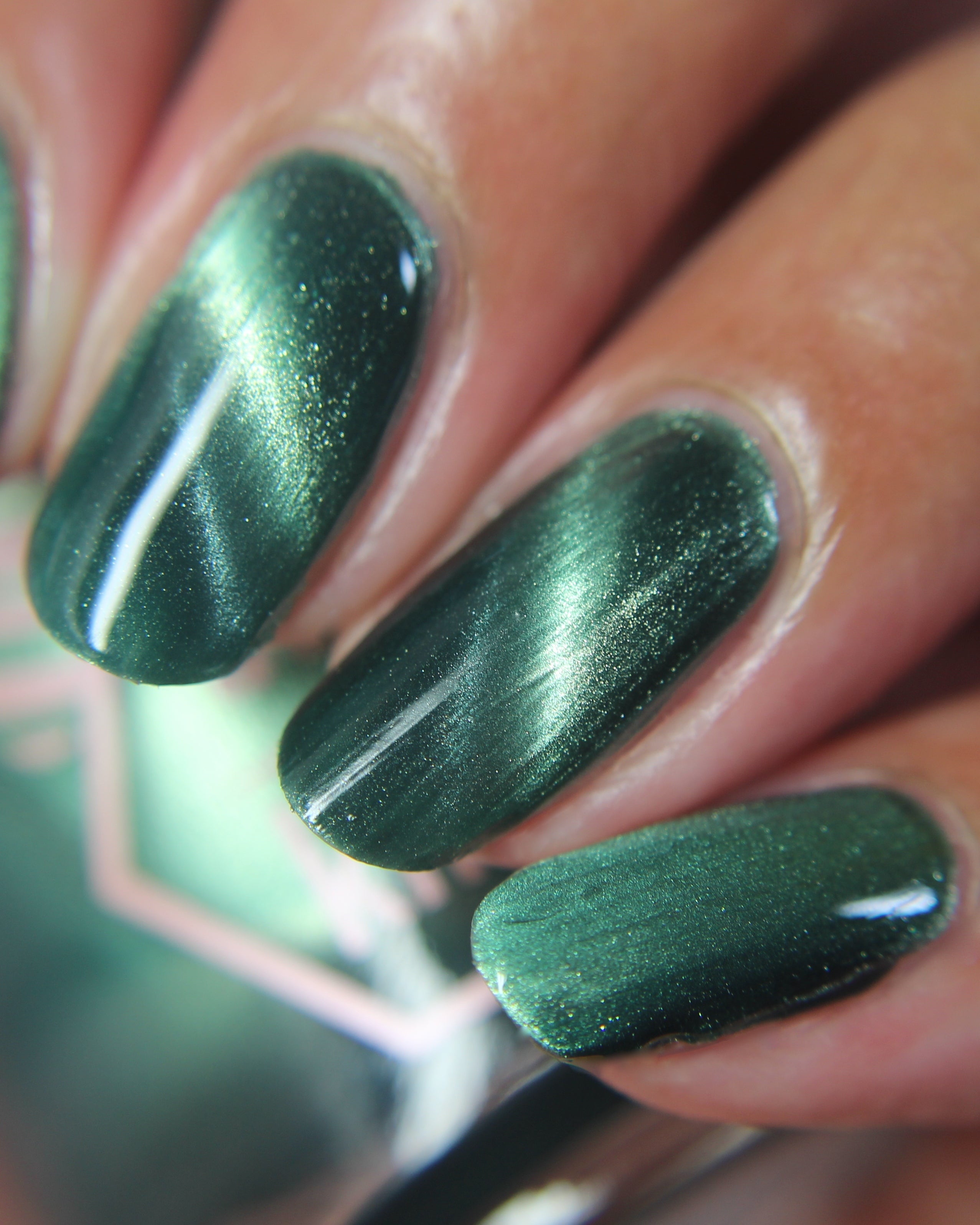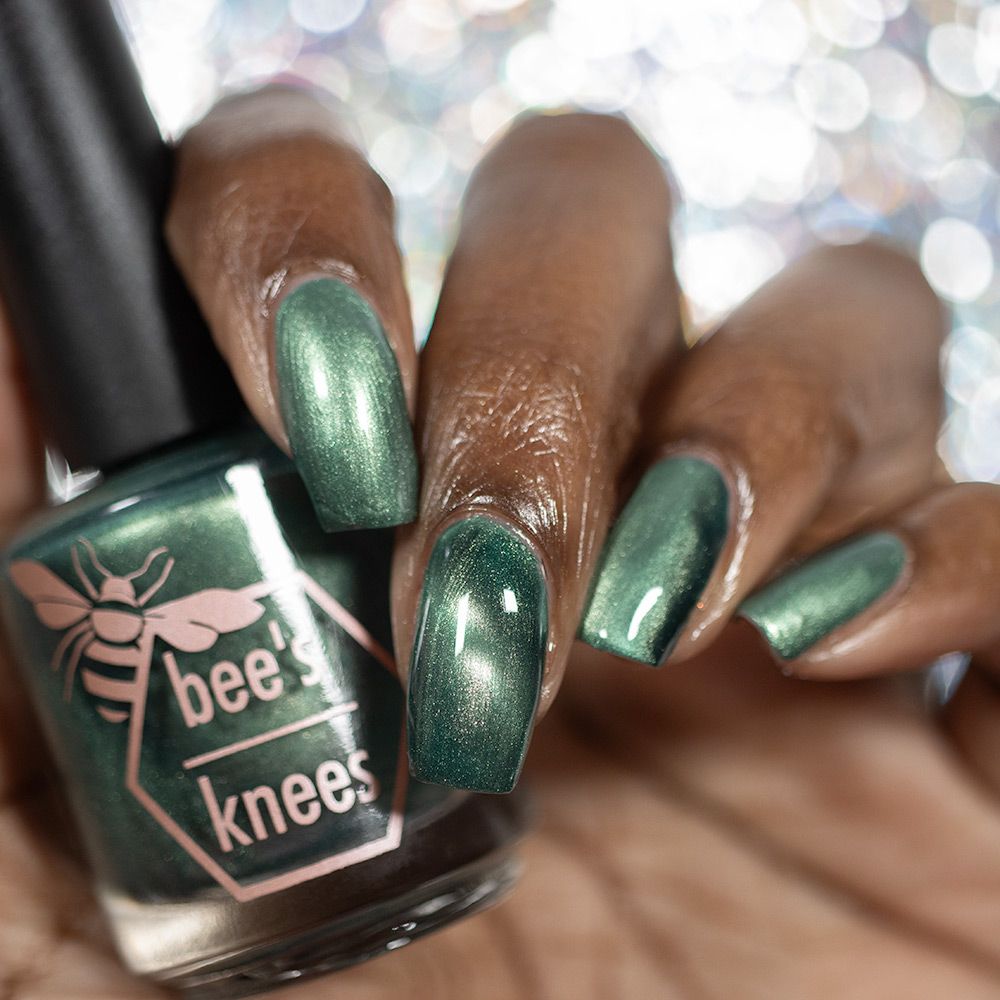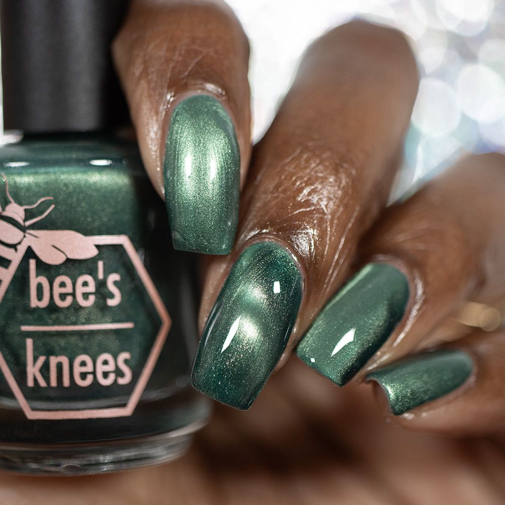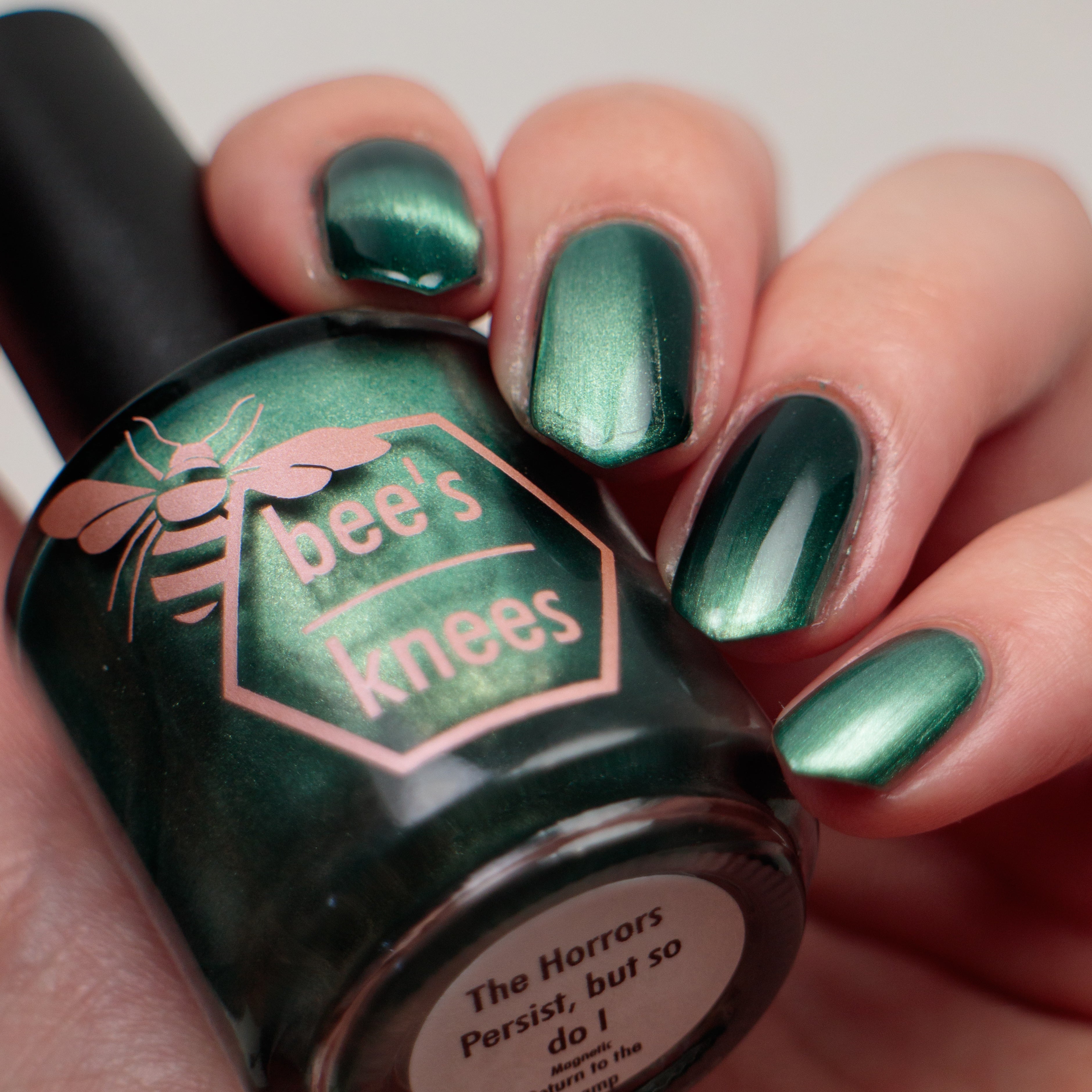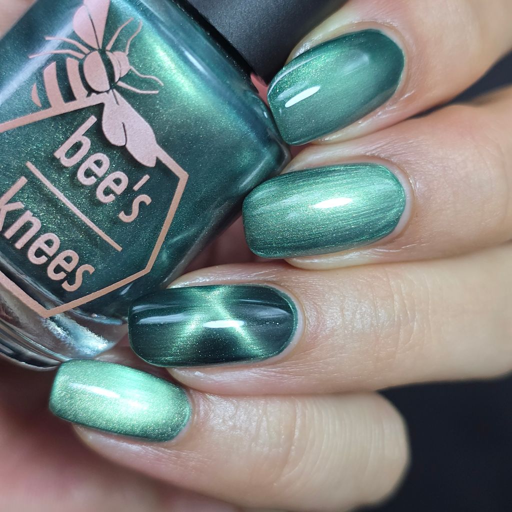 The Horrors Persist but So Do I - a dark teal Bog Dweller Sibling with silver magnetic shimmer.