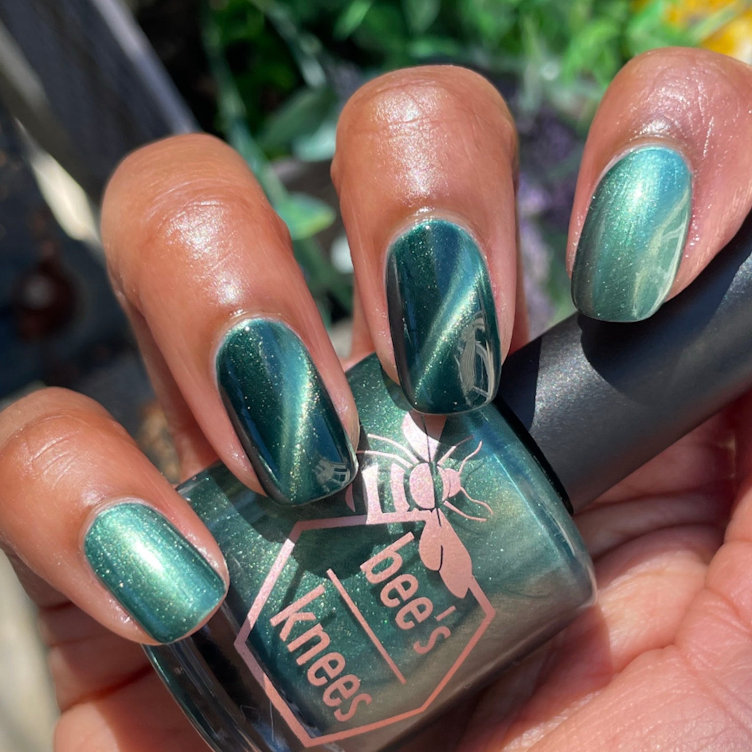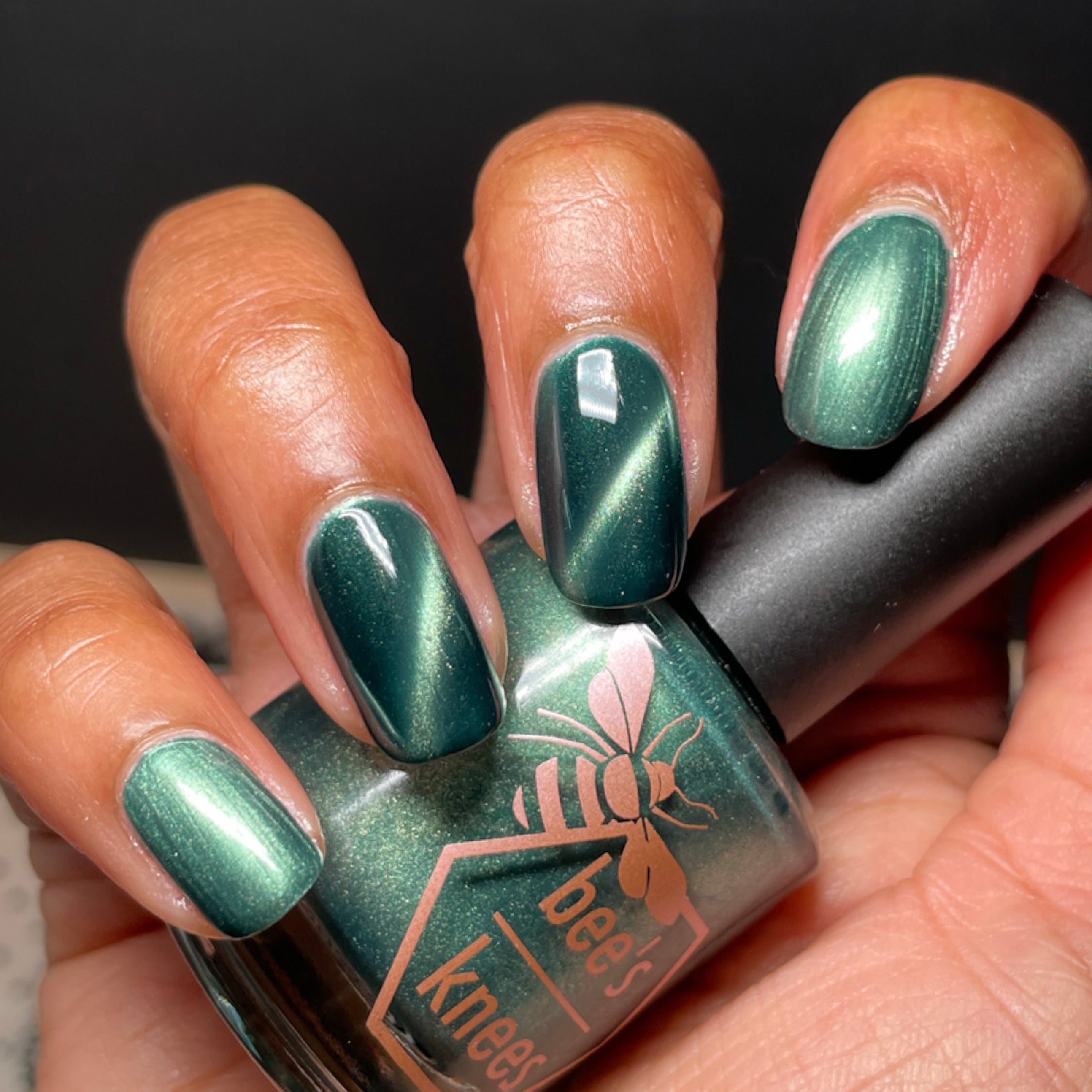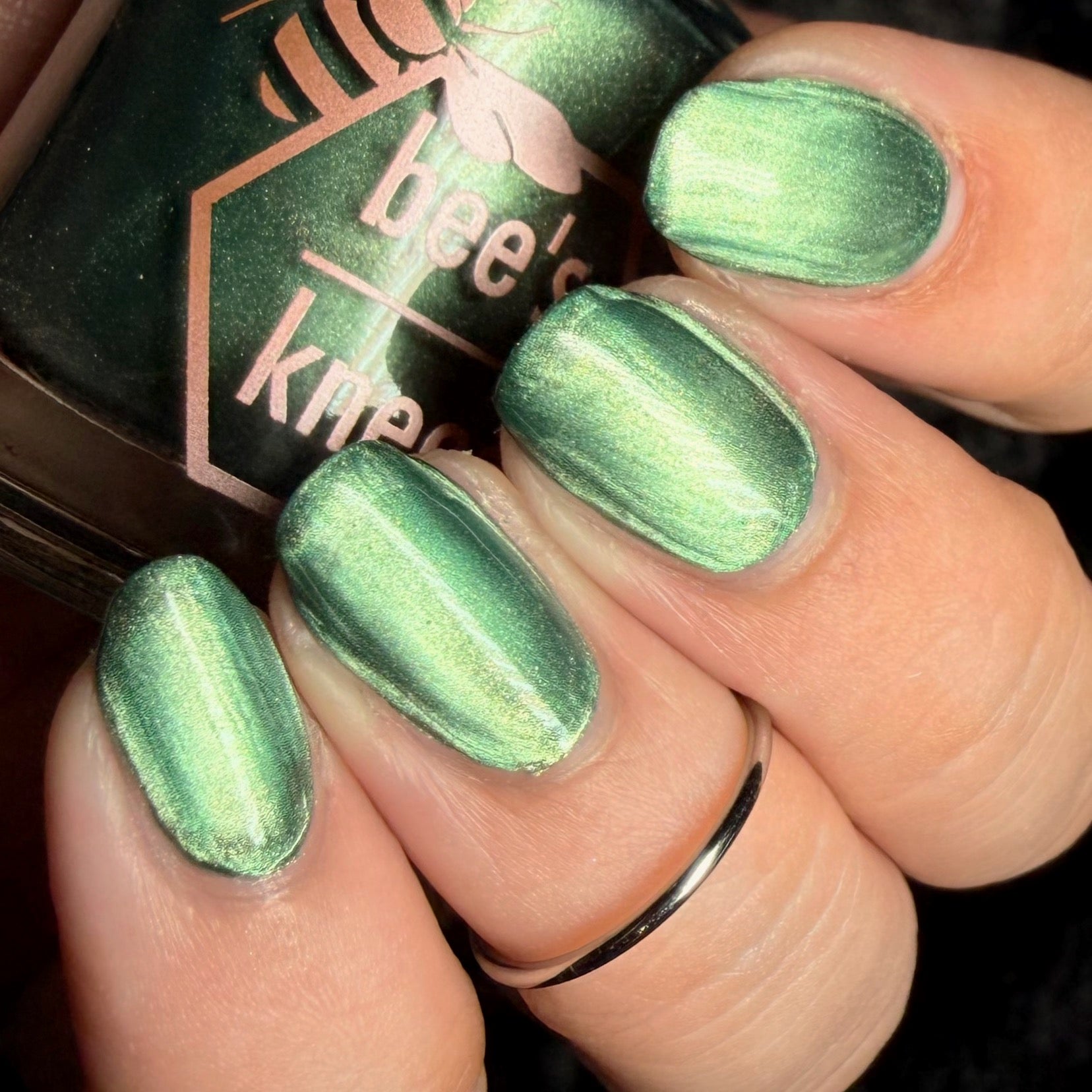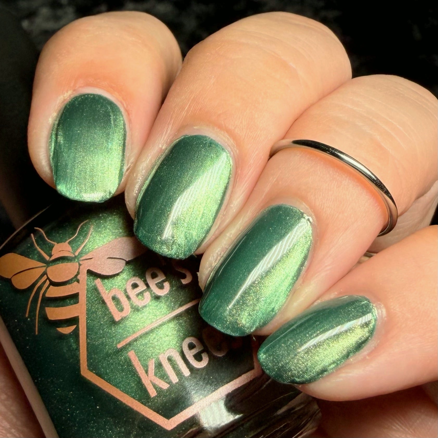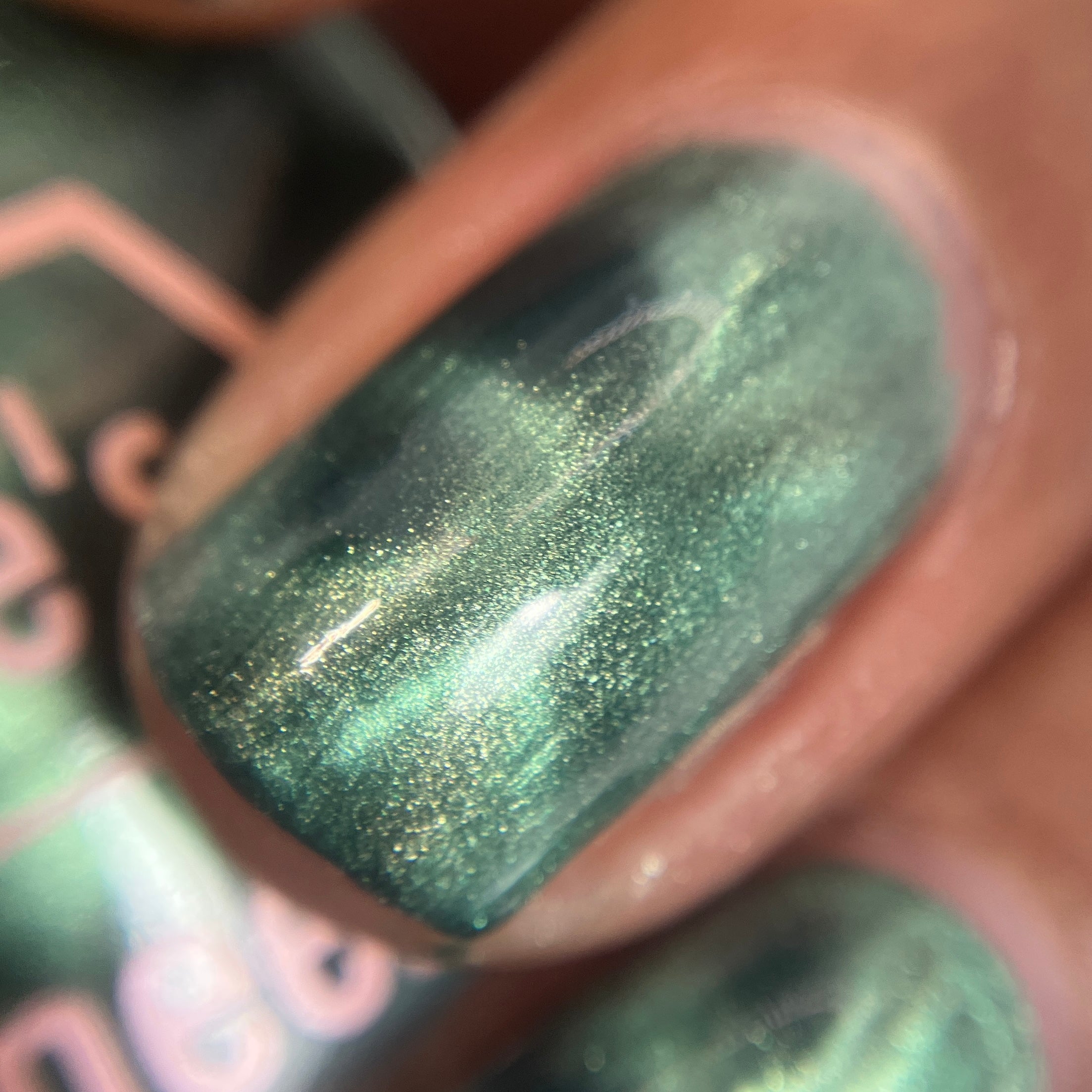 The Horrors Persist but So Do I - a dark teal Bog Dweller Sibling with silver magnetic shimmer.