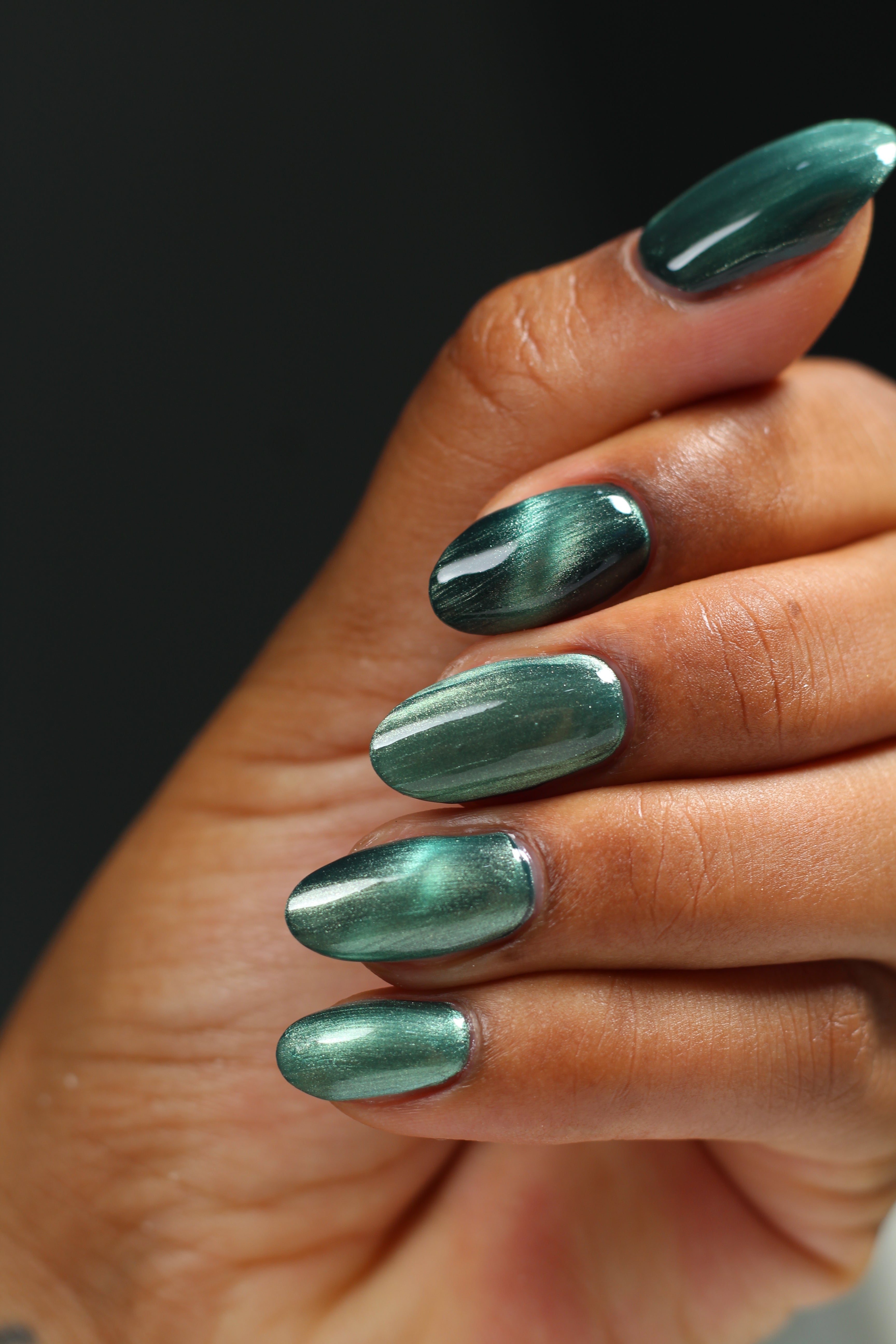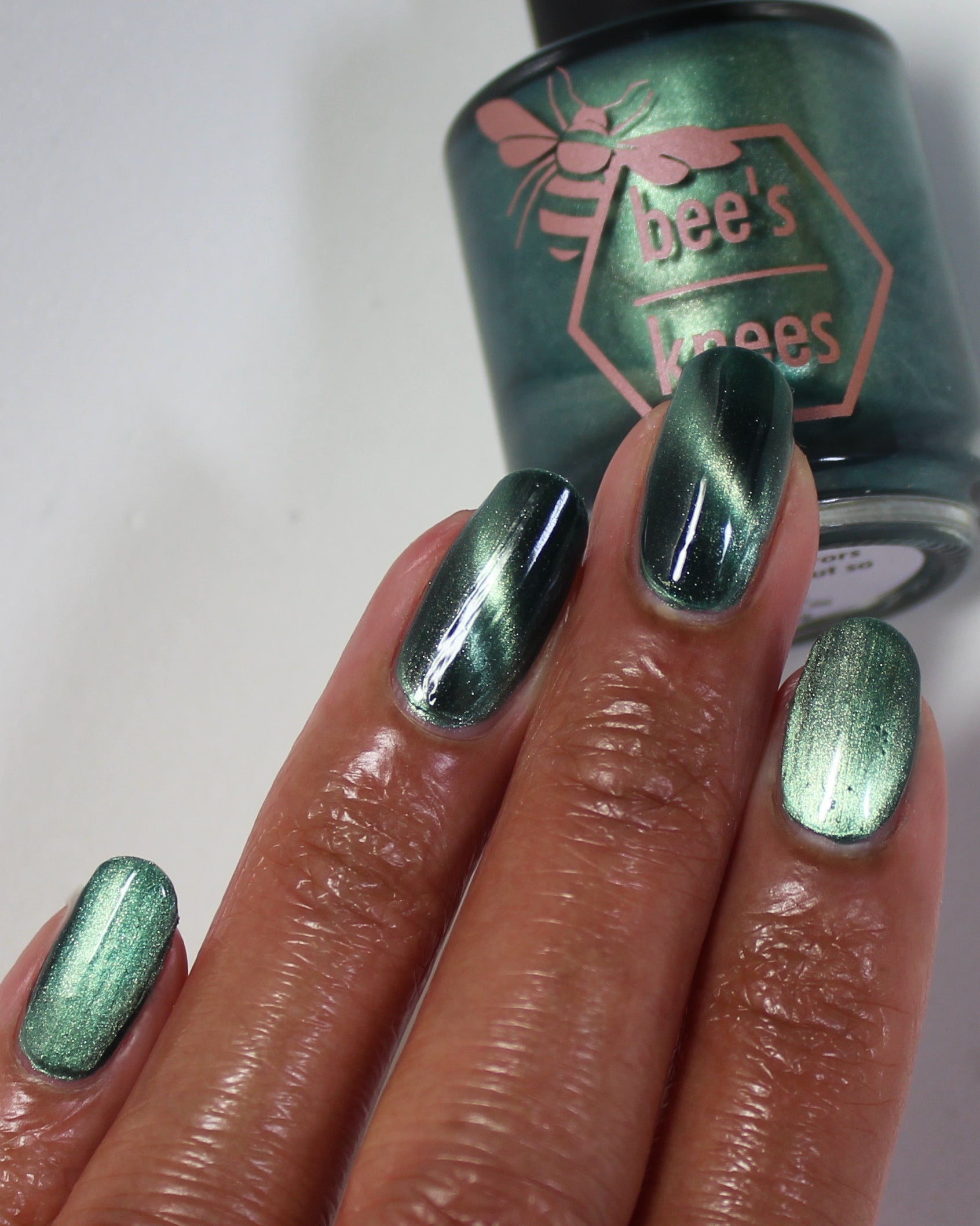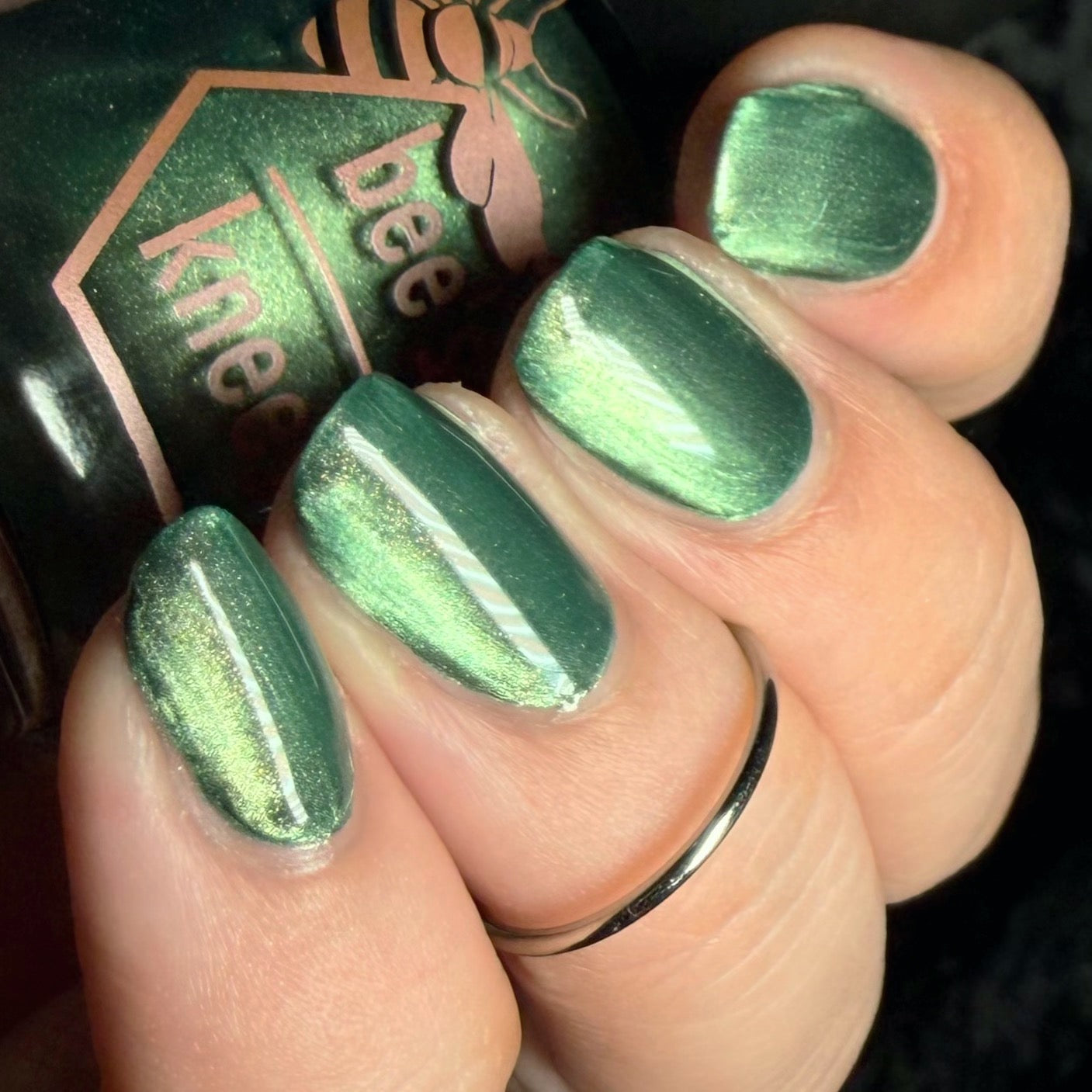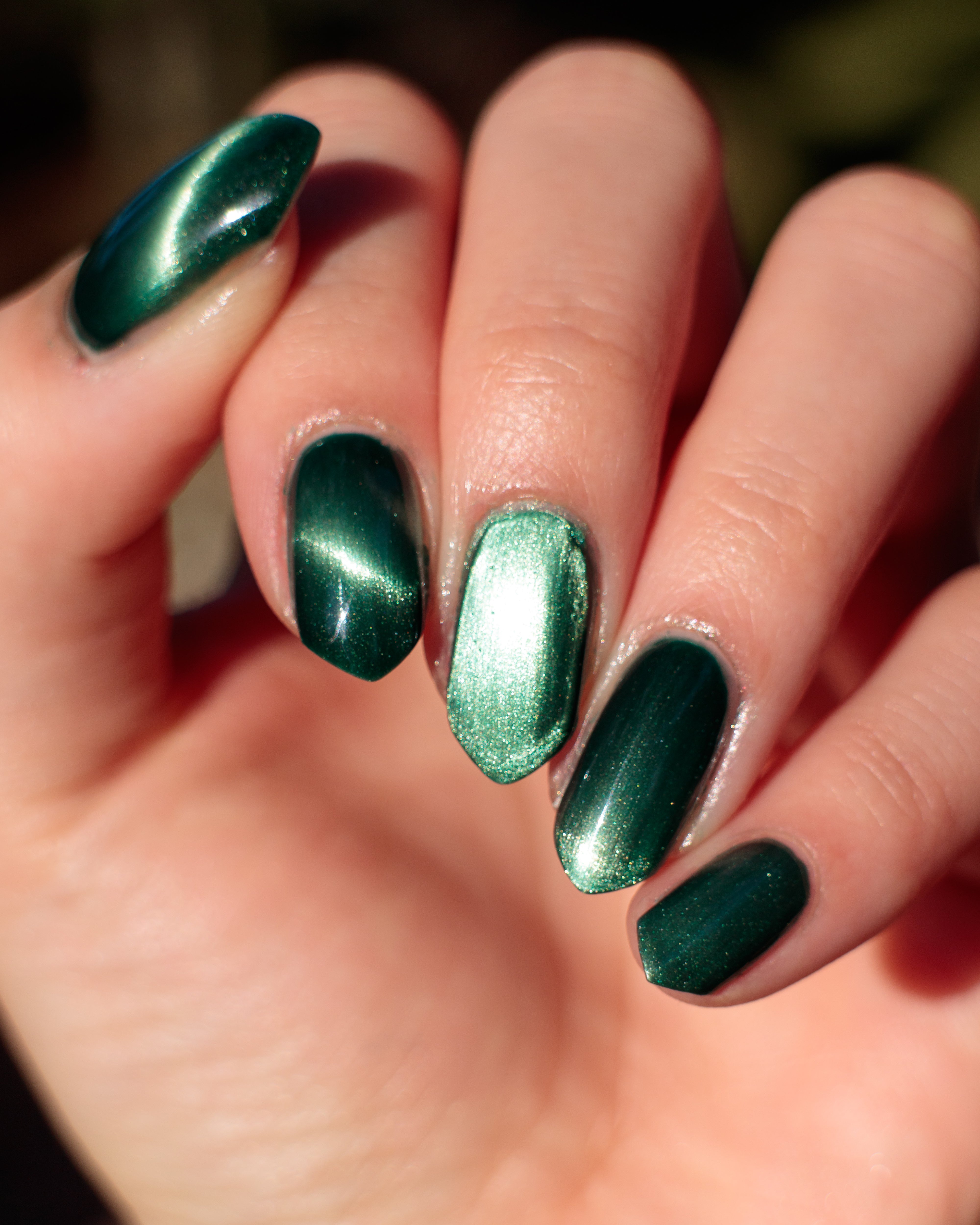 The Horrors Persist but So Do I - a dark teal Bog Dweller Sibling with silver magnetic shimmer.