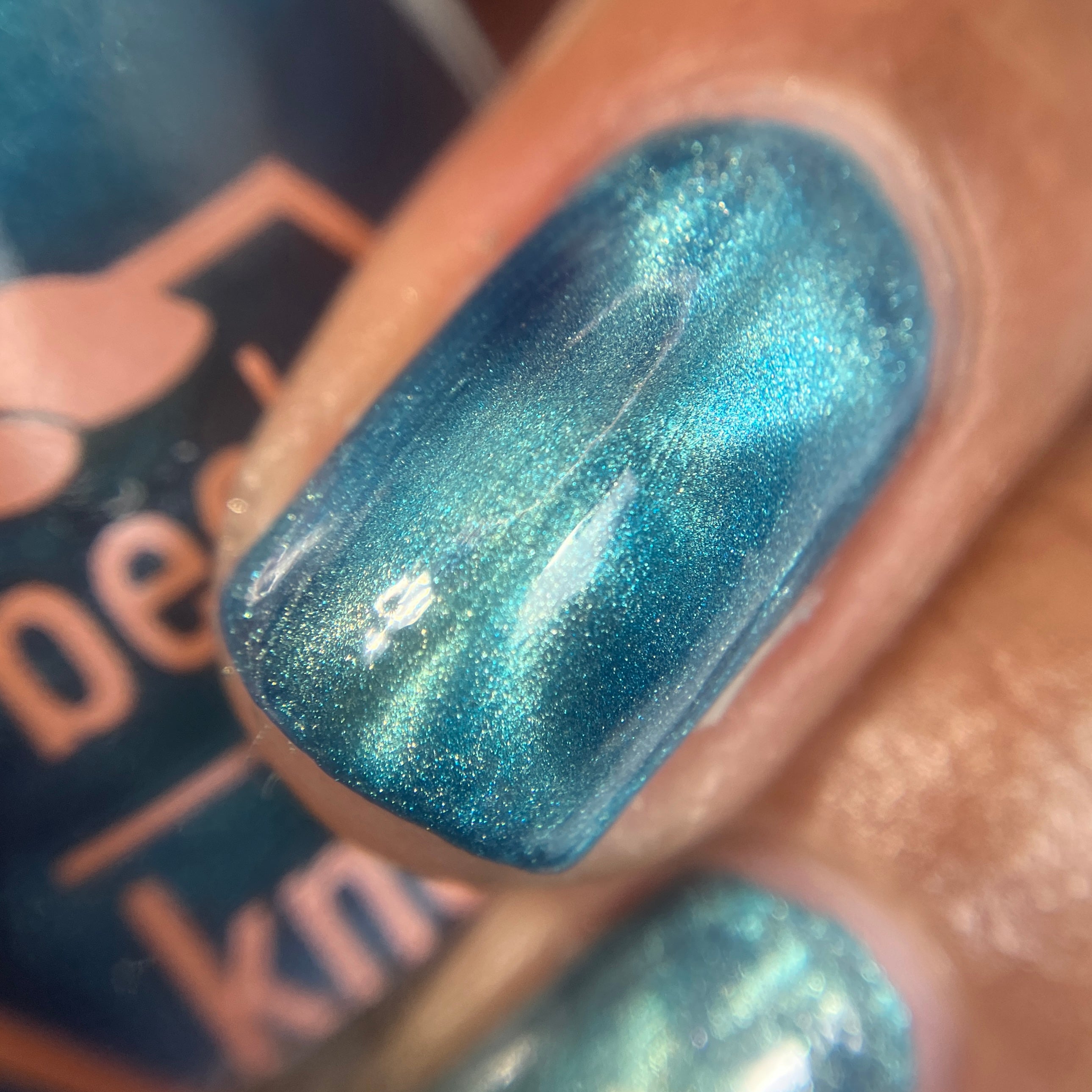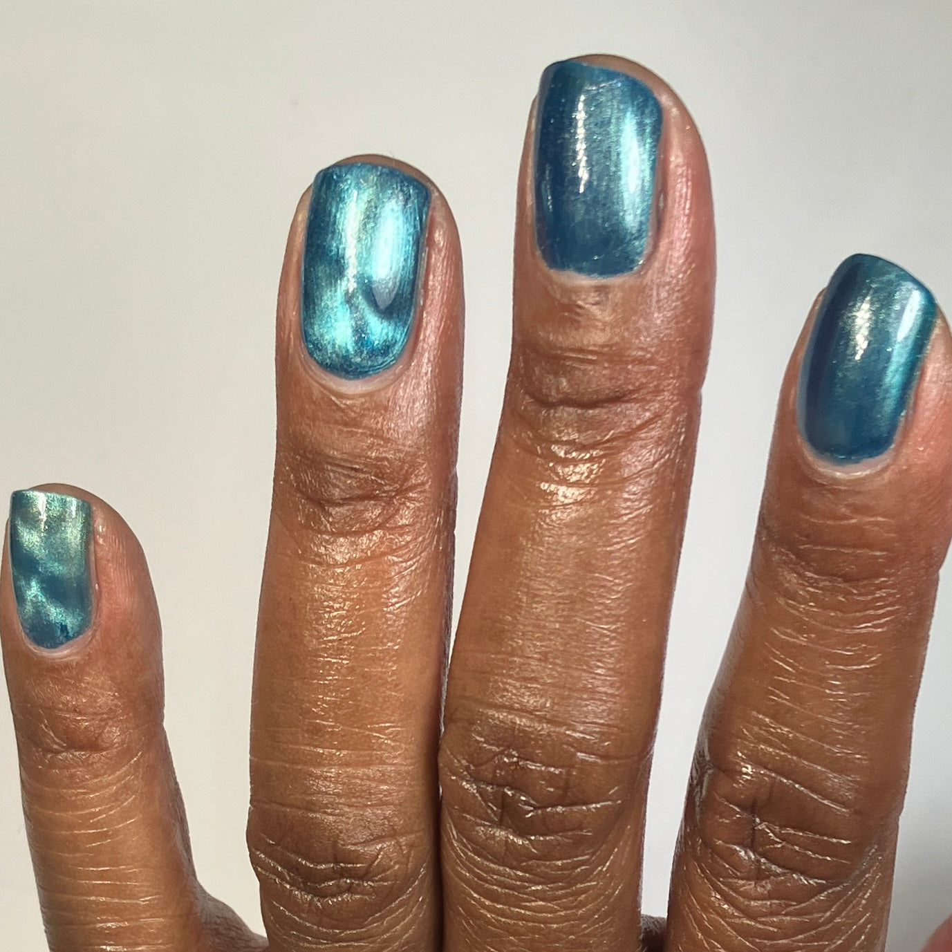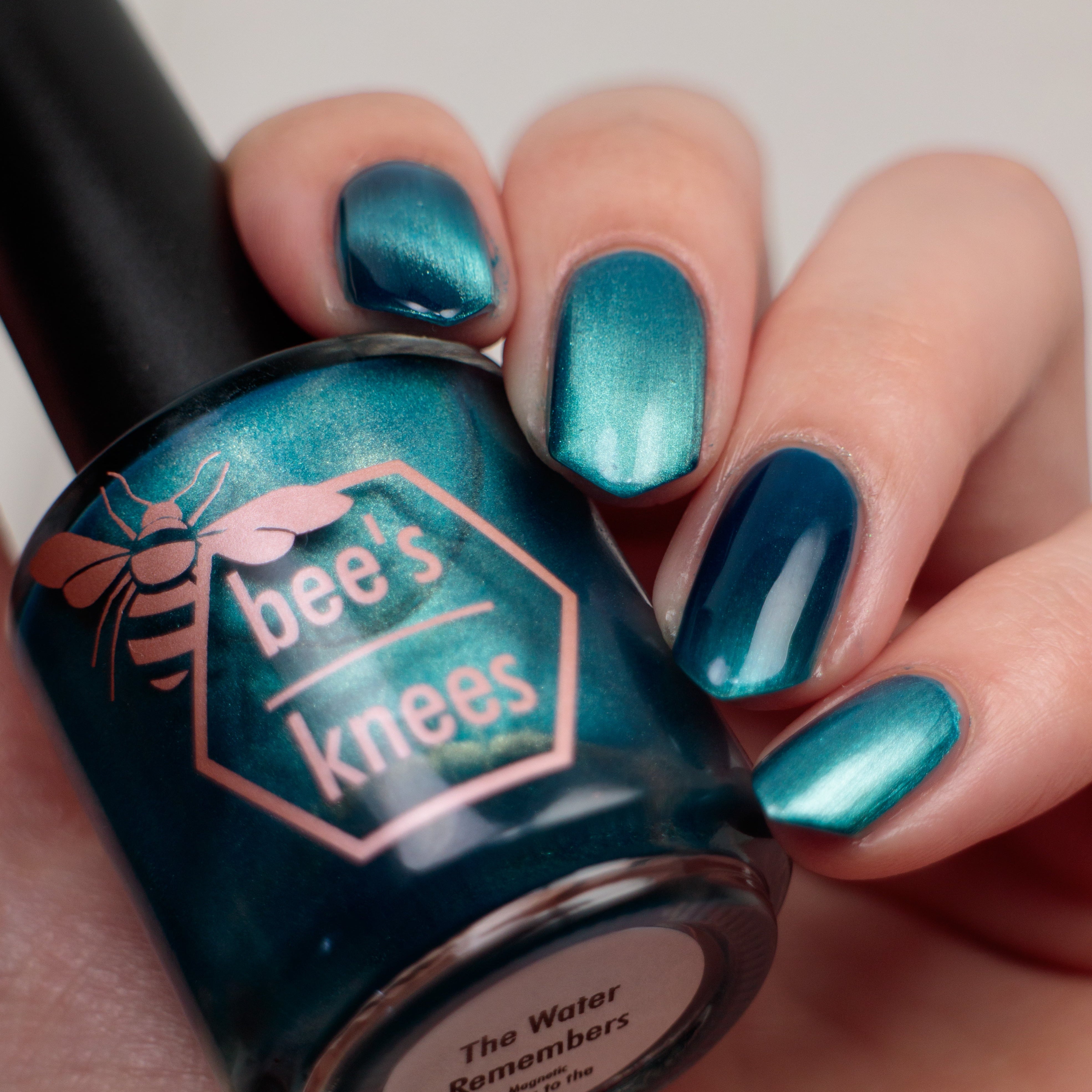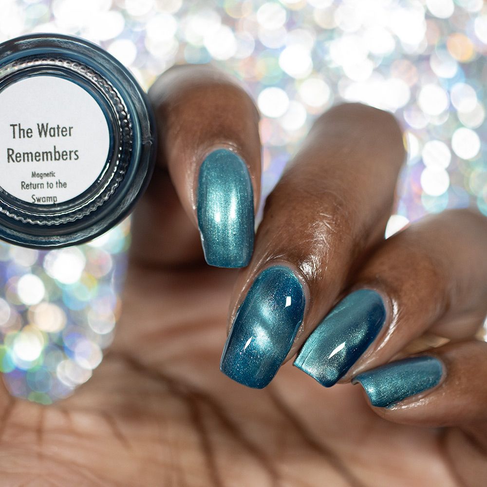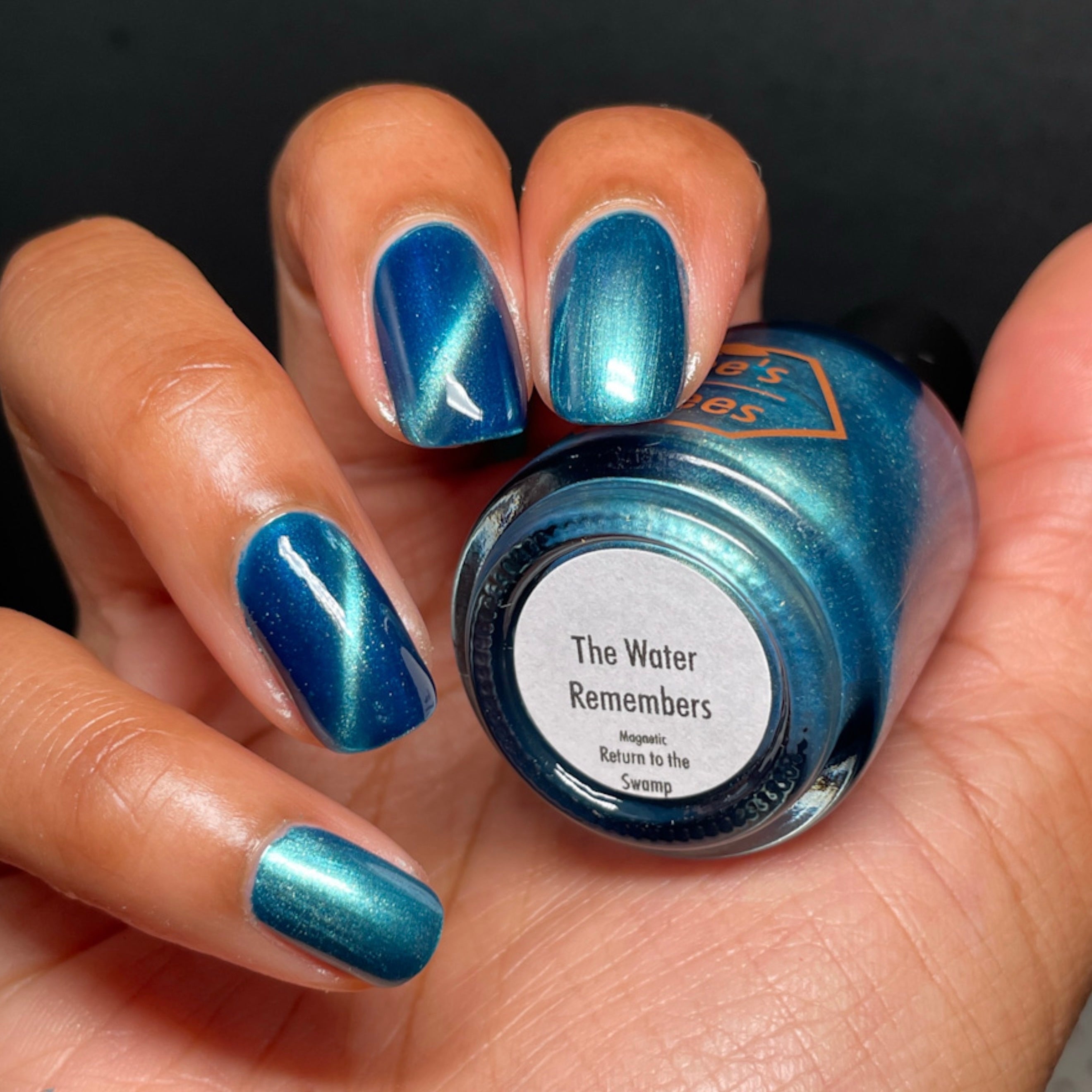 The Water Remembers - a mid-toned cerulean Bog Dweller Sibling with silver magnetic shimmer that turns sky blue in the cerulean base.