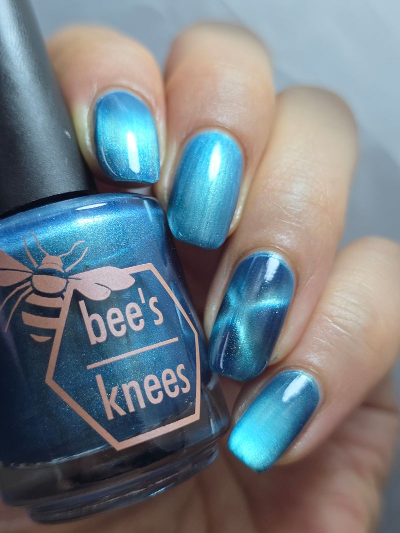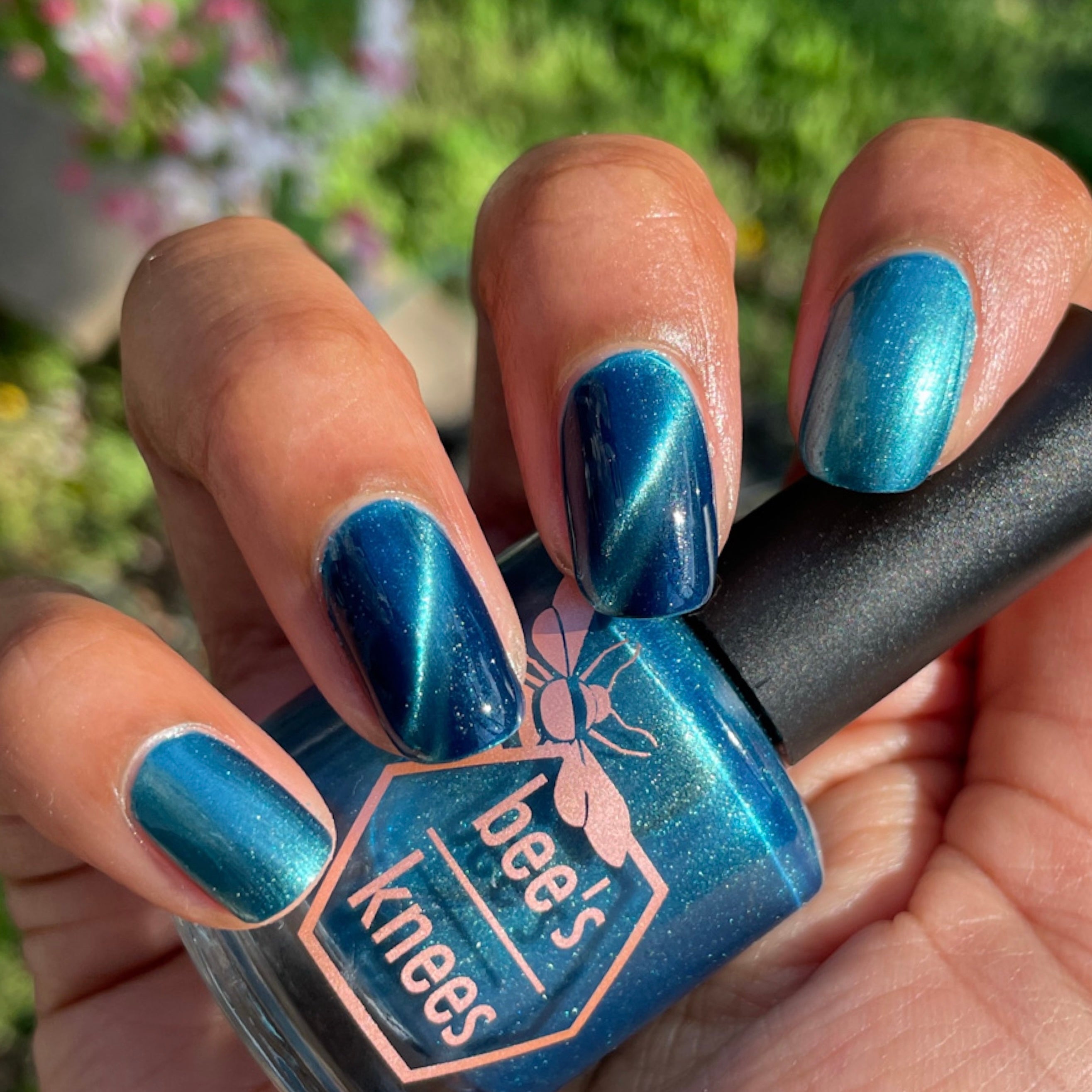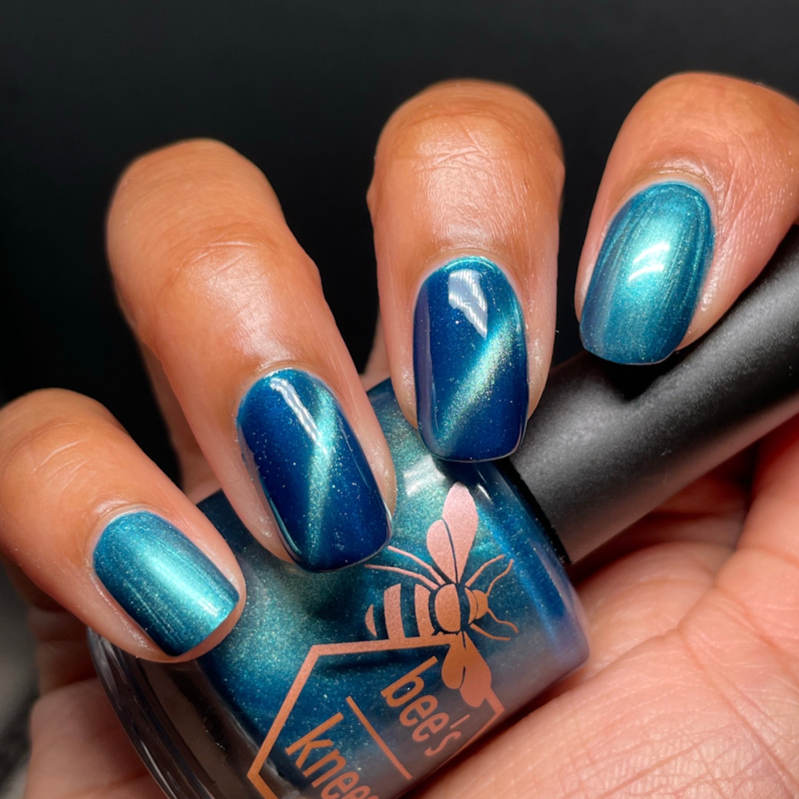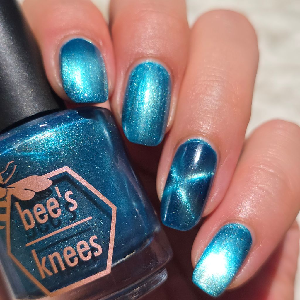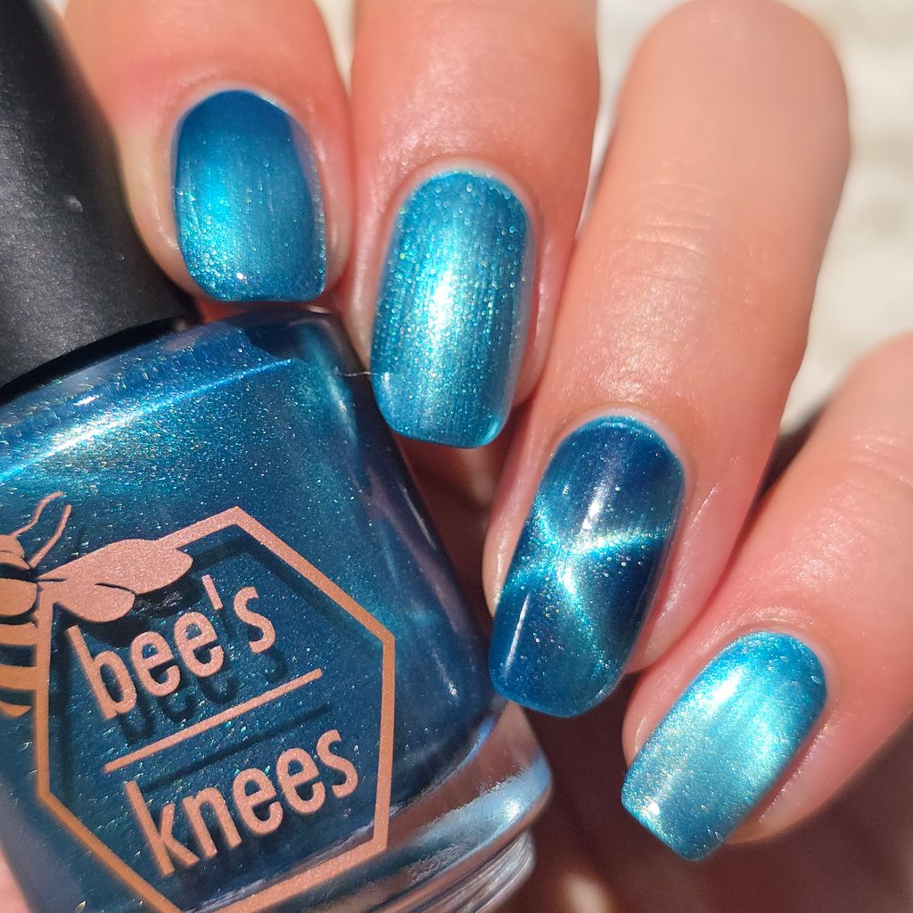 The Water Remembers - a mid-toned cerulean Bog Dweller Sibling with silver magnetic shimmer that turns sky blue in the cerulean base.