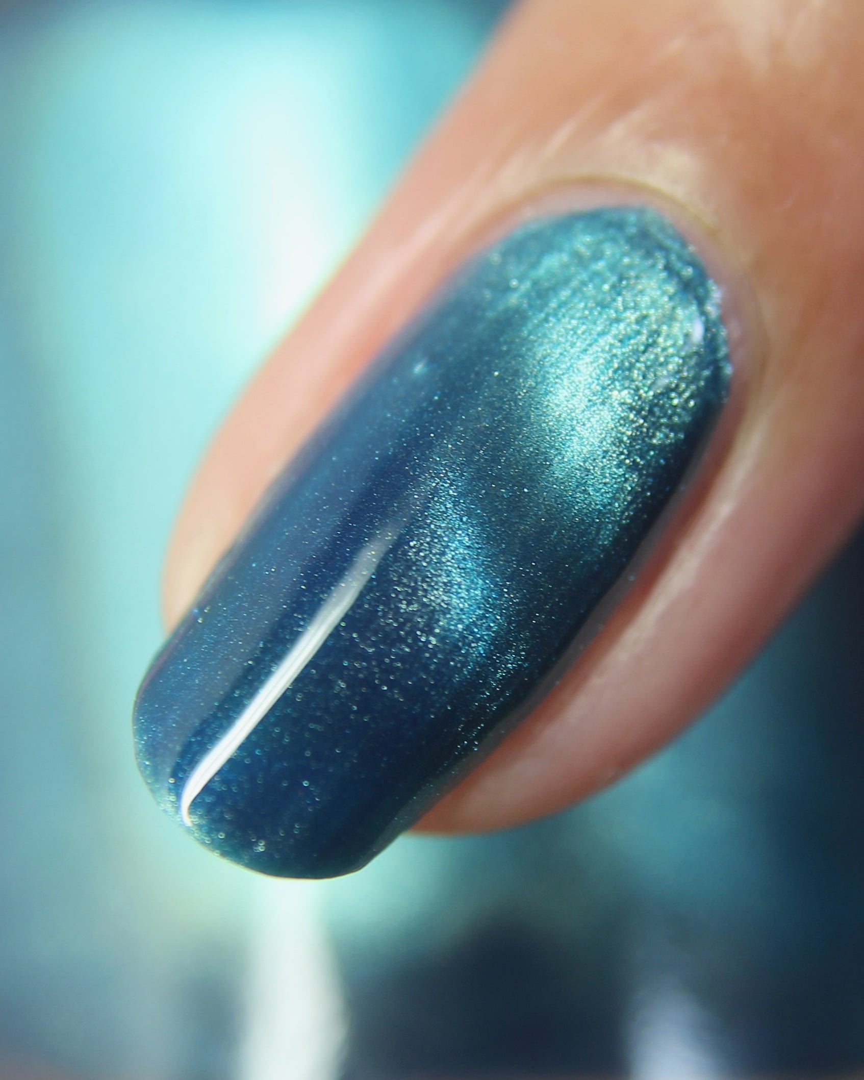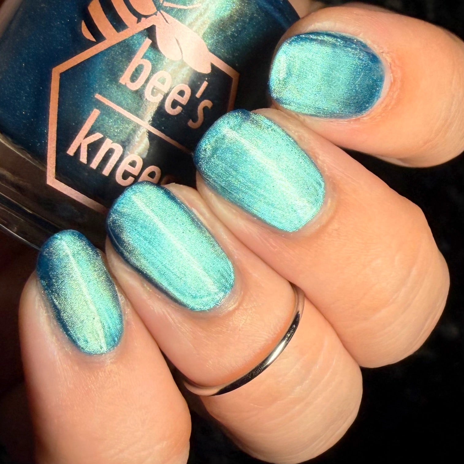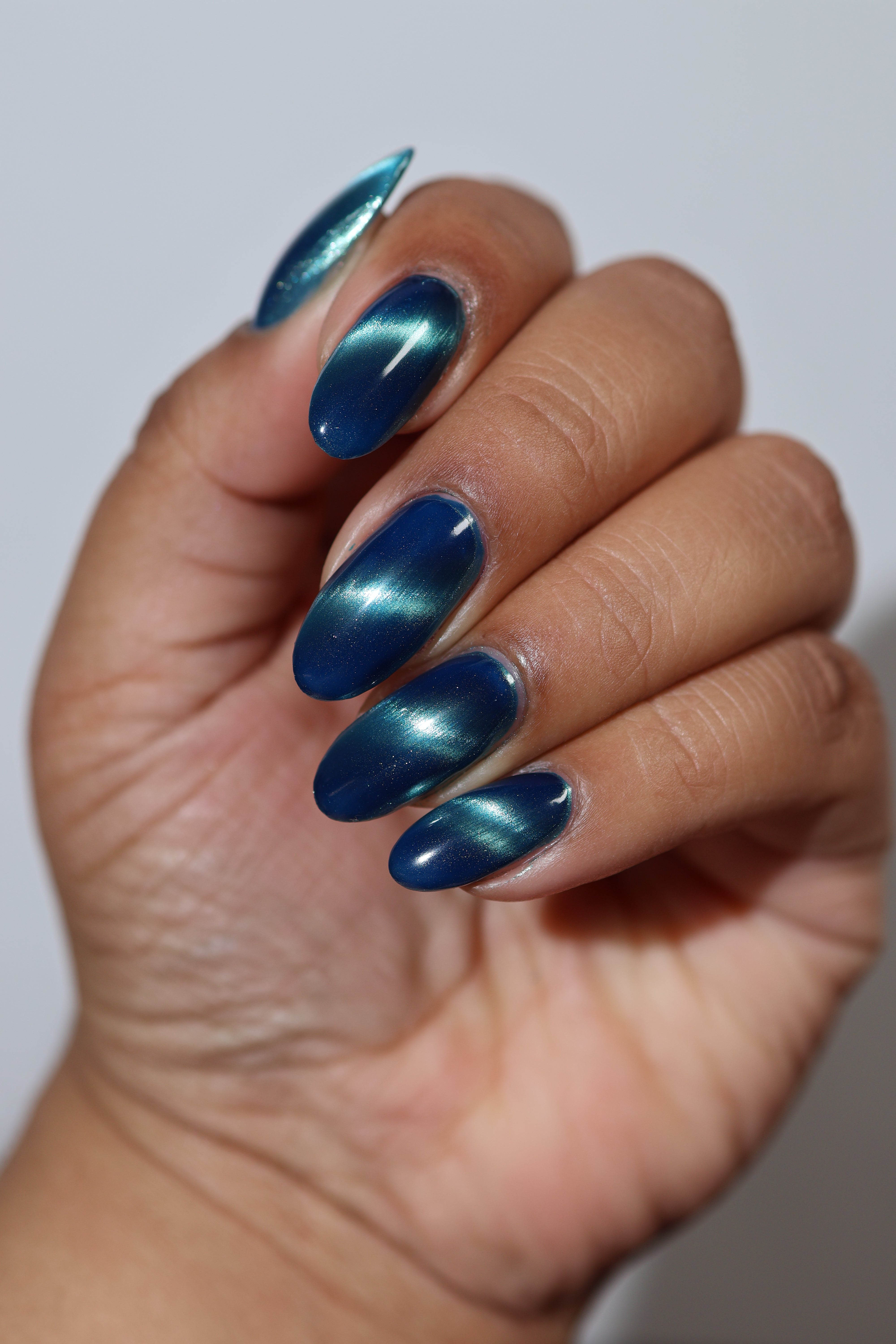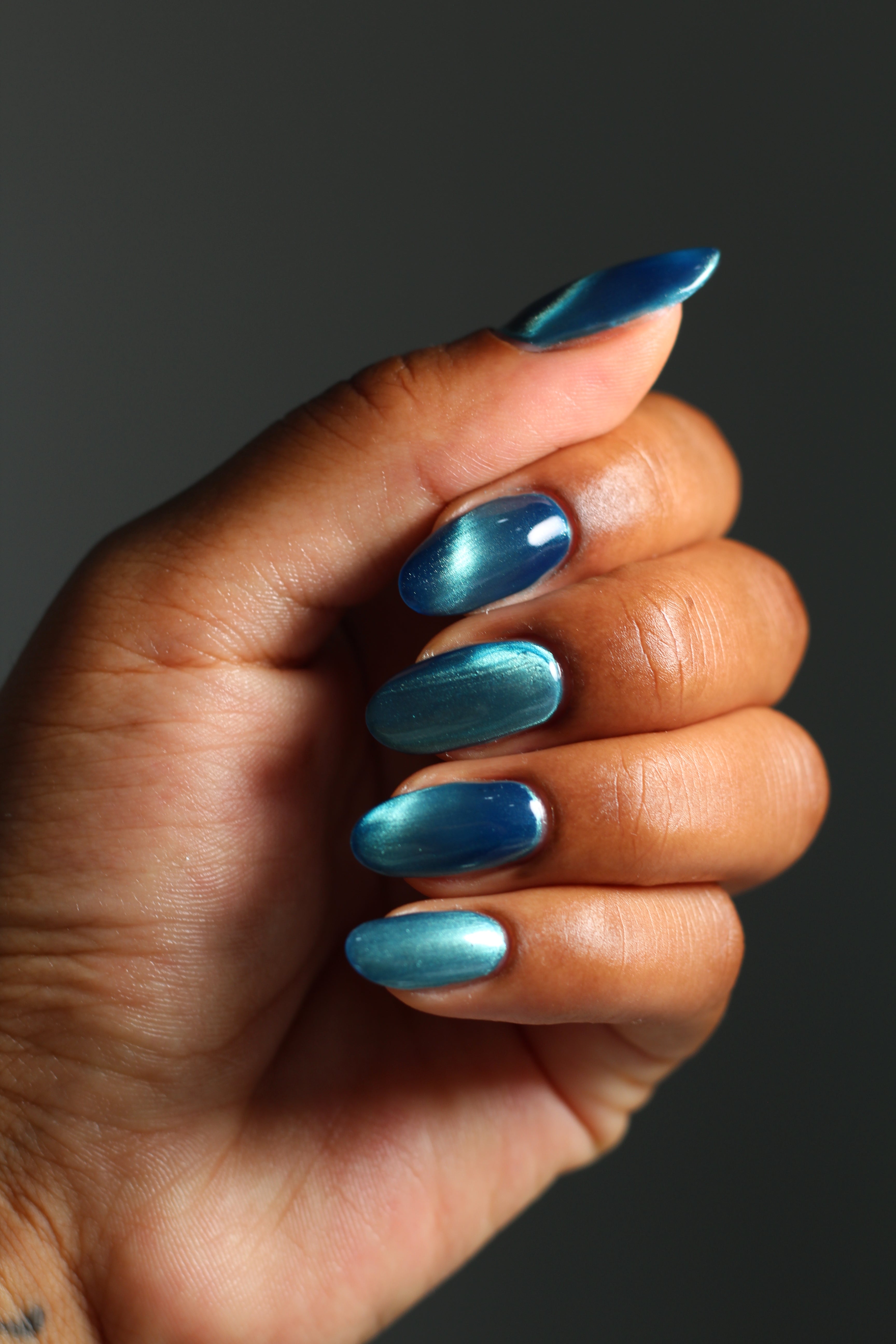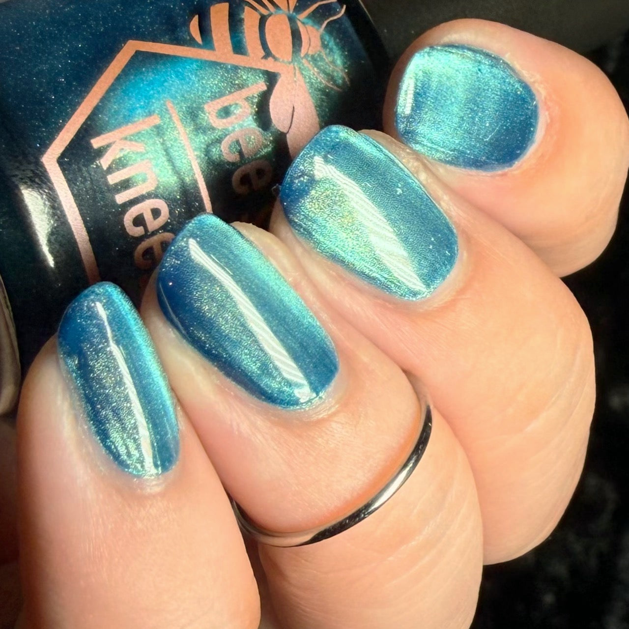 The Water Remembers - a mid-toned cerulean Bog Dweller Sibling with silver magnetic shimmer that turns sky blue in the cerulean base.