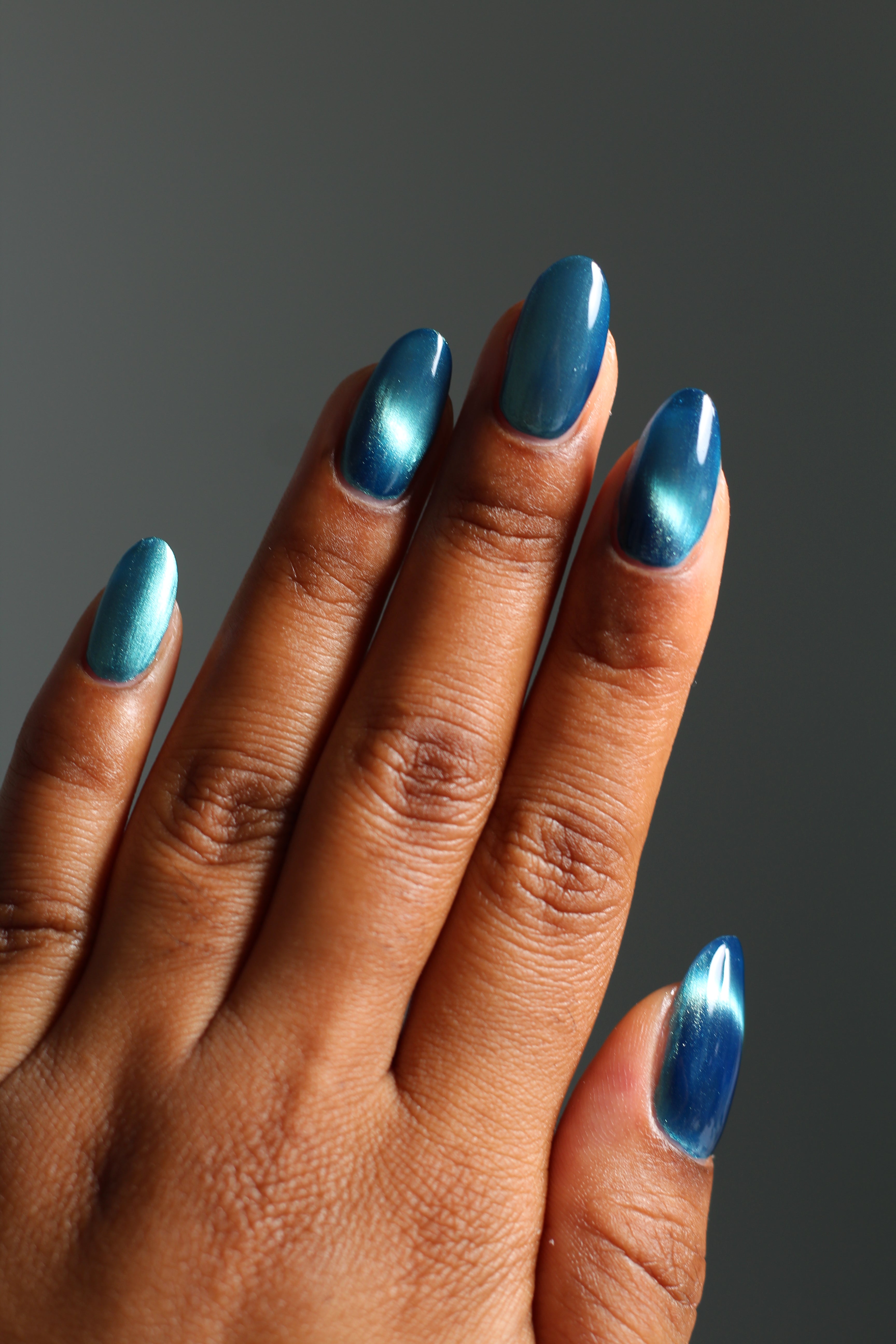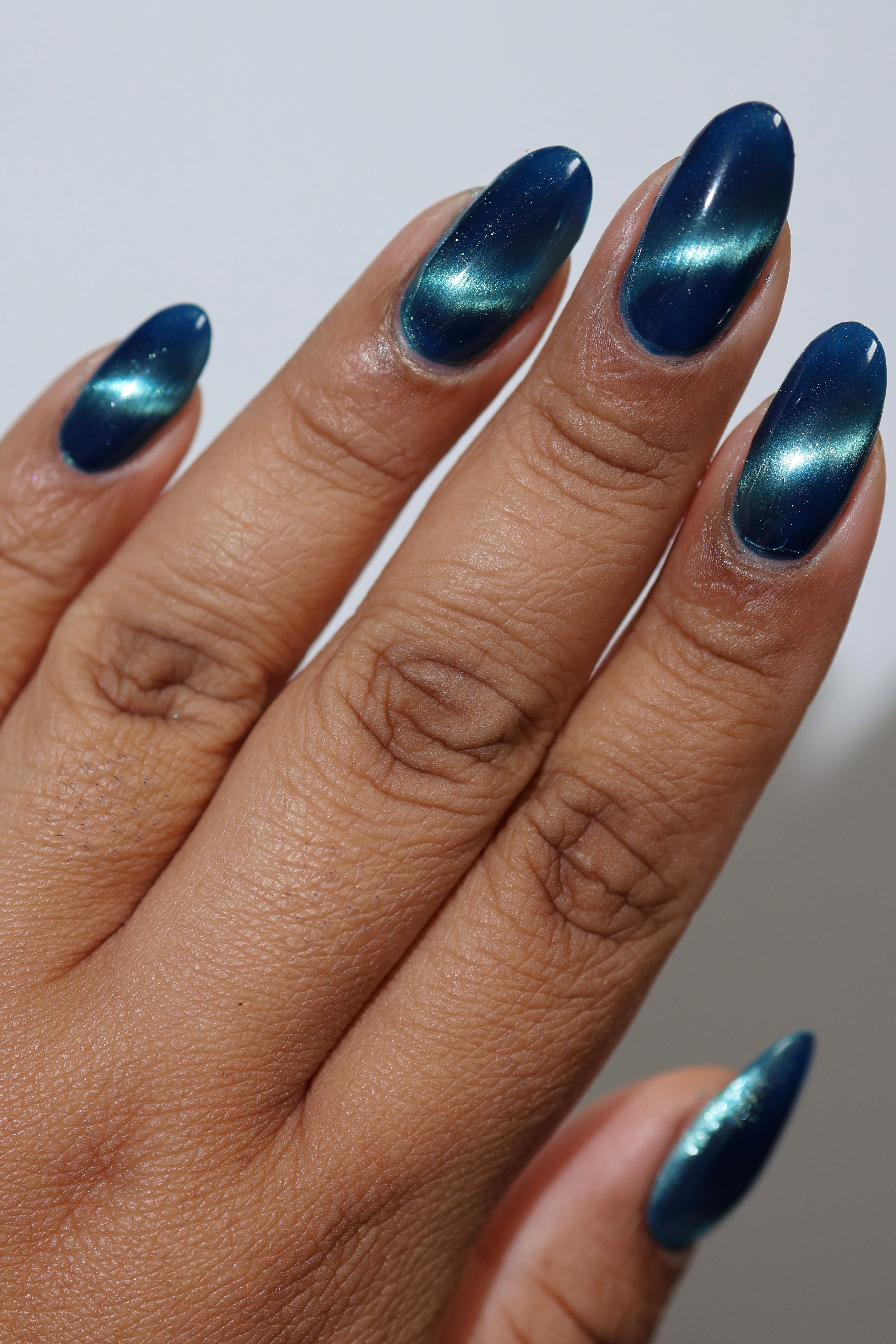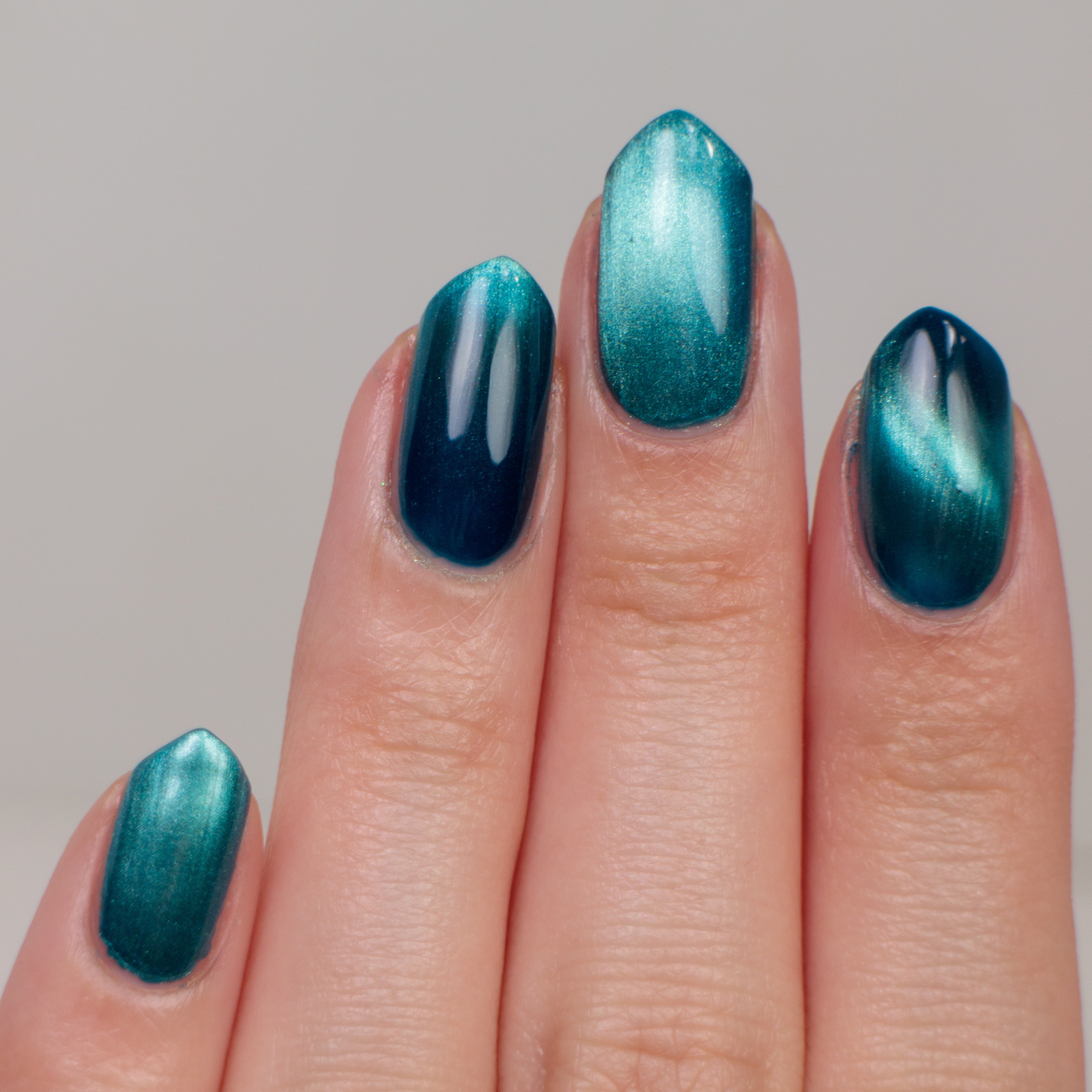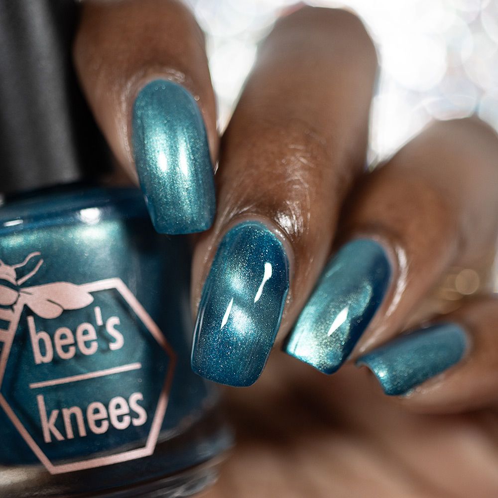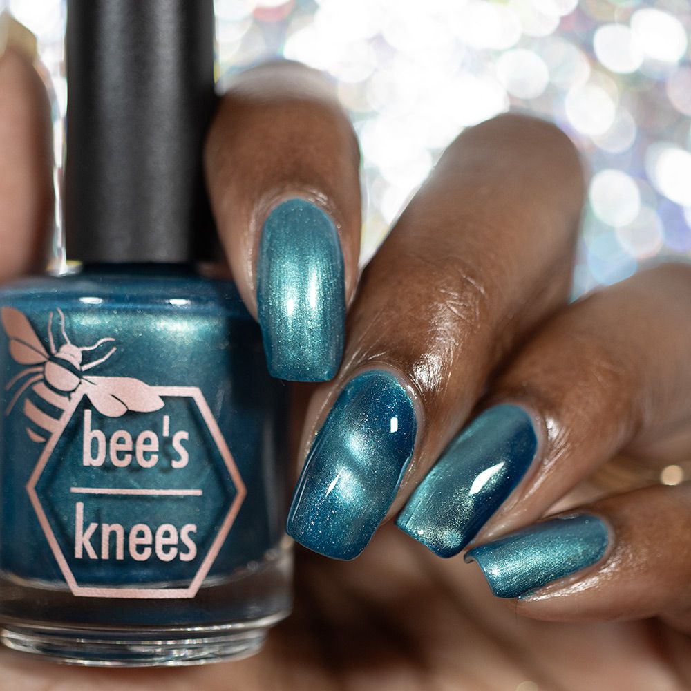 The Water Remembers - a mid-toned cerulean Bog Dweller Sibling with silver magnetic shimmer that turns sky blue in the cerulean base.