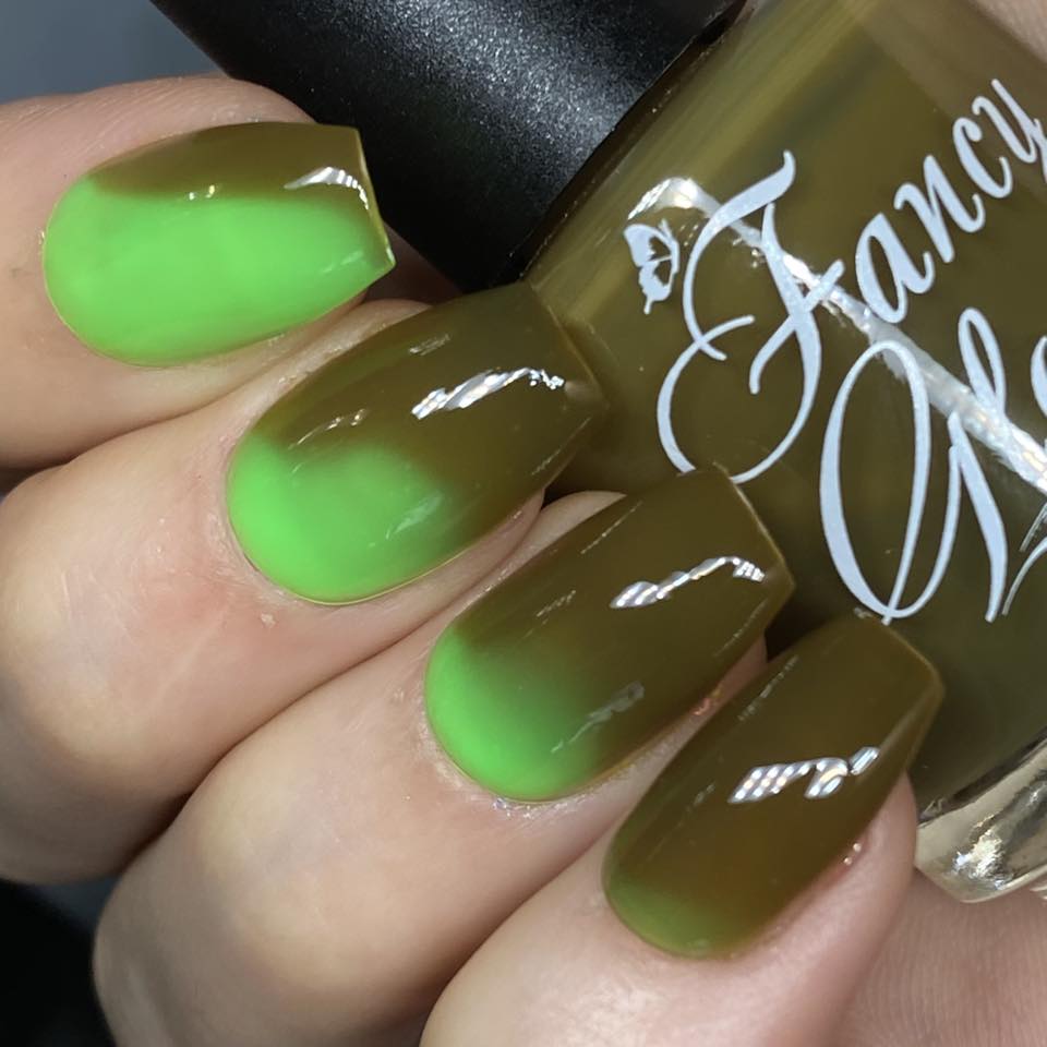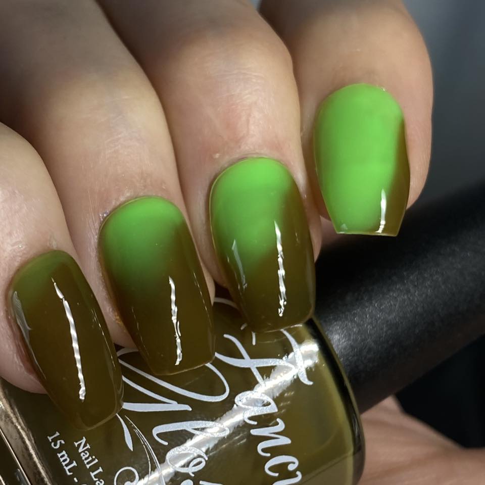 Mossy green (cold) to bright green (warm) creme. 3 coats were applied on the swatches.