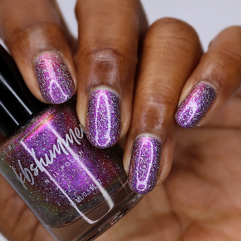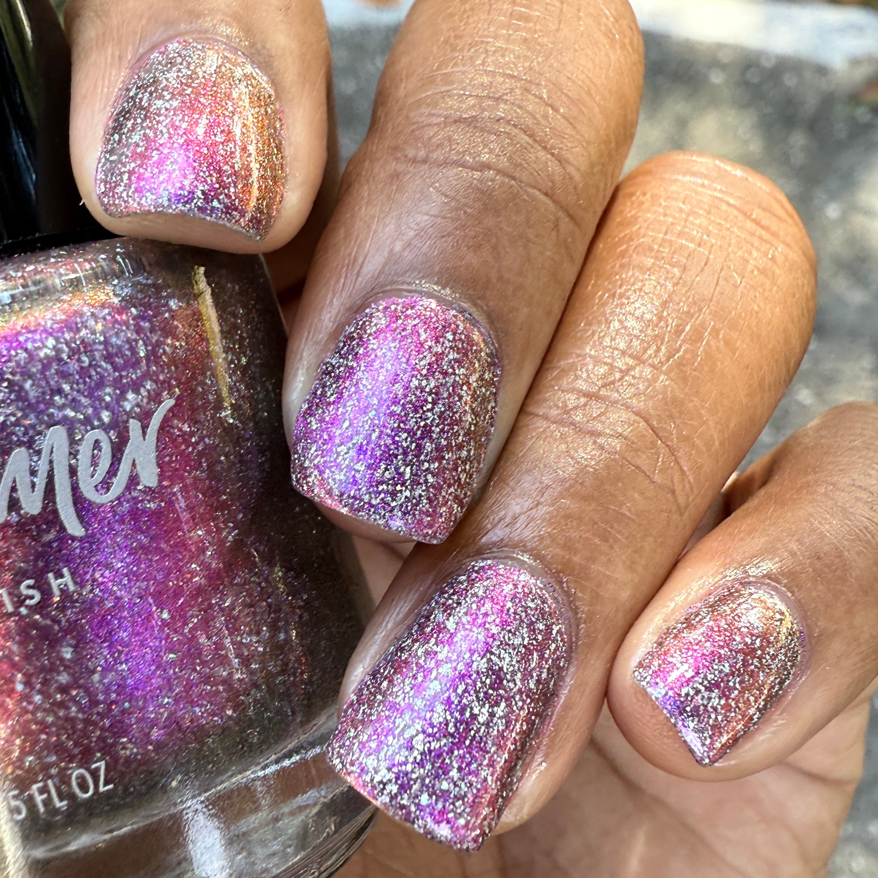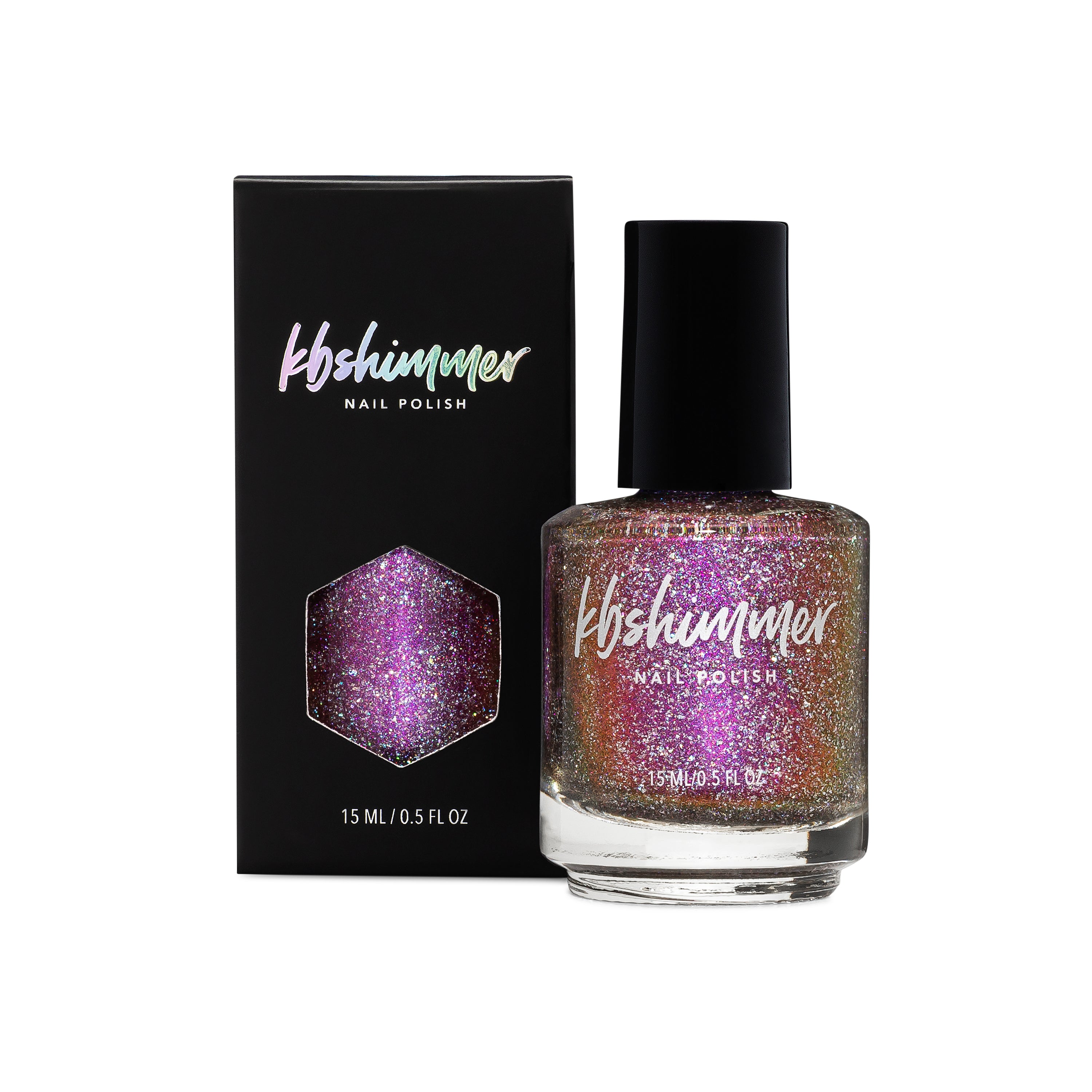 Yarned and Dangerous is a twinkling multichrome nail polish. Warm hues of magenta, copper, and eggplant shift into cooler violet and pink tones. Glistening holo glow flakes add a touch of sparkle and whimsy, with rainbow flair in bright light. Two coats offer ample coverage for most nail lengths. Follow with a coat of Clearly On Top to extend the life of your manicure and add shine.