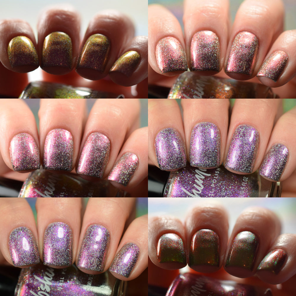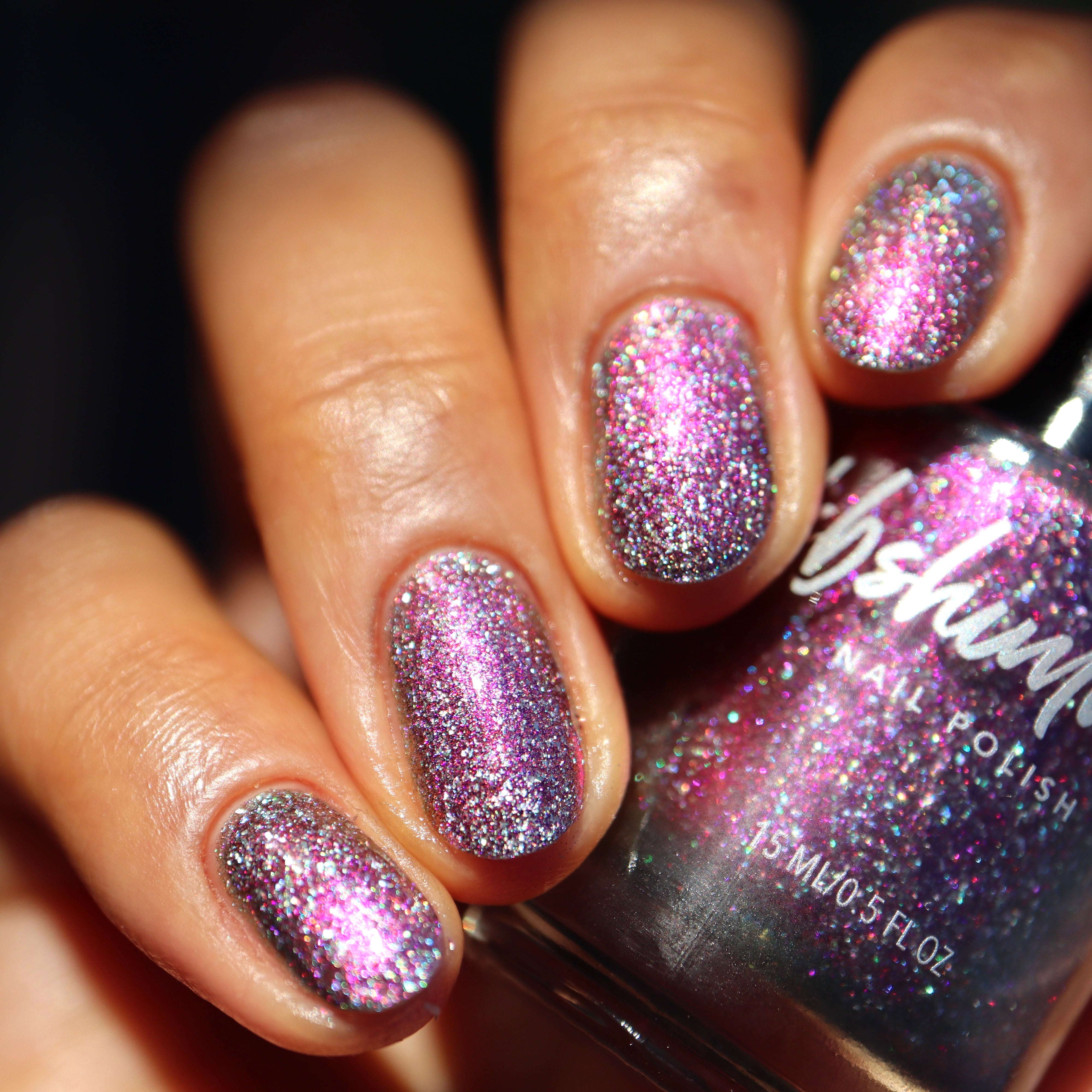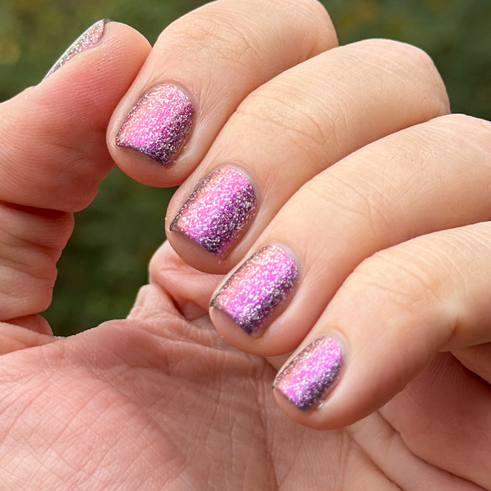 Yarned and Dangerous is a twinkling multichrome nail polish. Warm hues of magenta, copper, and eggplant shift into cooler violet and pink tones. Glistening holo glow flakes add a touch of sparkle and whimsy, with rainbow flair in bright light. Two coats offer ample coverage for most nail lengths. Follow with a coat of Clearly On Top to extend the life of your manicure and add shine.