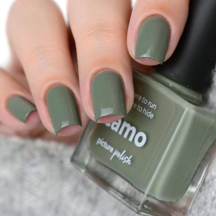 Camo is a khaki green creme nail color and will dry smooth on nails