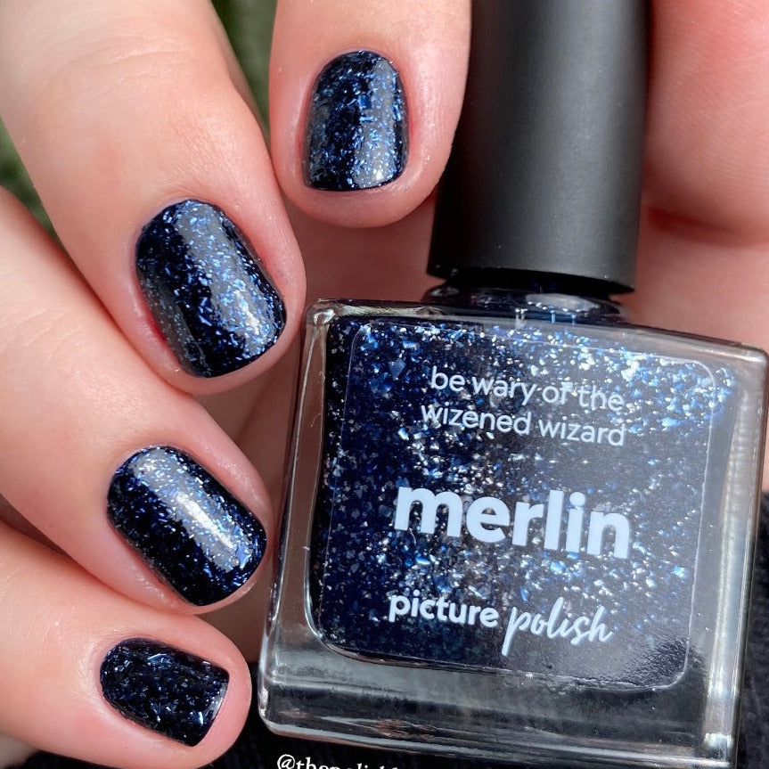 At first, Merlin nail polish’s inky blue base can appear black, but like most magic, looks can be deceiving. In brighter light, the silver flakes reflect a more brilliant blue for a truly sensational mani or pedi.