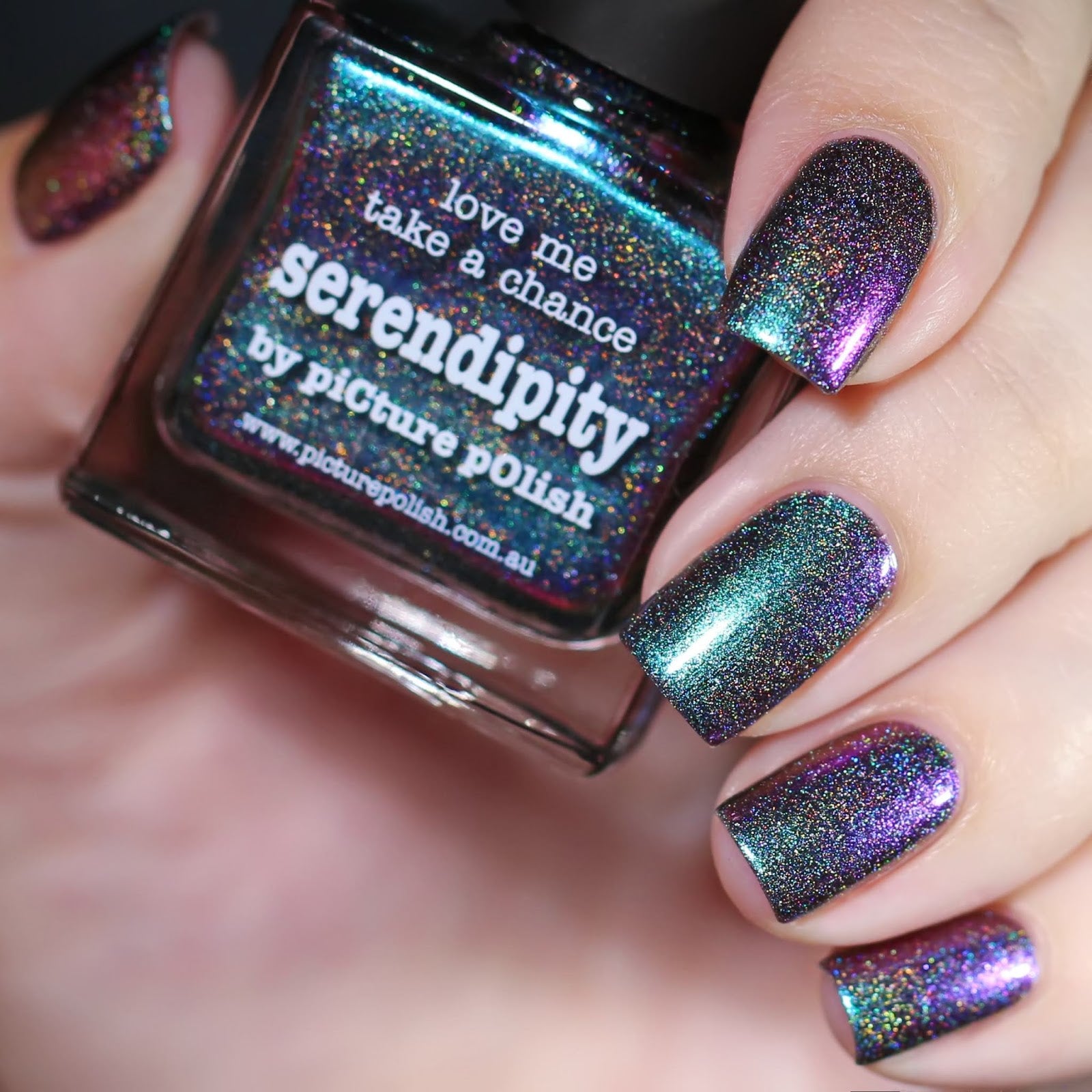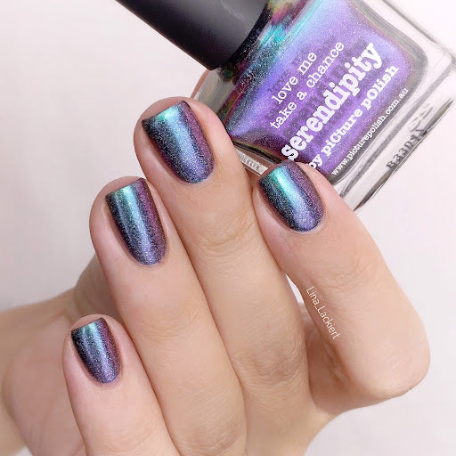 Multi chrome polish take your nails to the next level by combining several colours in a single bottle. Depending on the light and angle, Serendipity nail polish shifts between green, blue, and purple.