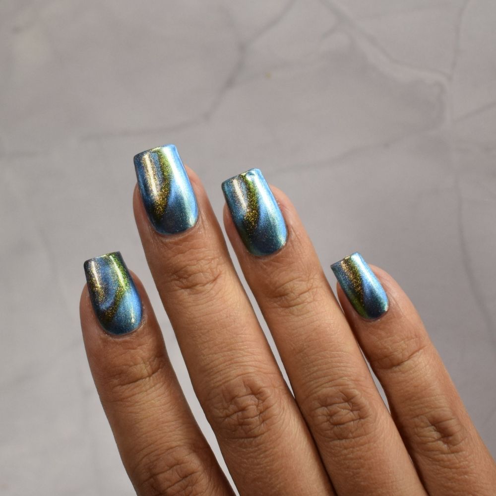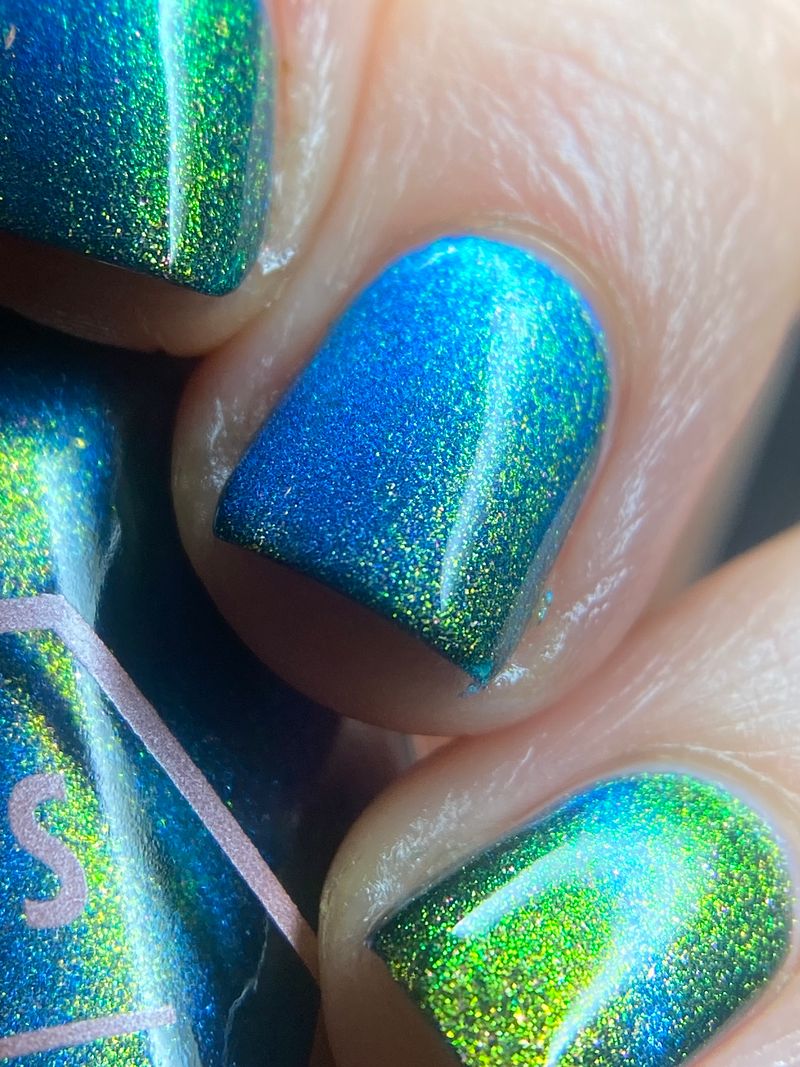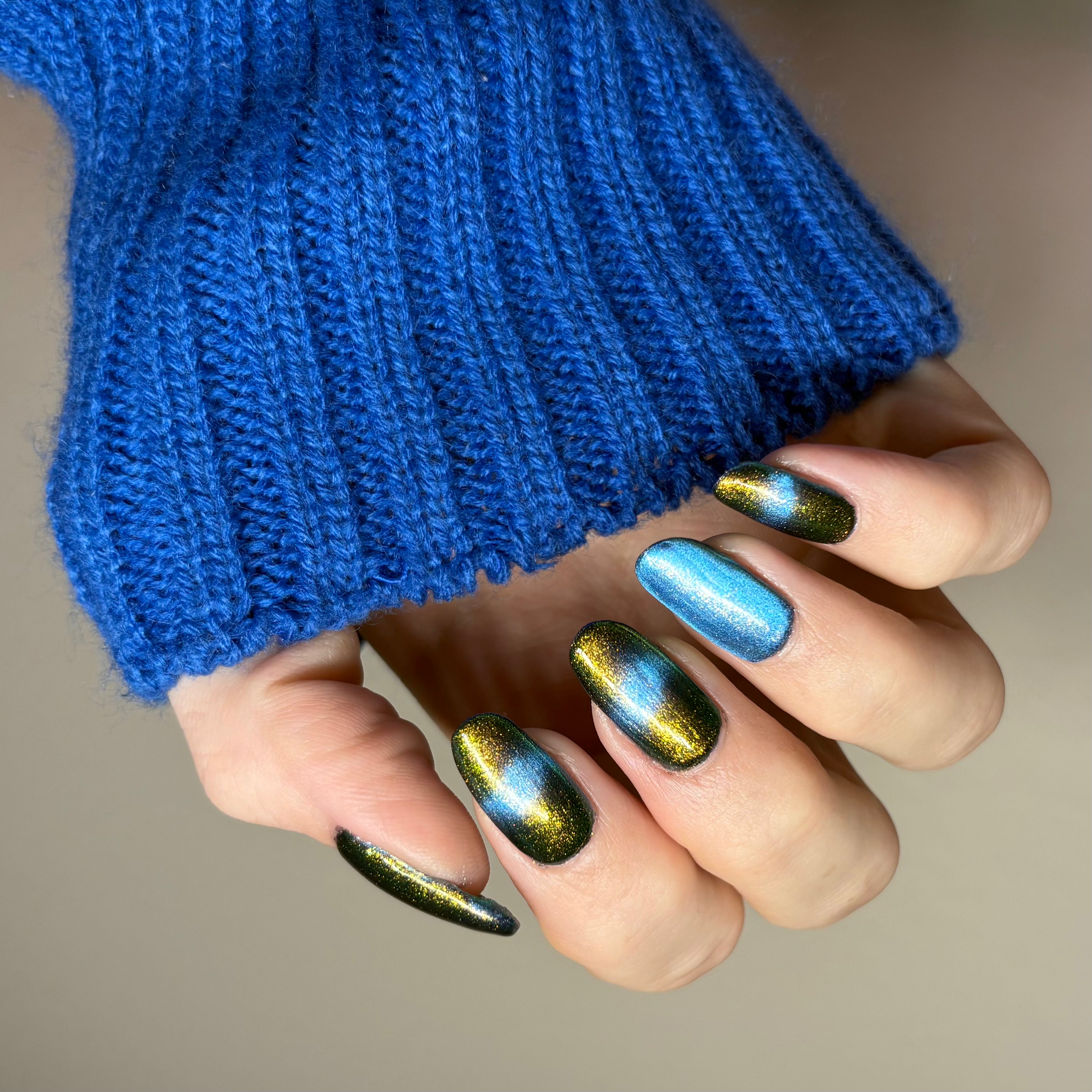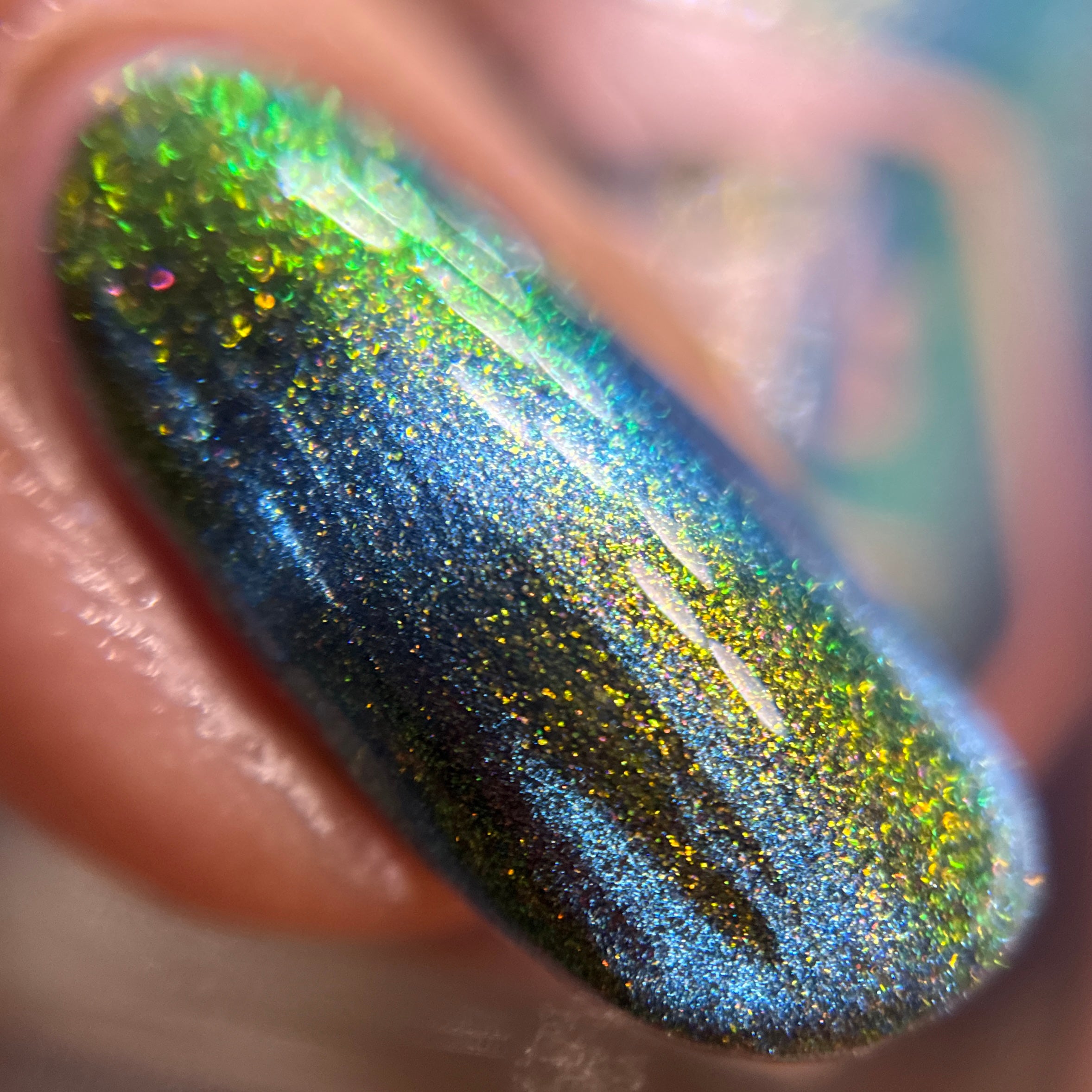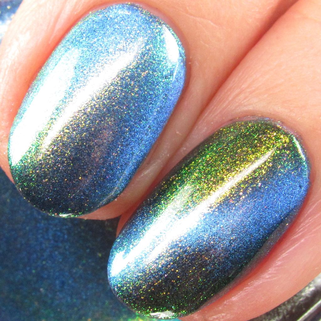 A multichrome nail polish that shifts from bronze to green, to a dark blue. Opaque in 2 - 3 coats depending on your application, top coat recommended for a glossy...