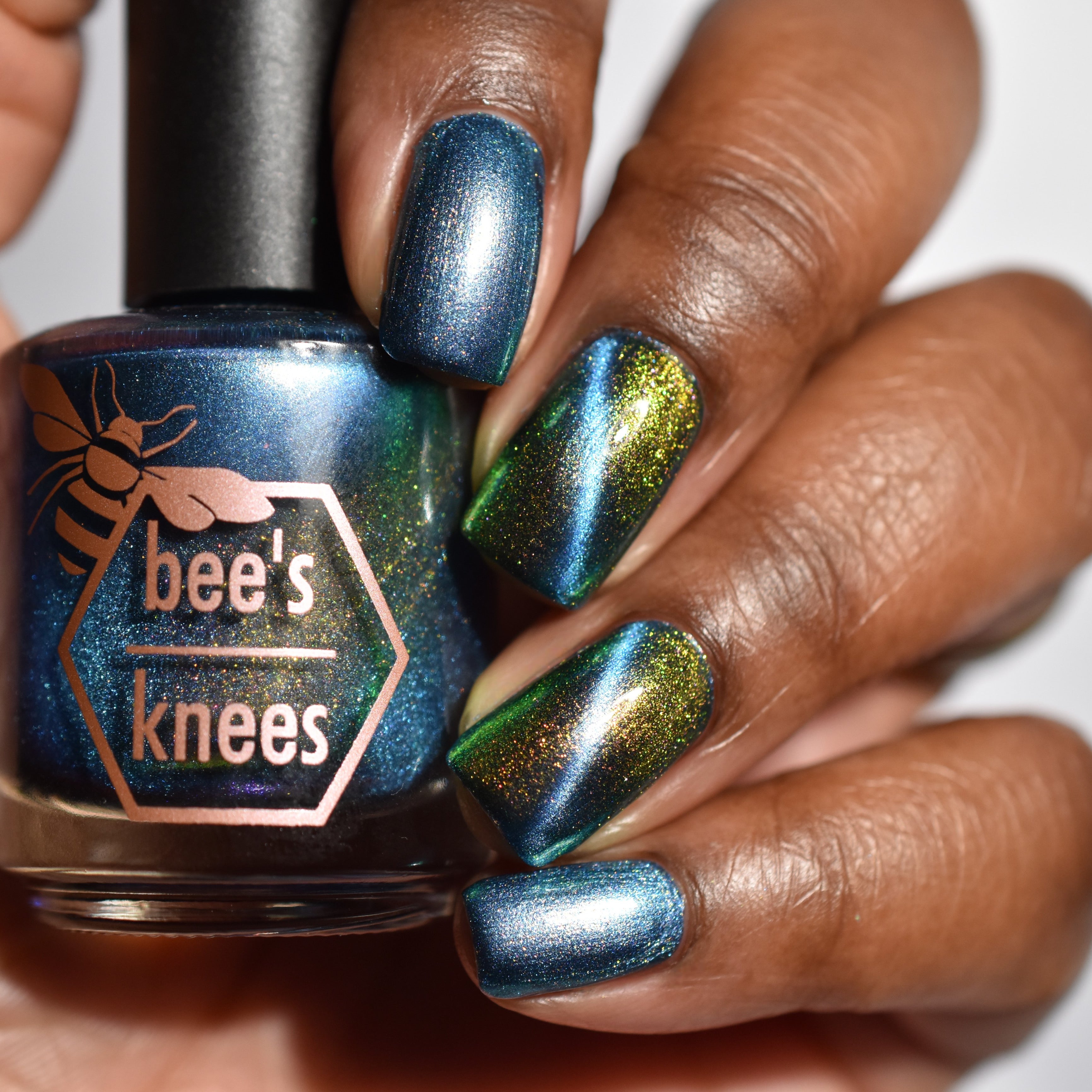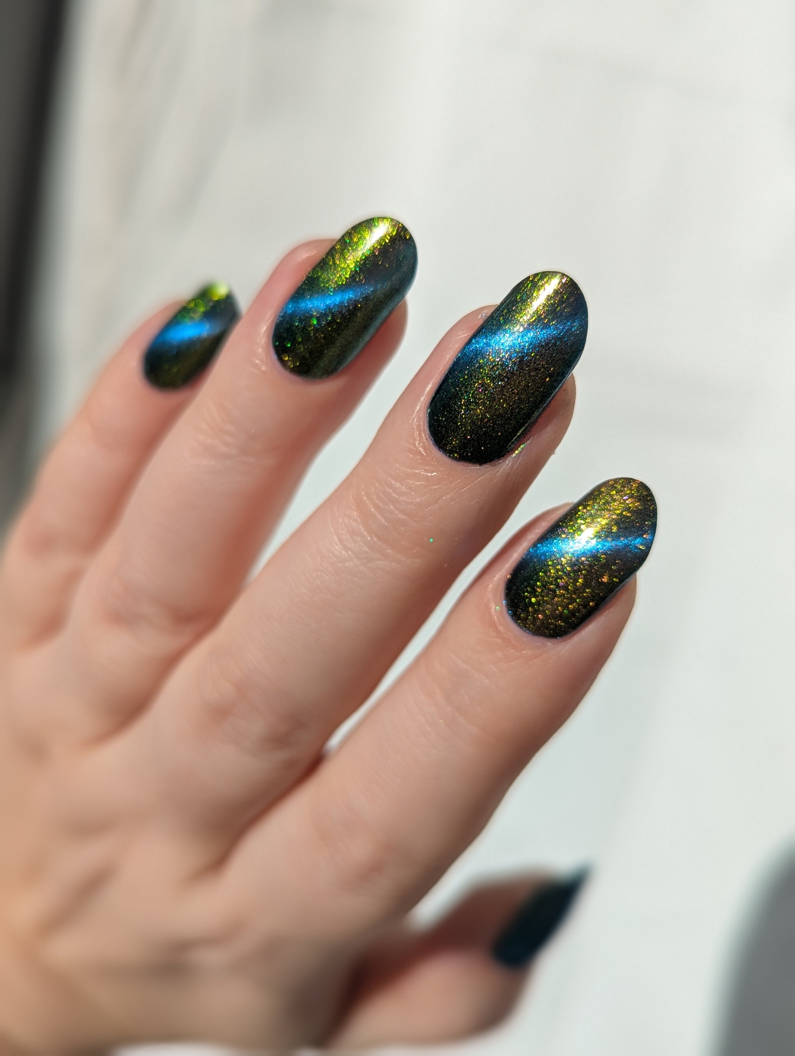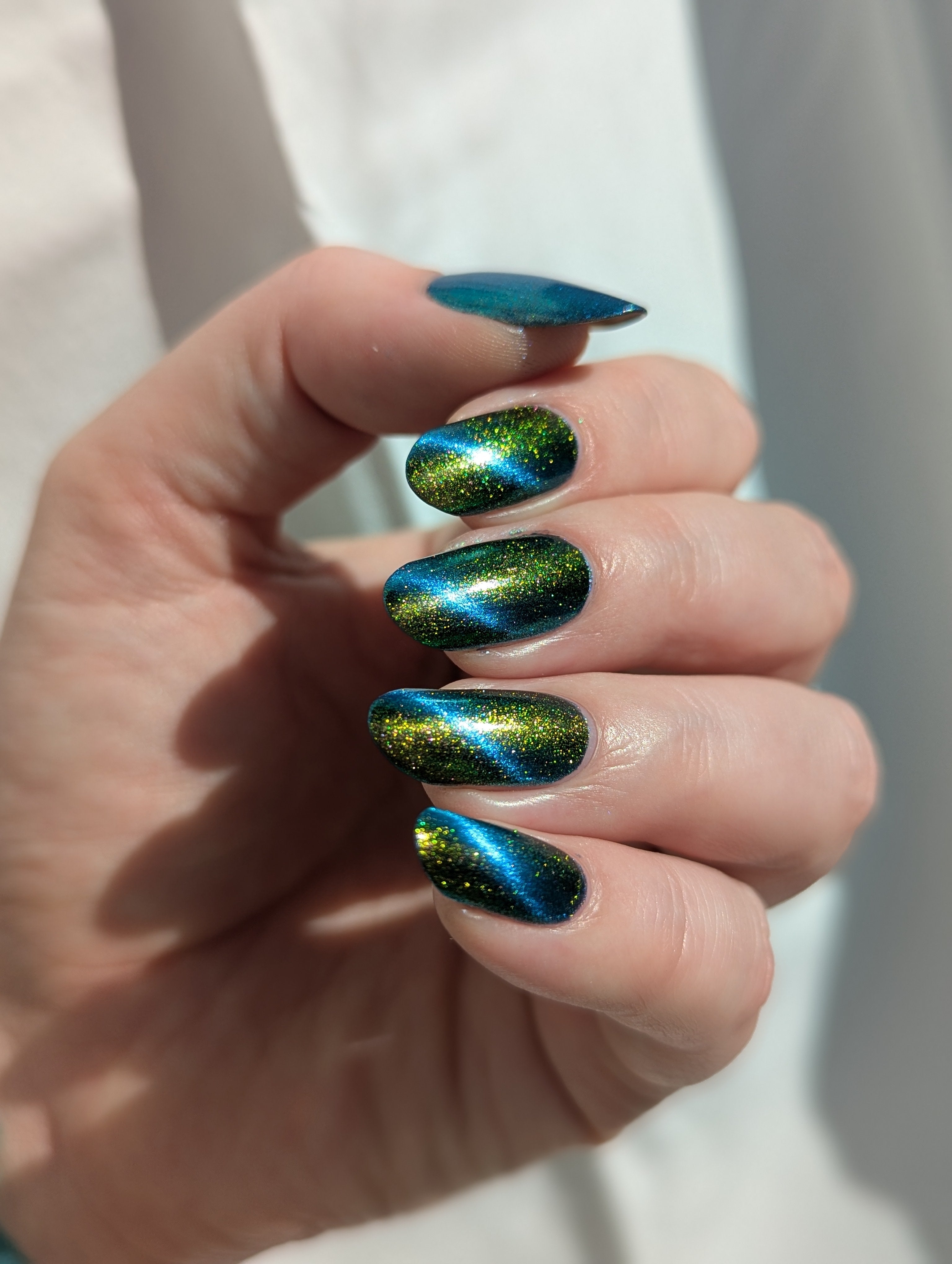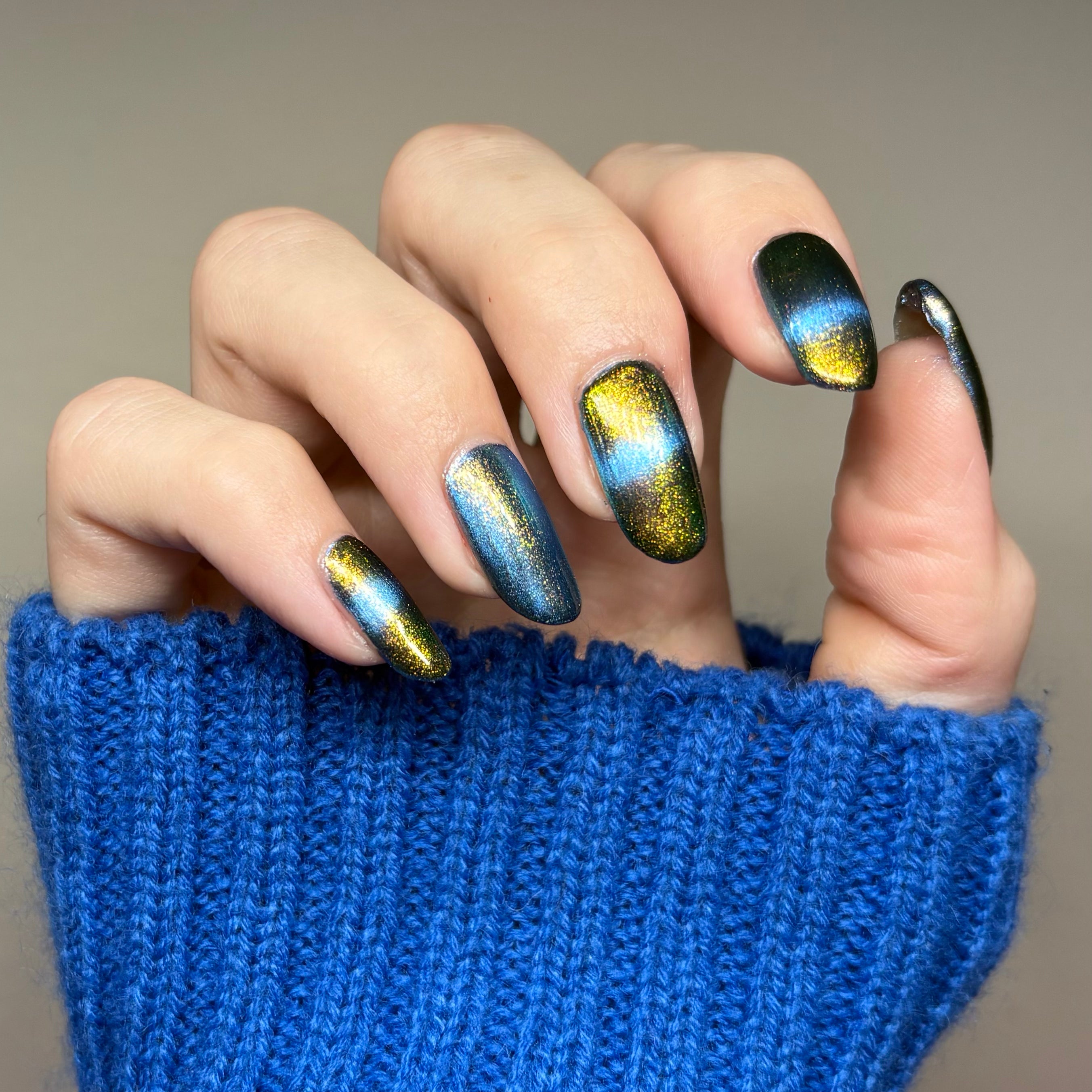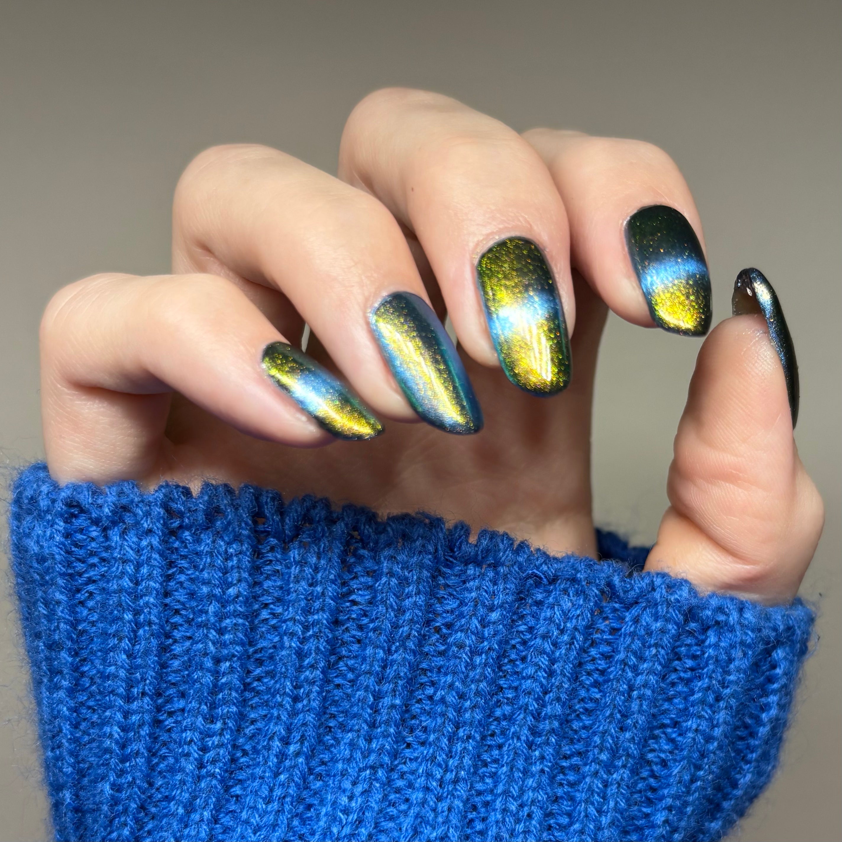 A multichrome nail polish that shifts from bronze to green, to a dark blue. Opaque in 2 - 3 coats depending on your application, top coat recommended for a glossy...