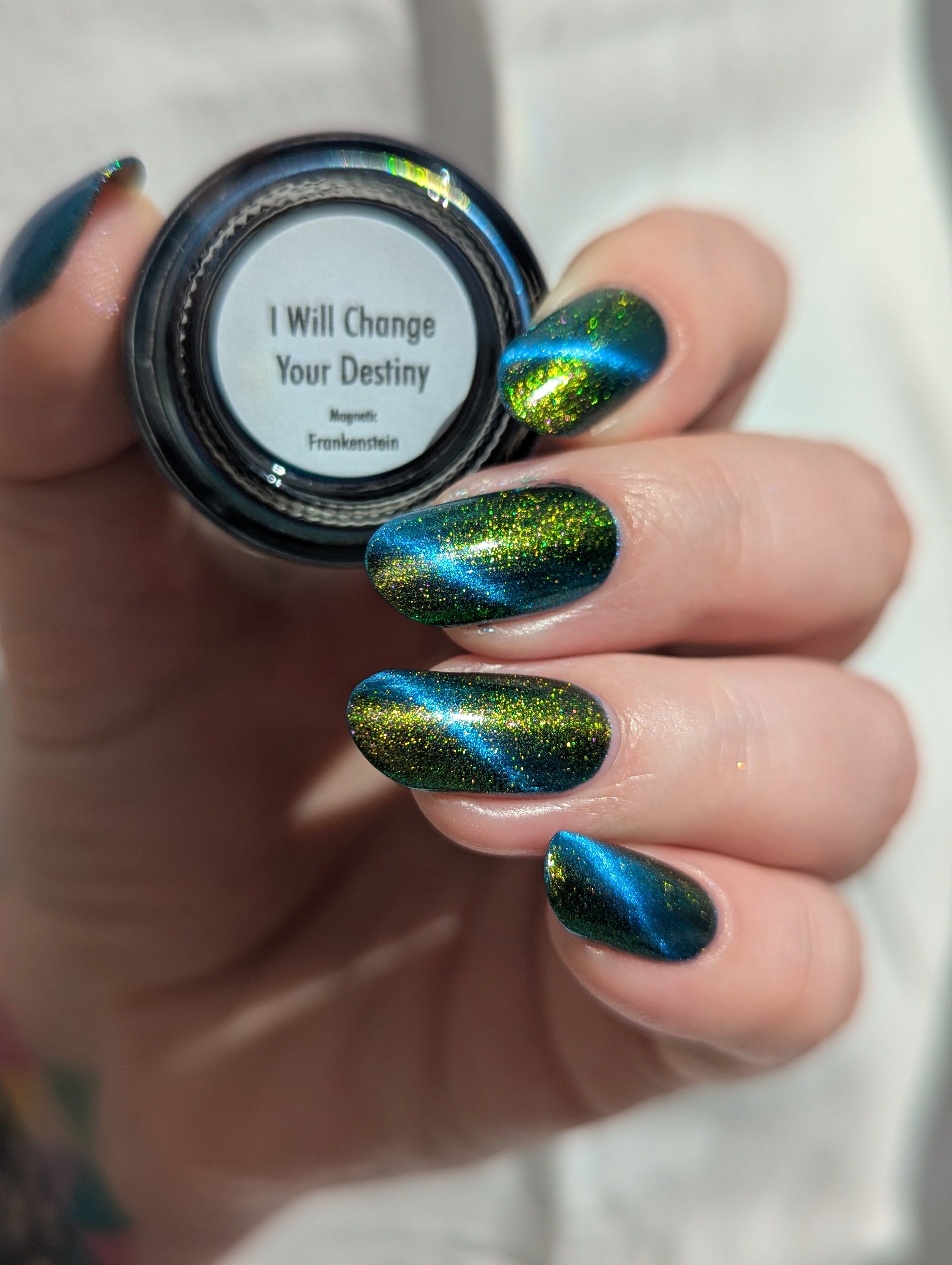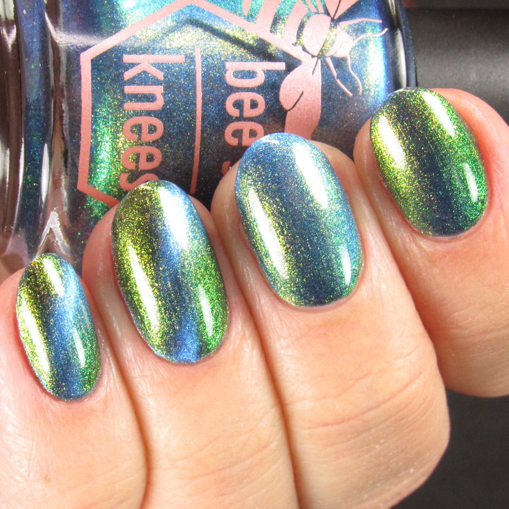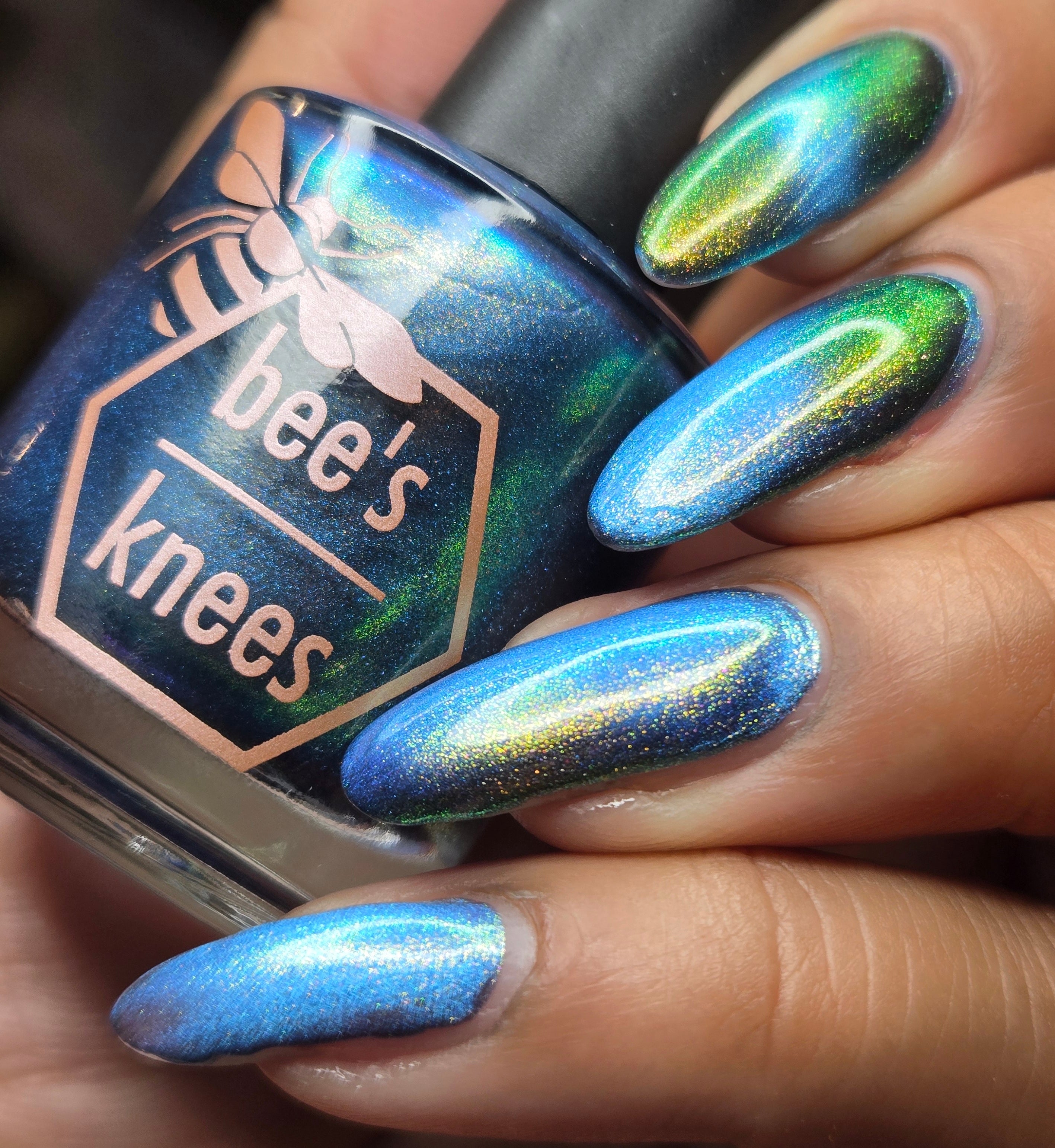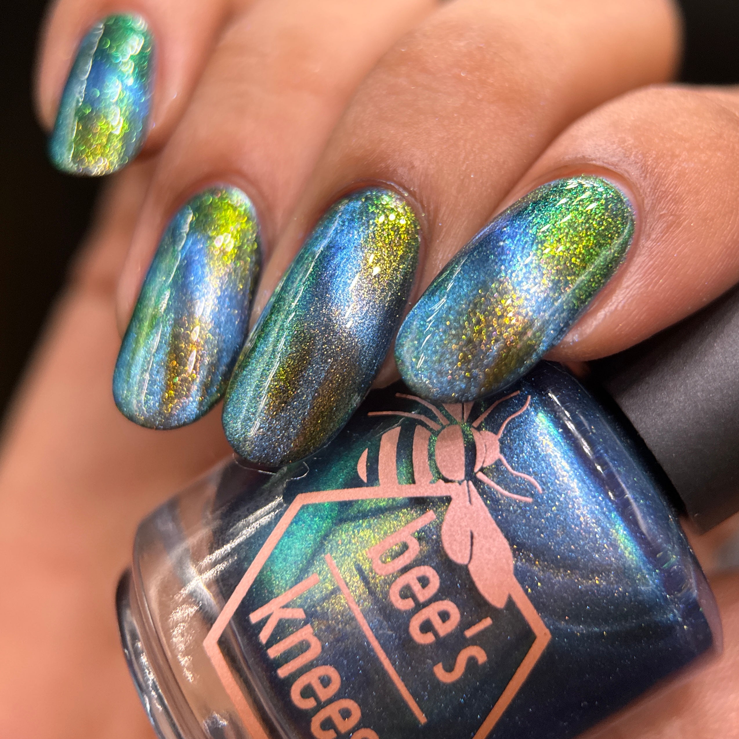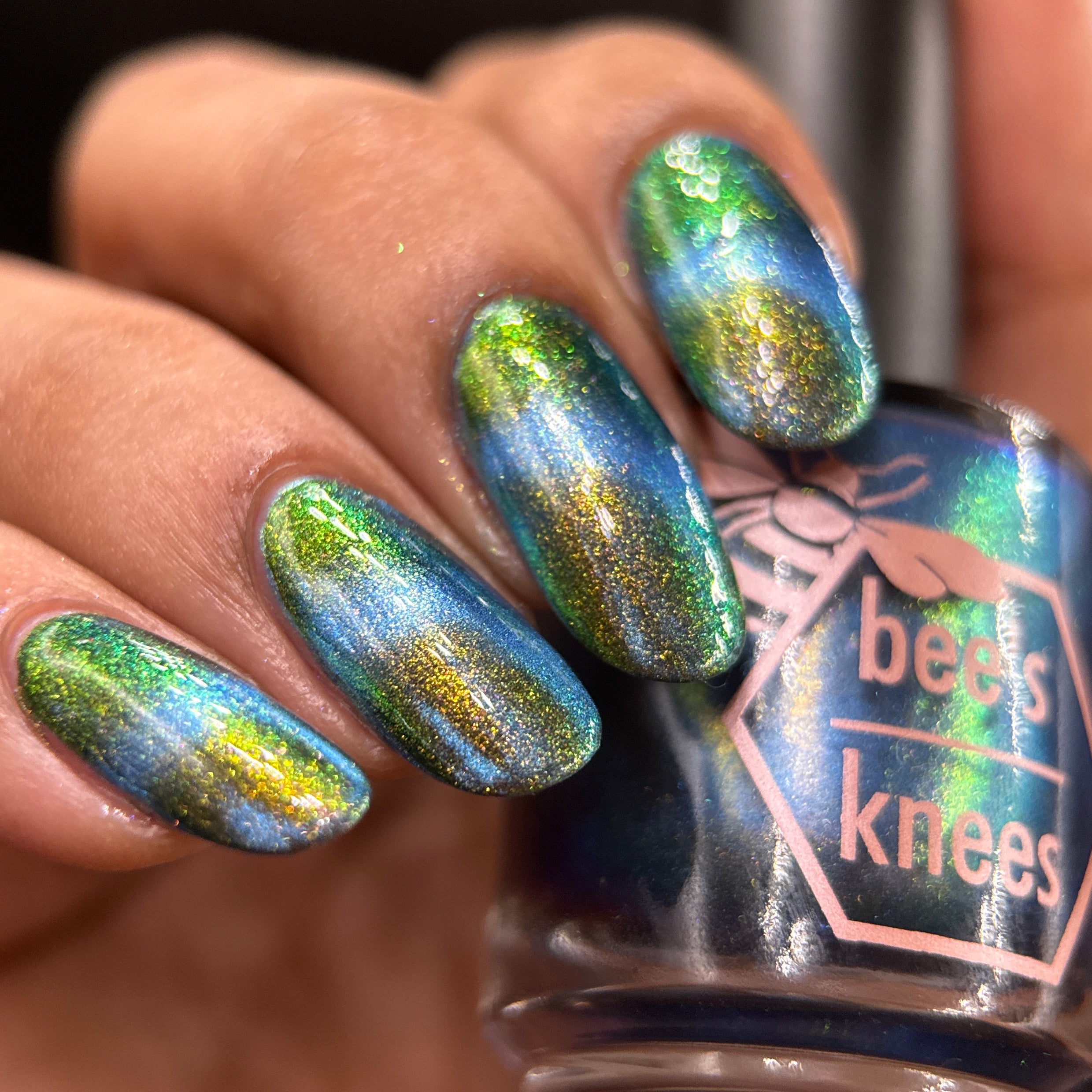 A multichrome nail polish that shifts from bronze to green, to a dark blue. Opaque in 2 - 3 coats depending on your application, top coat recommended for a glossy...