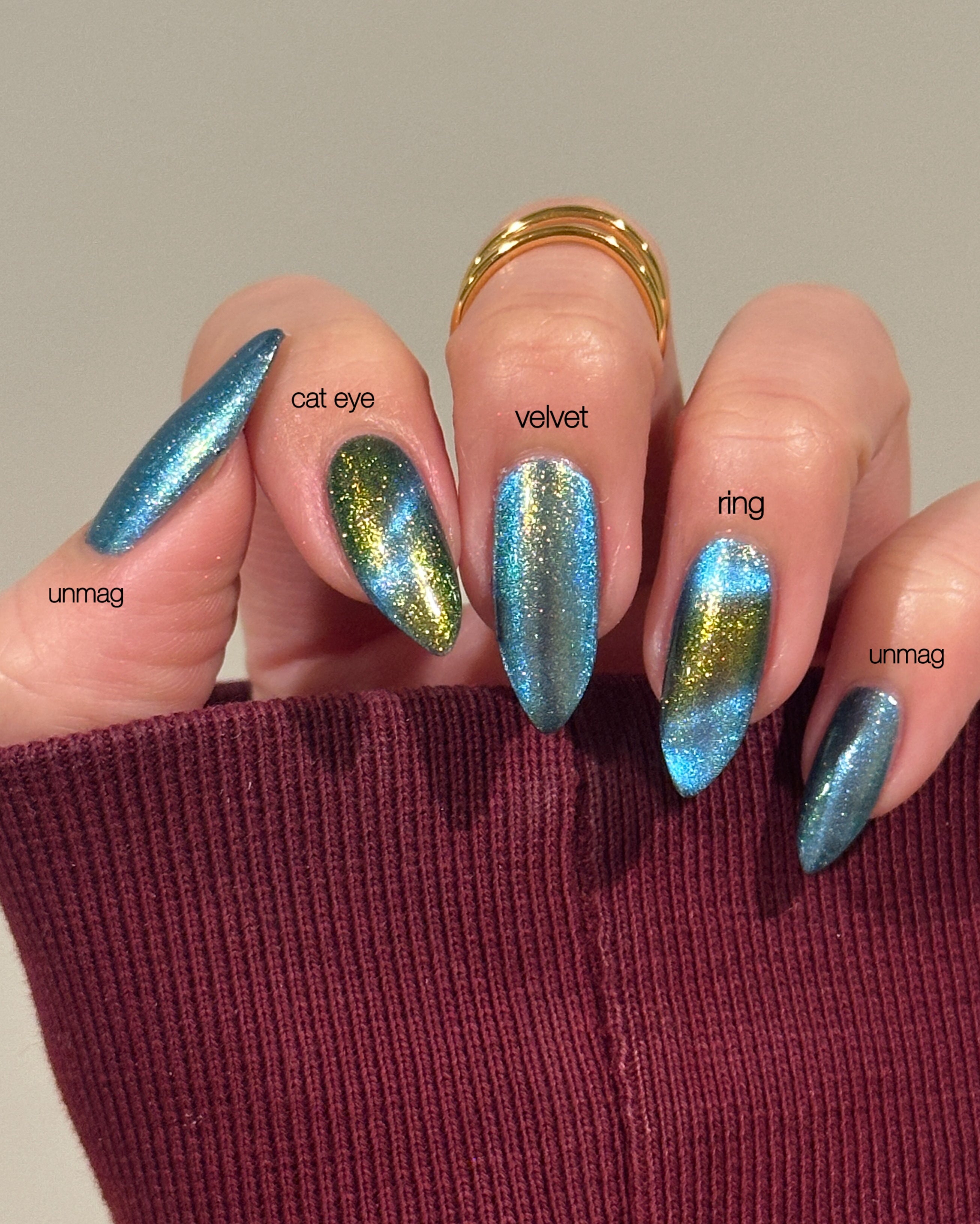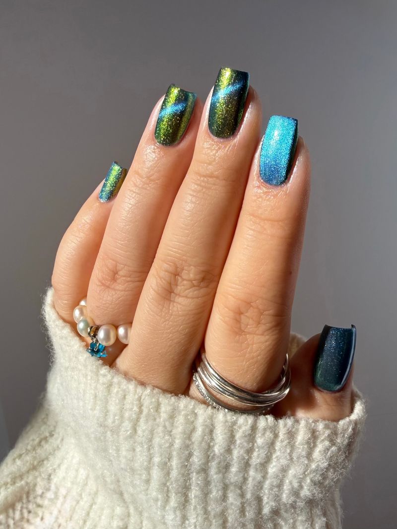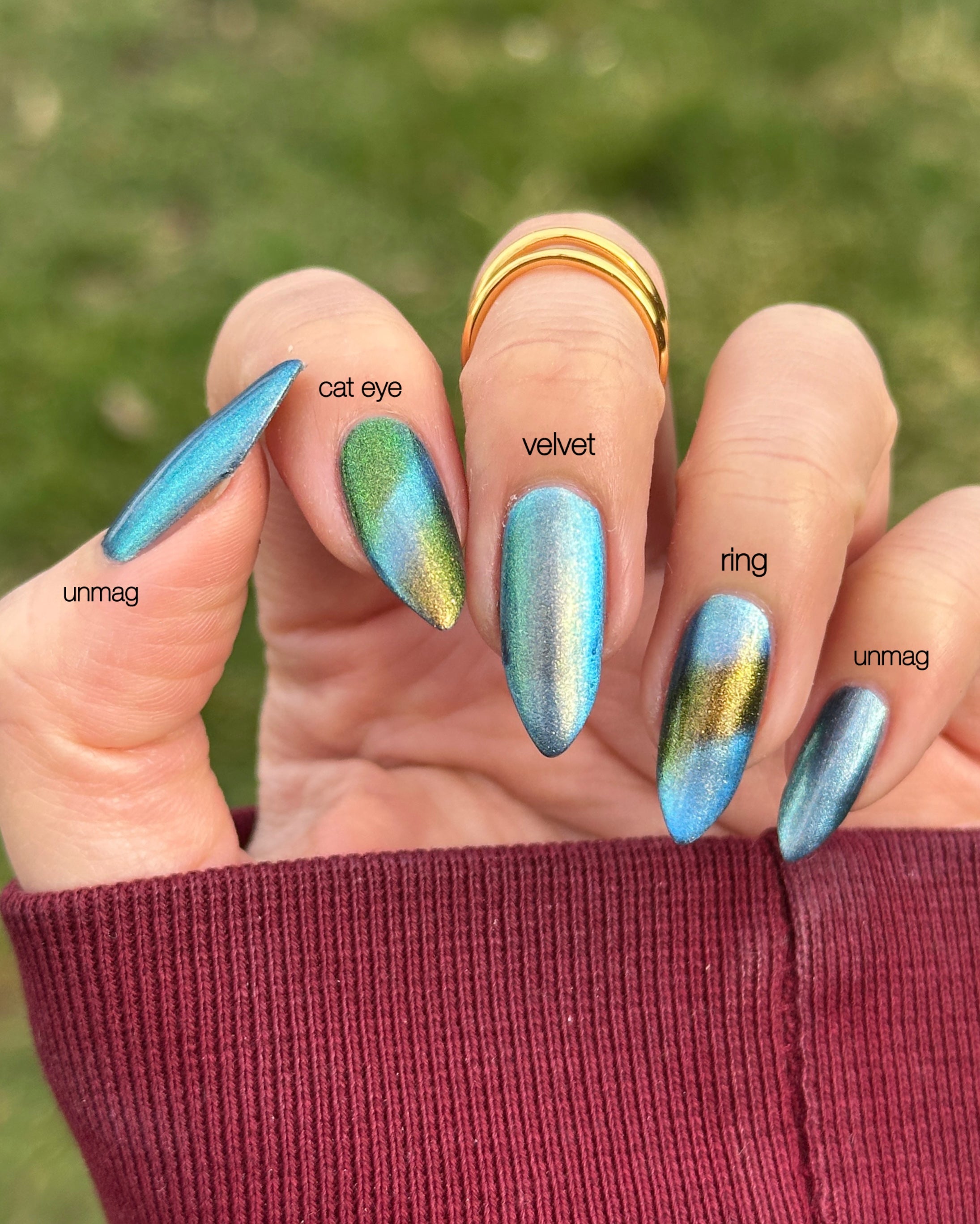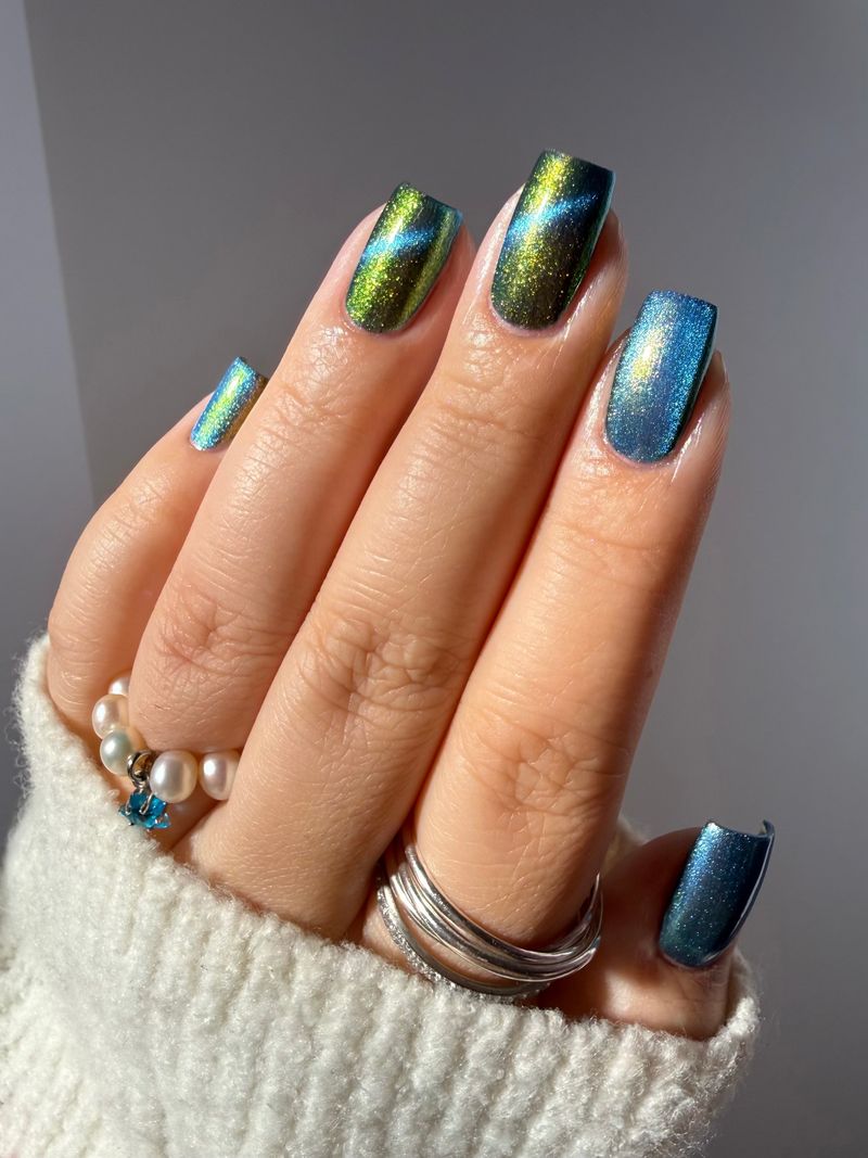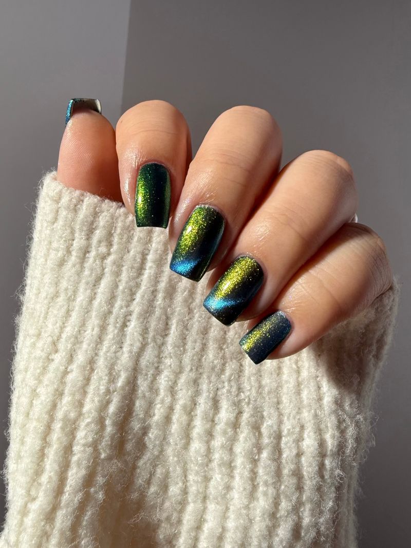 A multichrome nail polish that shifts from bronze to green, to a dark blue. Opaque in 2 - 3 coats depending on your application, top coat recommended for a glossy...