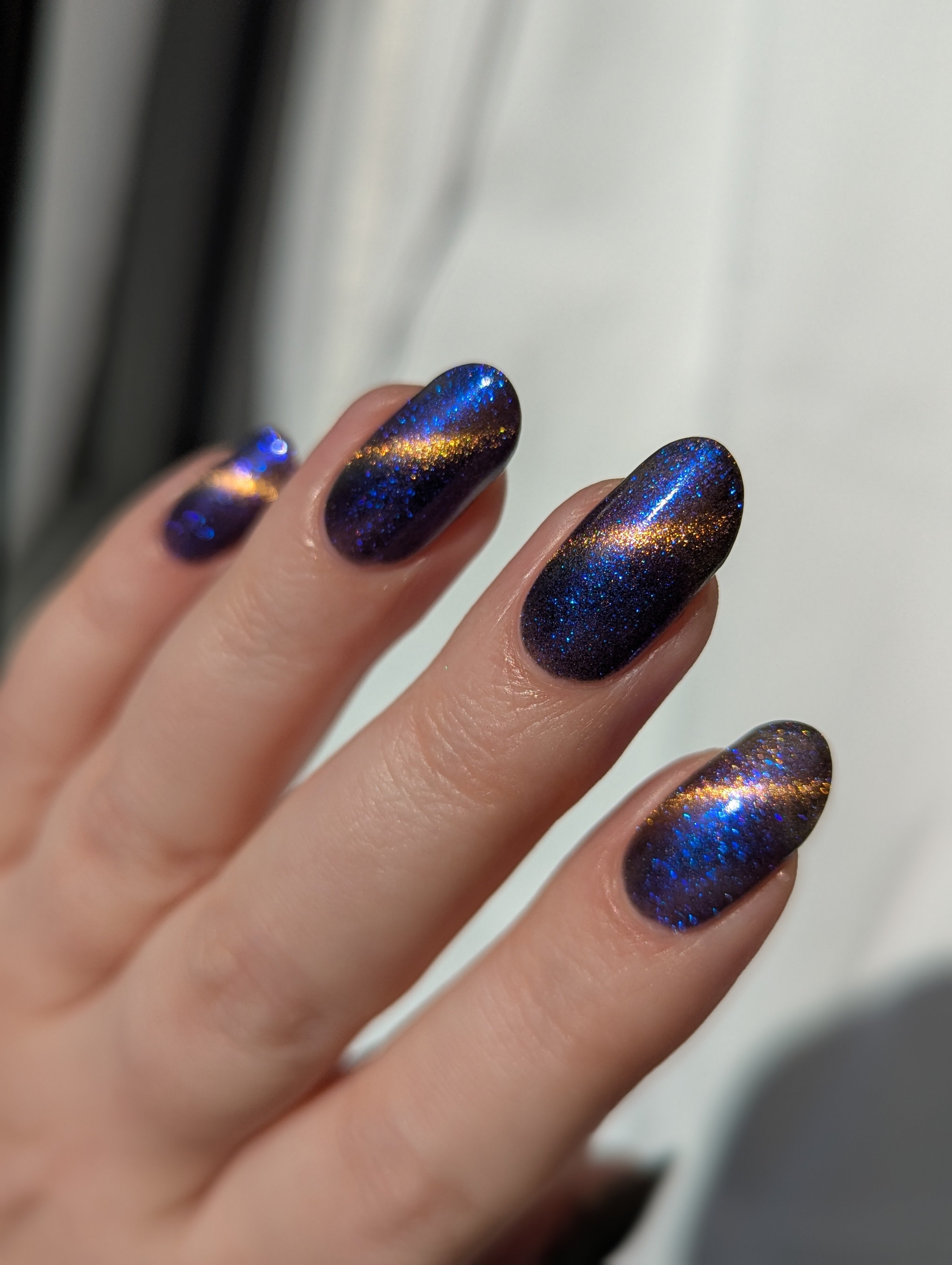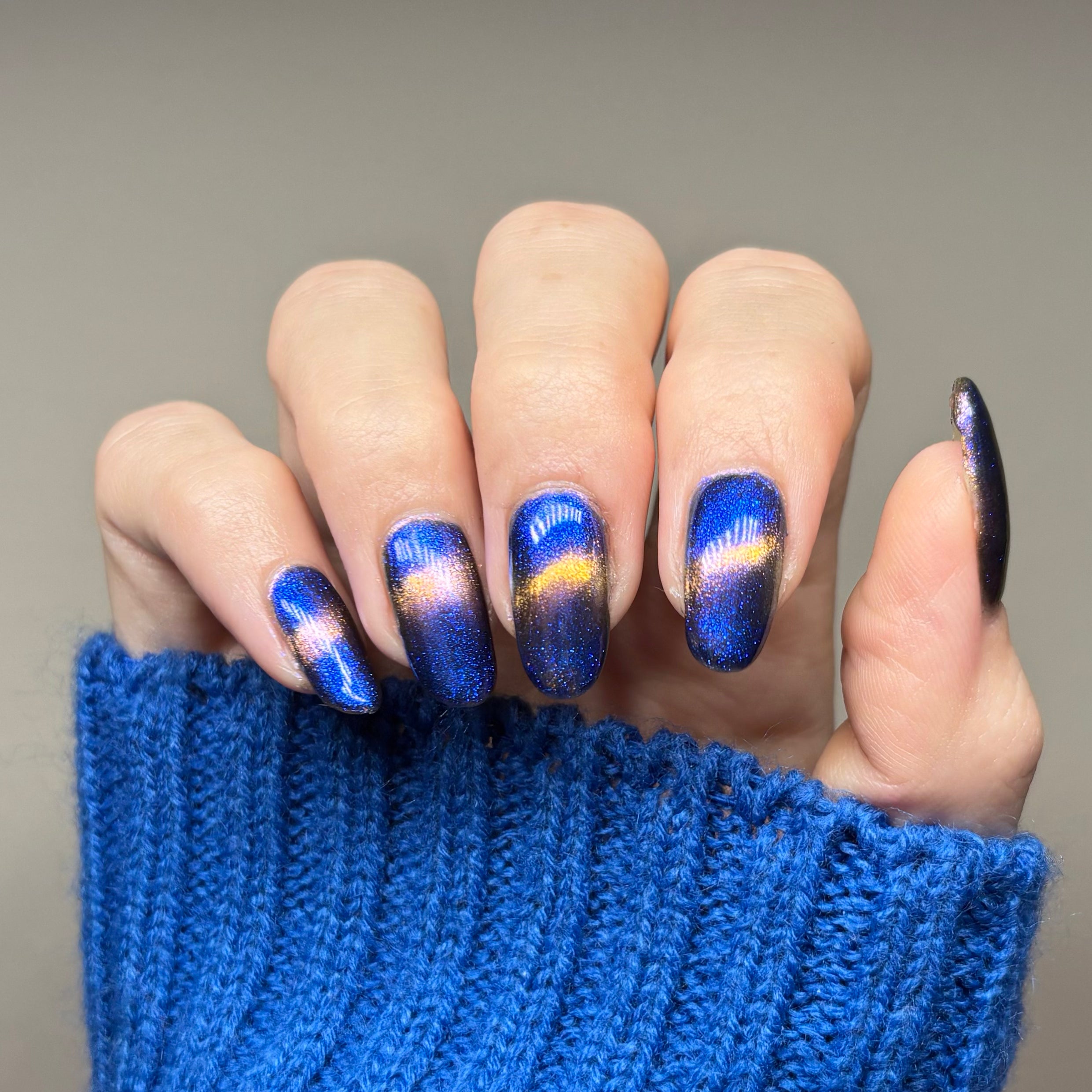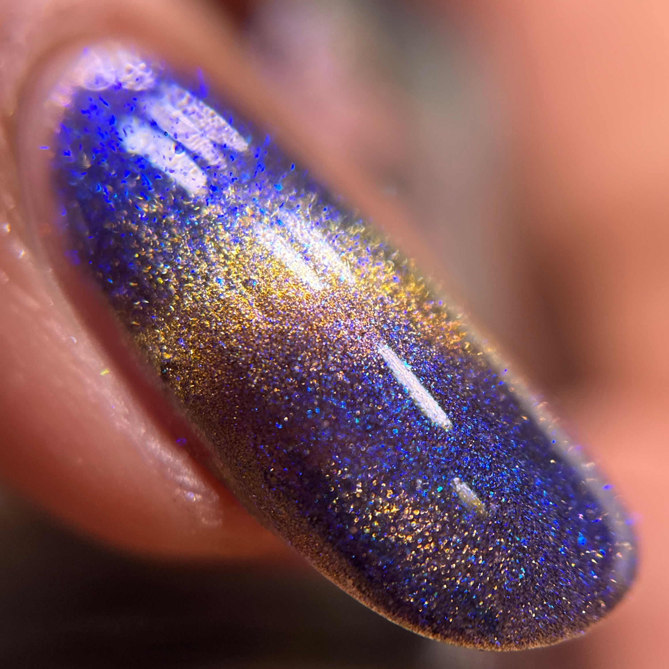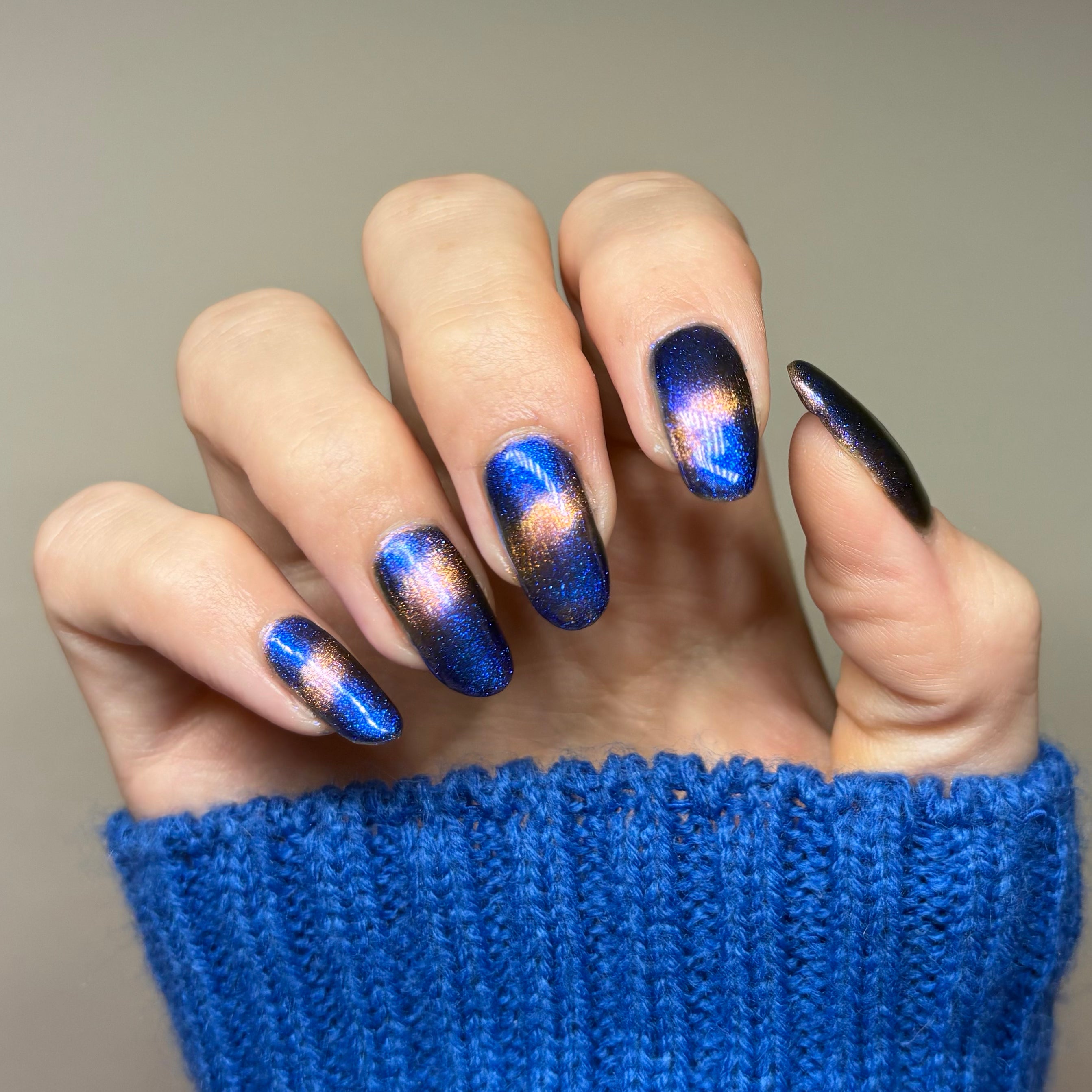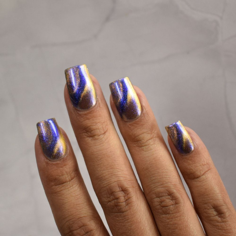 It Doesn't Know Any Better, But You Do - an indigo to purple pastel multichrome with a pale pink to peach magnetic multichrome shimmer