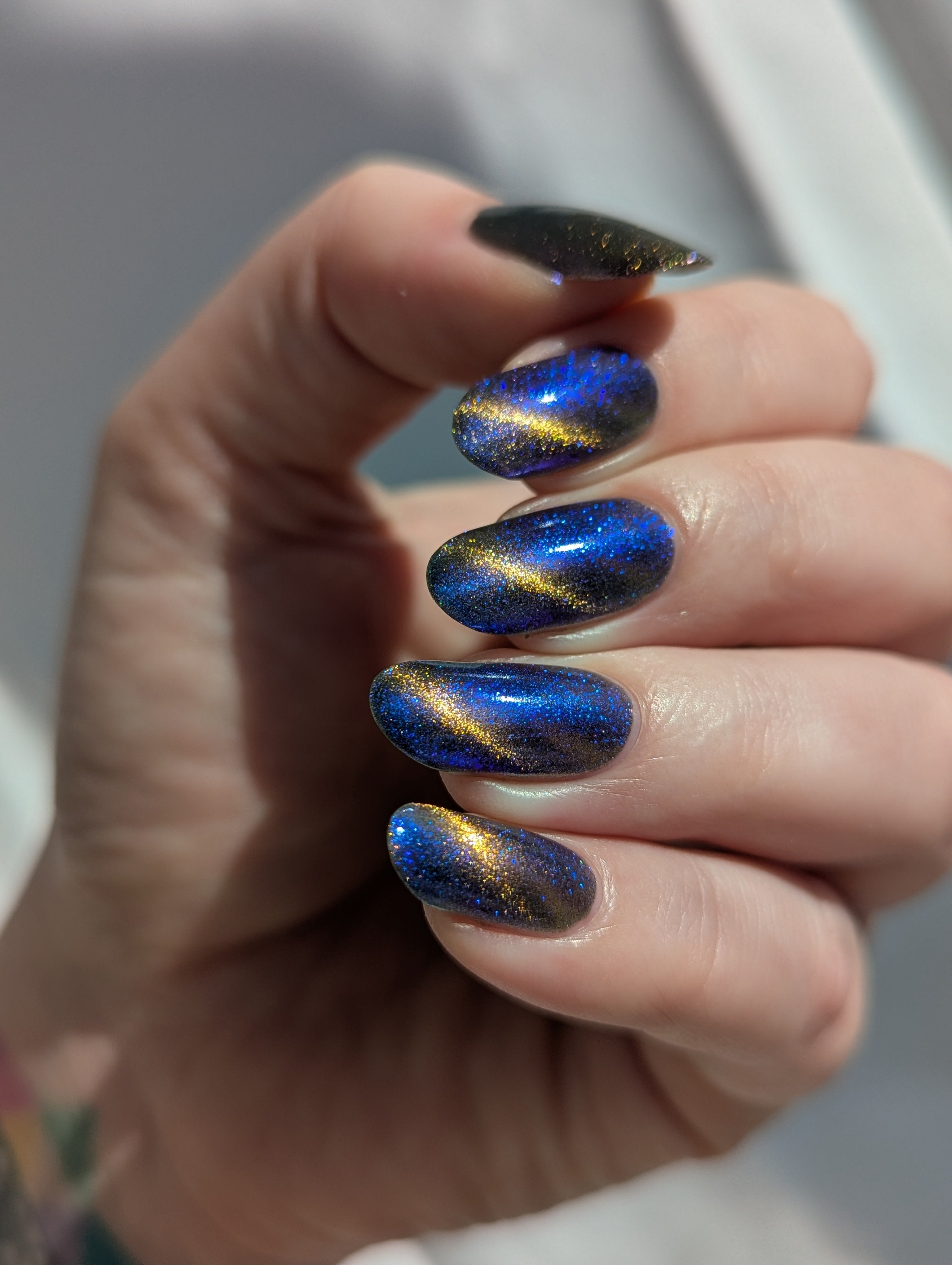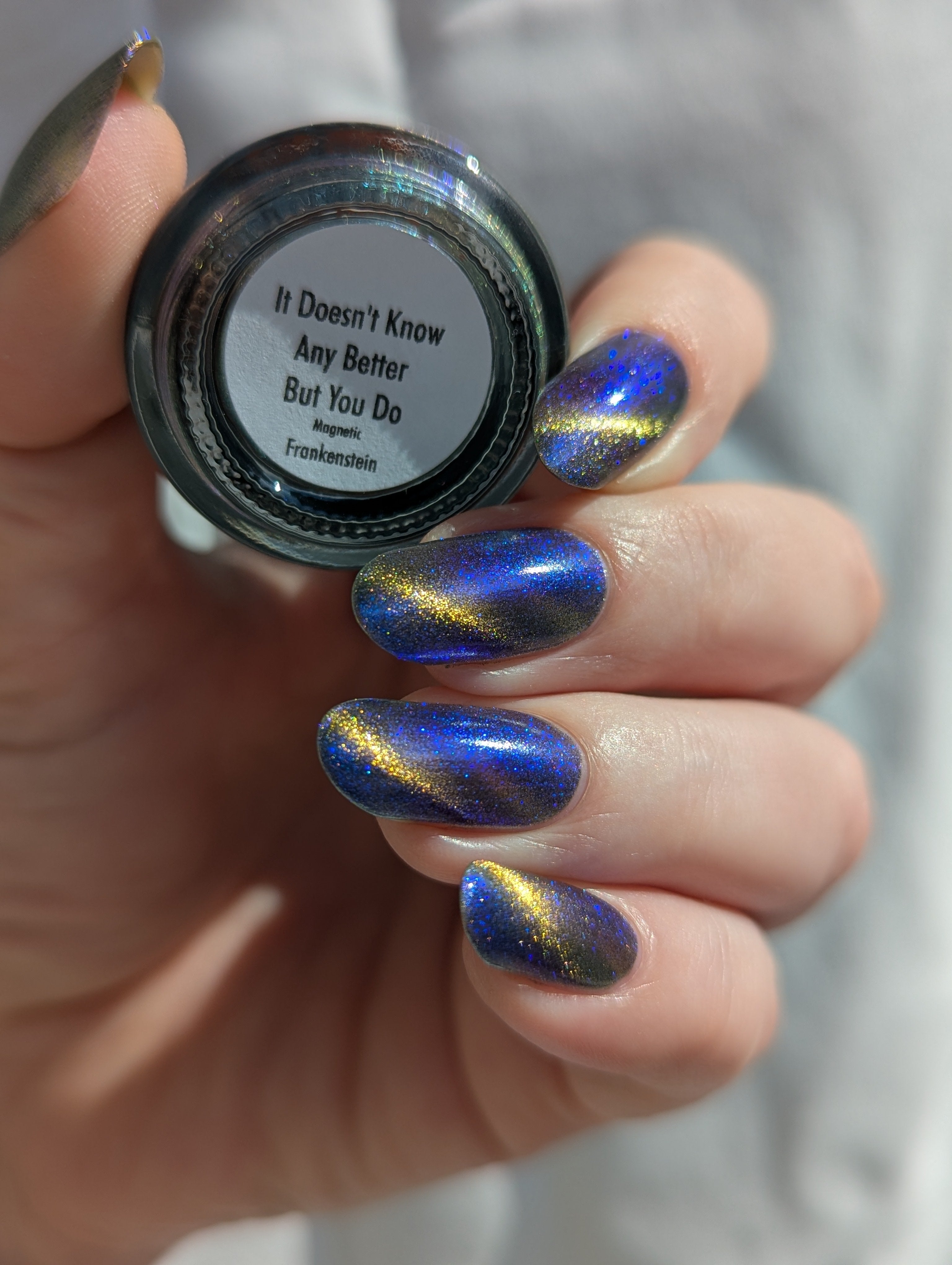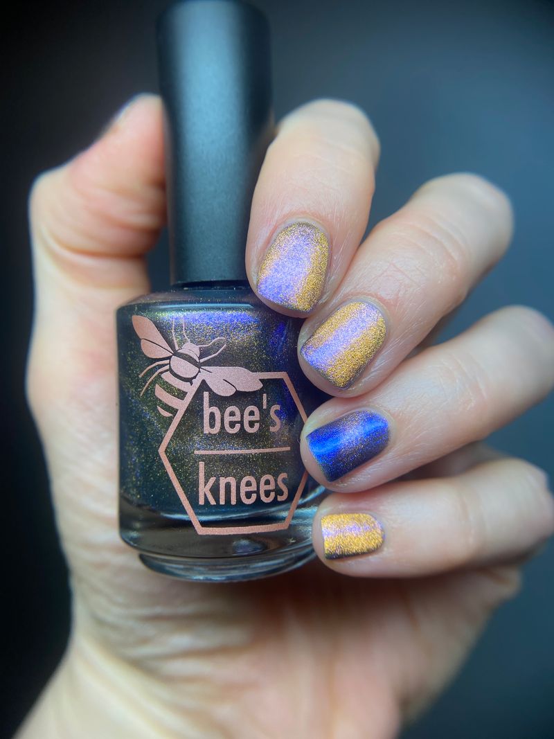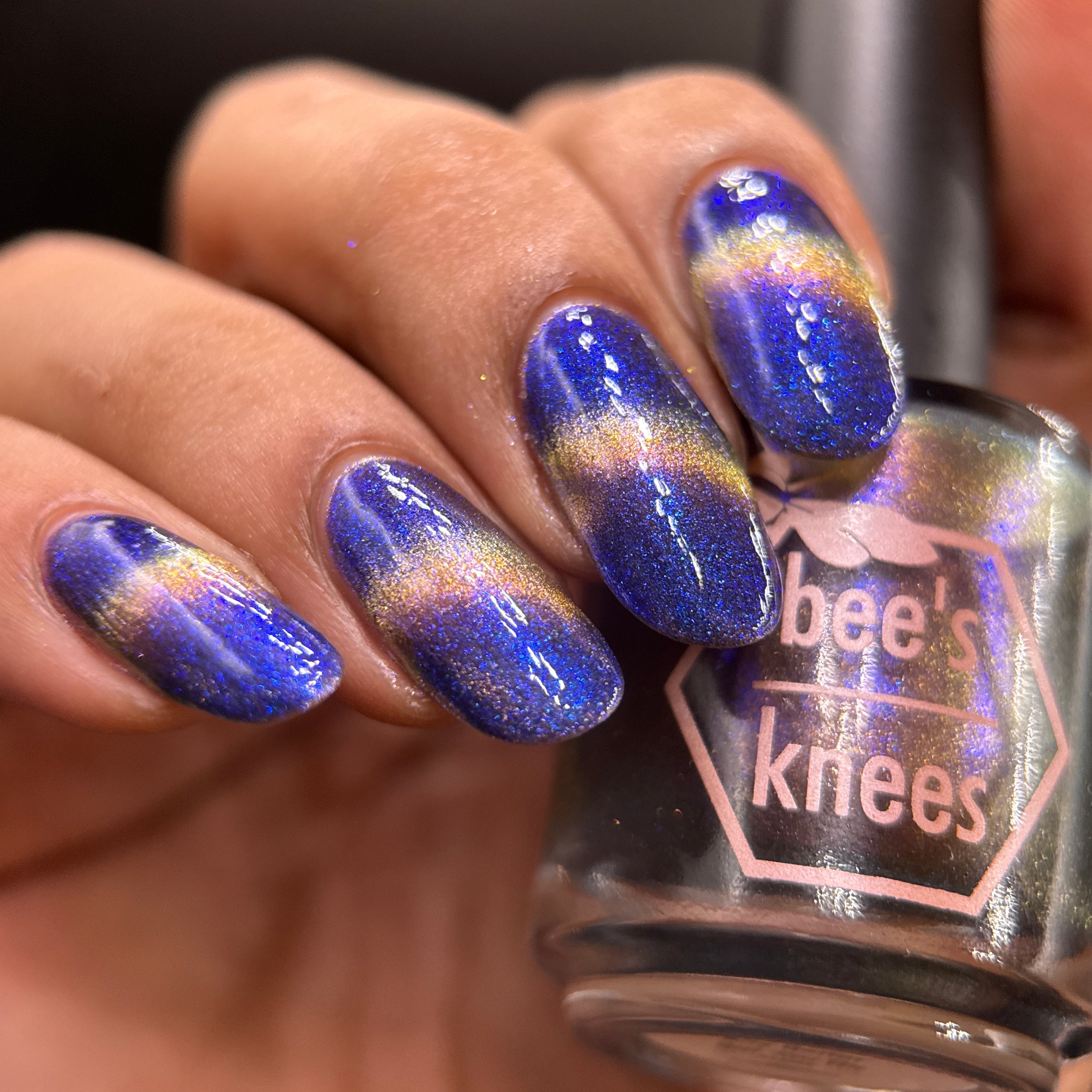 It Doesn't Know Any Better, But You Do - an indigo to purple pastel multichrome with a pale pink to peach magnetic multichrome shimmer