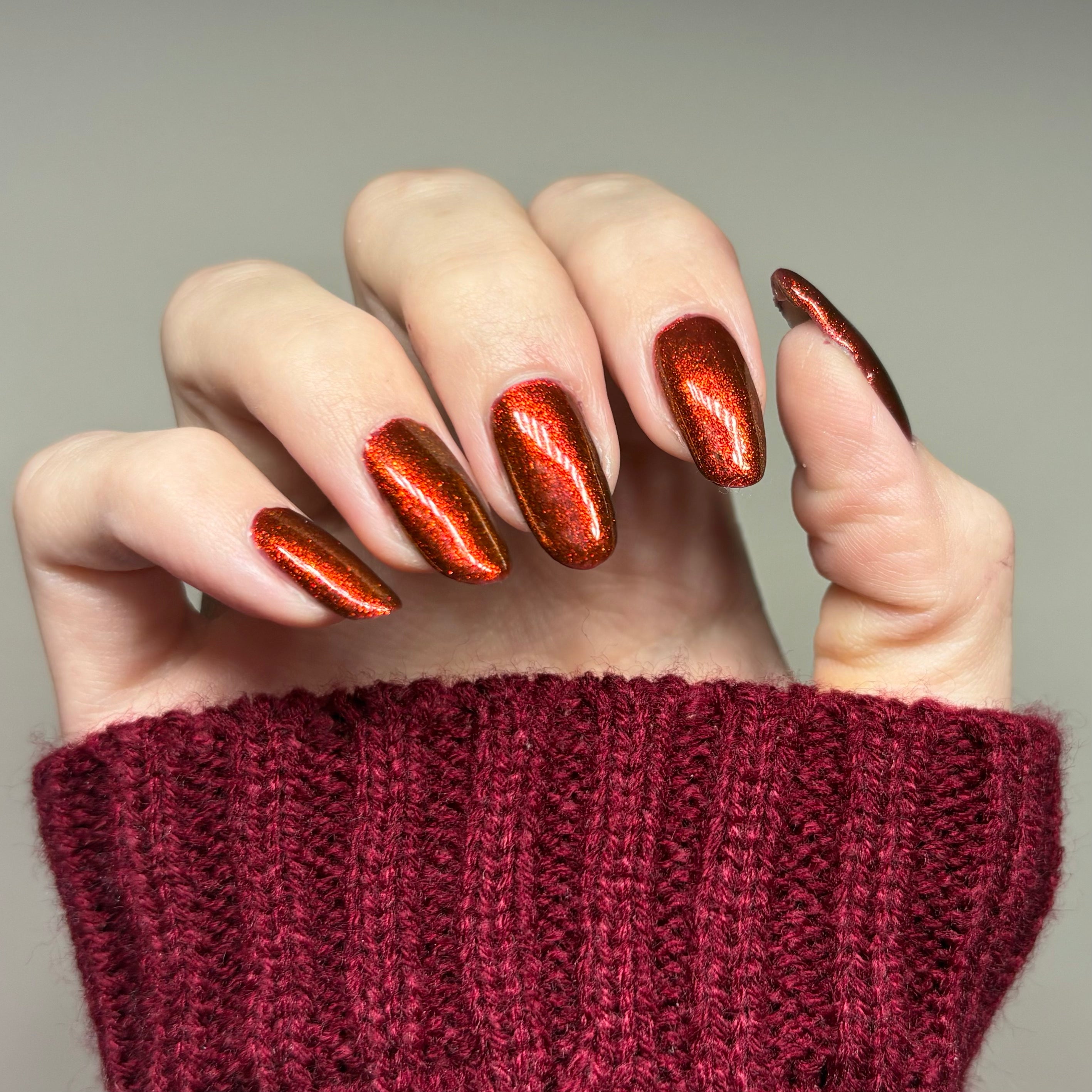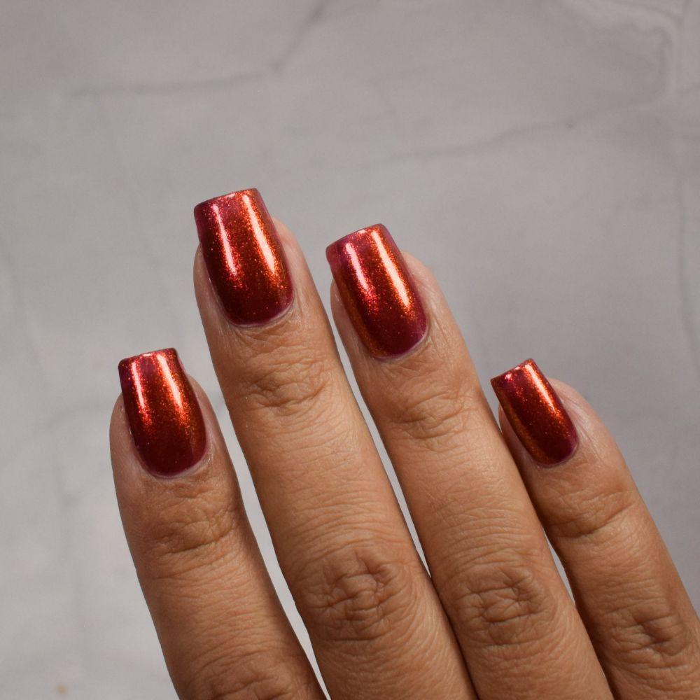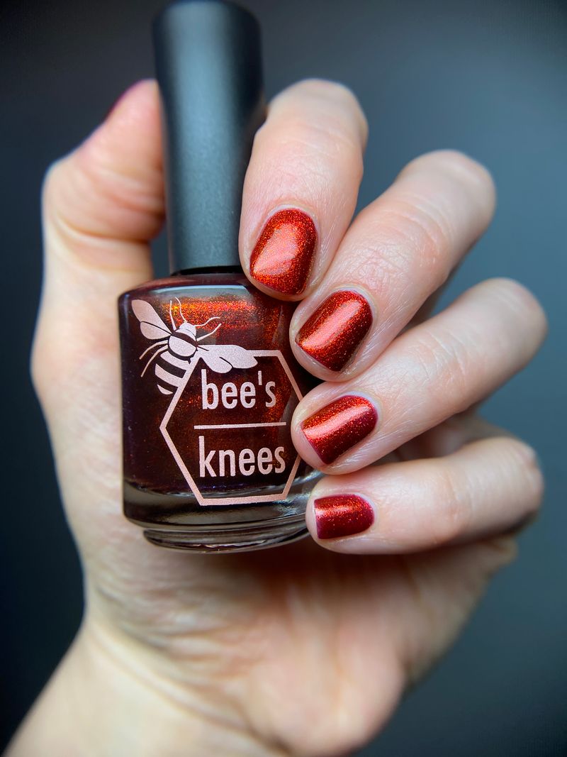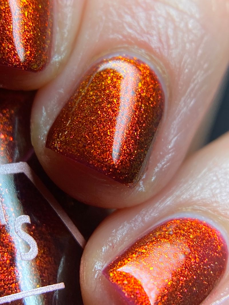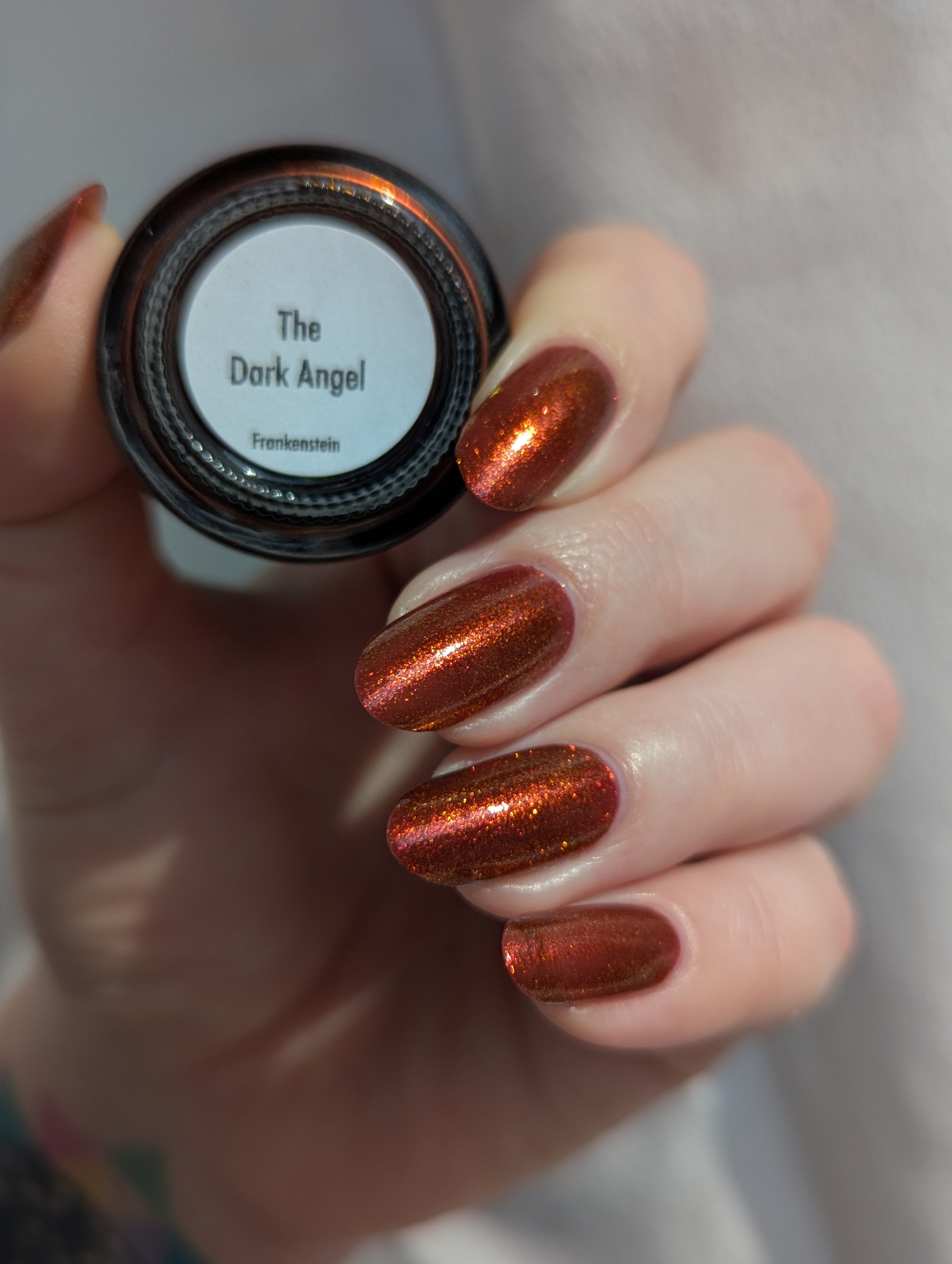 The Dark Angel  -an oxblood base with fiery red microflake shimmer.