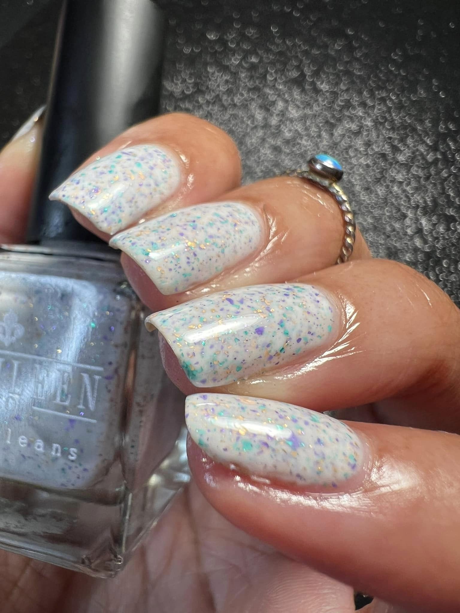 King Cake - white crelly base with purple, gold, and green metallic flakes.
