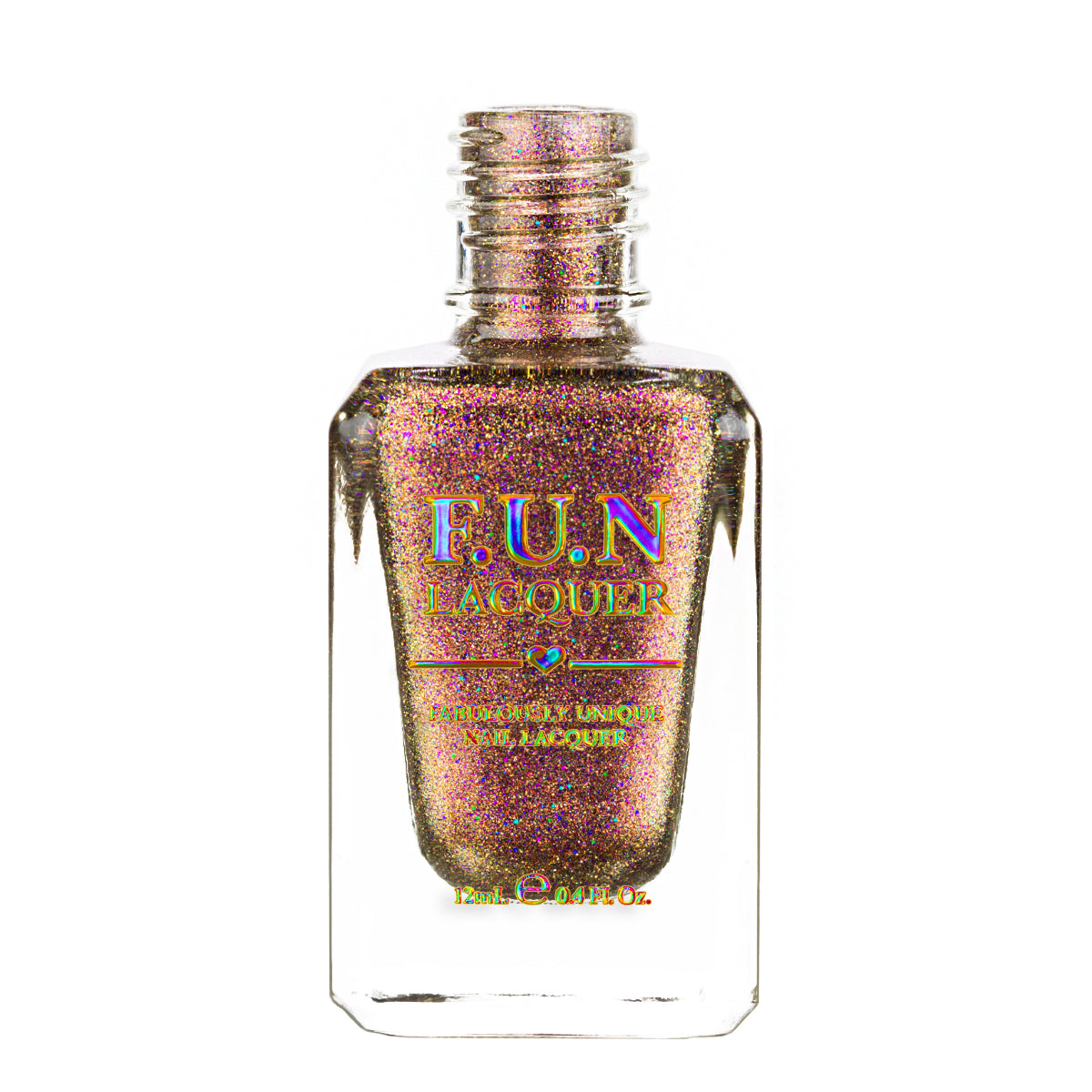 This topper has copper/chartreuse/gold clear flakes. It adds a beautiful finish to all polishes especially cremes. Shown over a black base in some photos