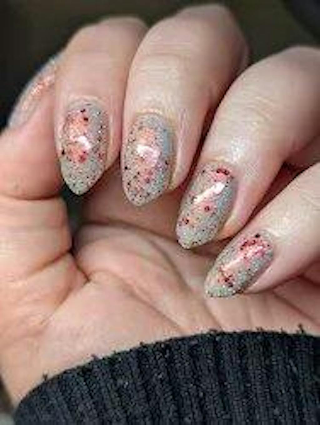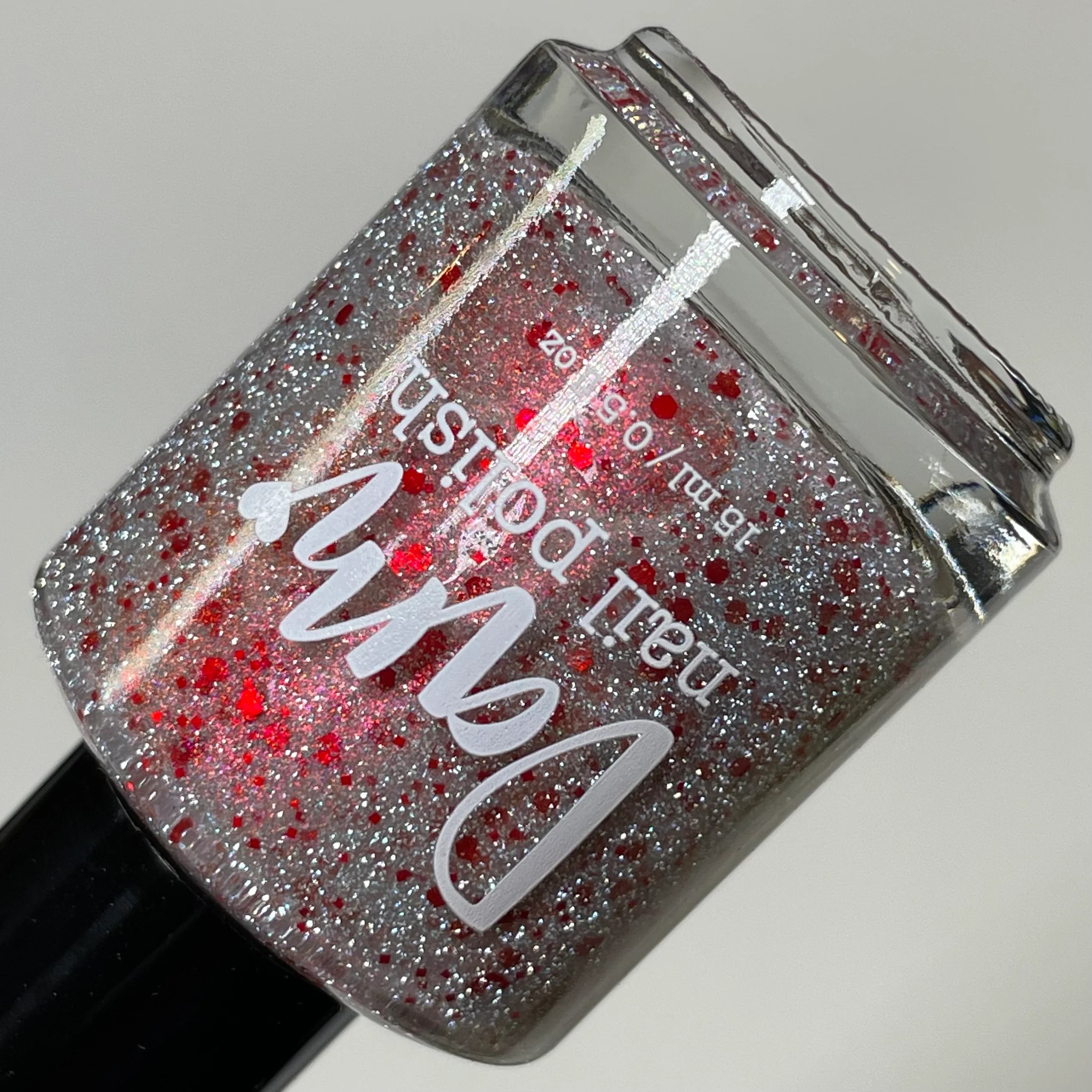 Silver reflective glitters with a red and orange shifting shimmer and assorted red glitters.