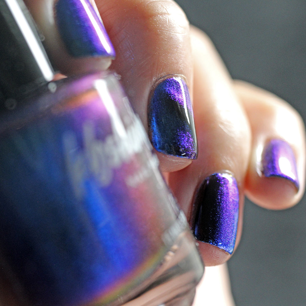 Azure Wish is a strikingly vibrant azure blue magnetic multichrome nail polish. With changes in viewing angles and lighting, aqua, indigo, purple, and even near-navy hues come out to play. Intensely pigmented for velvet-style magnetic nails, Azure Wish also looks stunning in 2 coats with cat-eye or other magnetic styles.