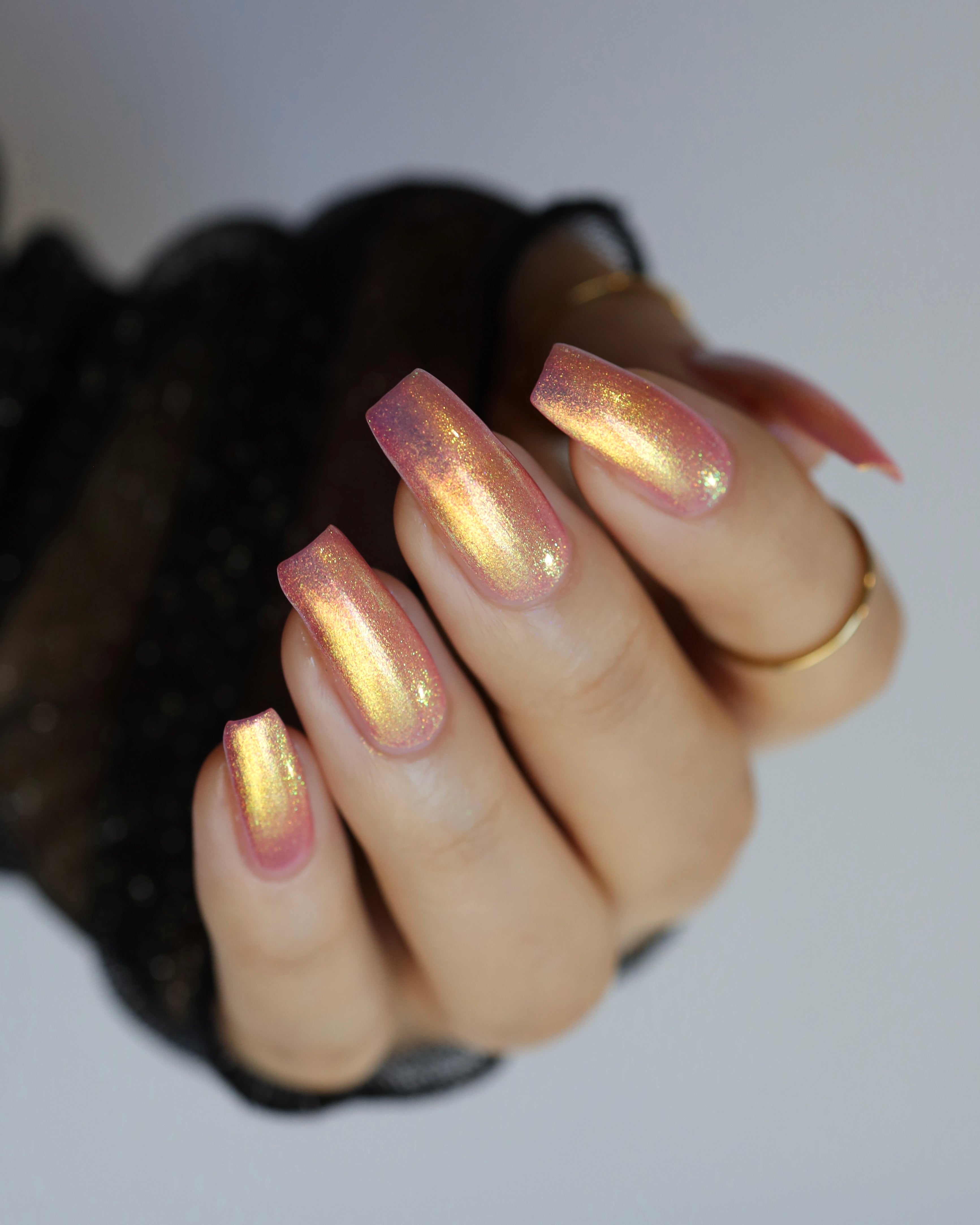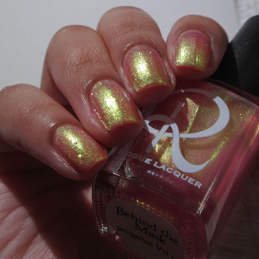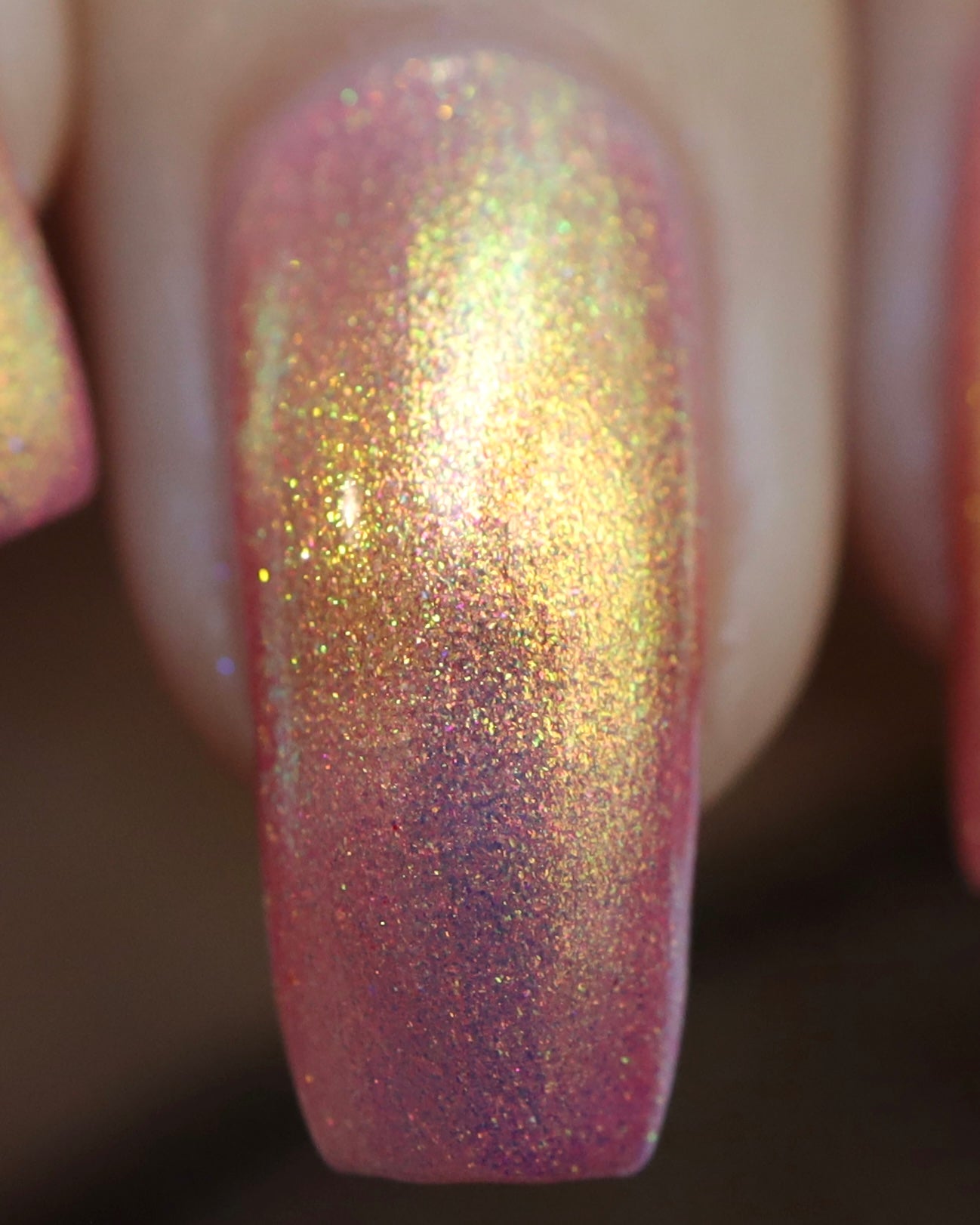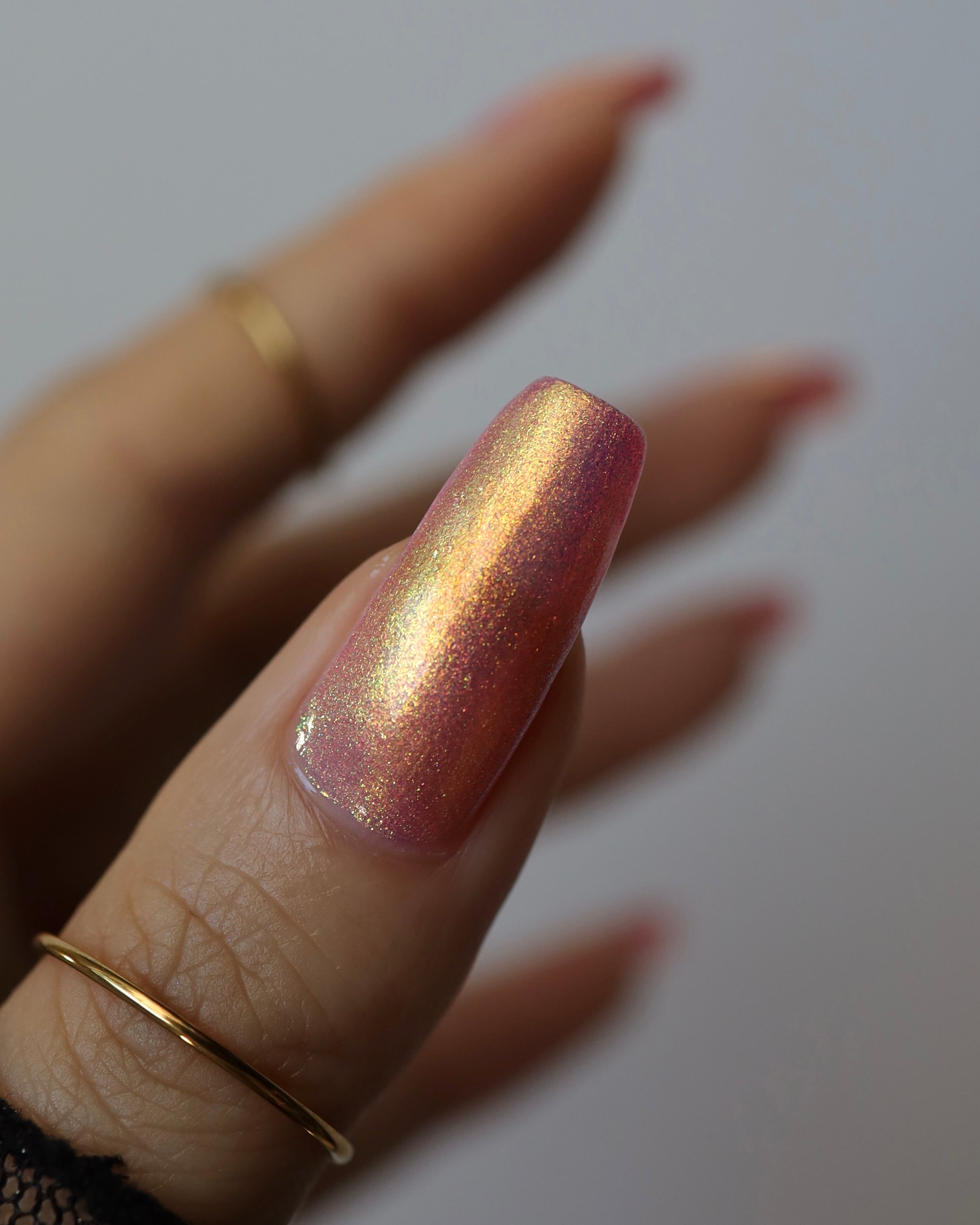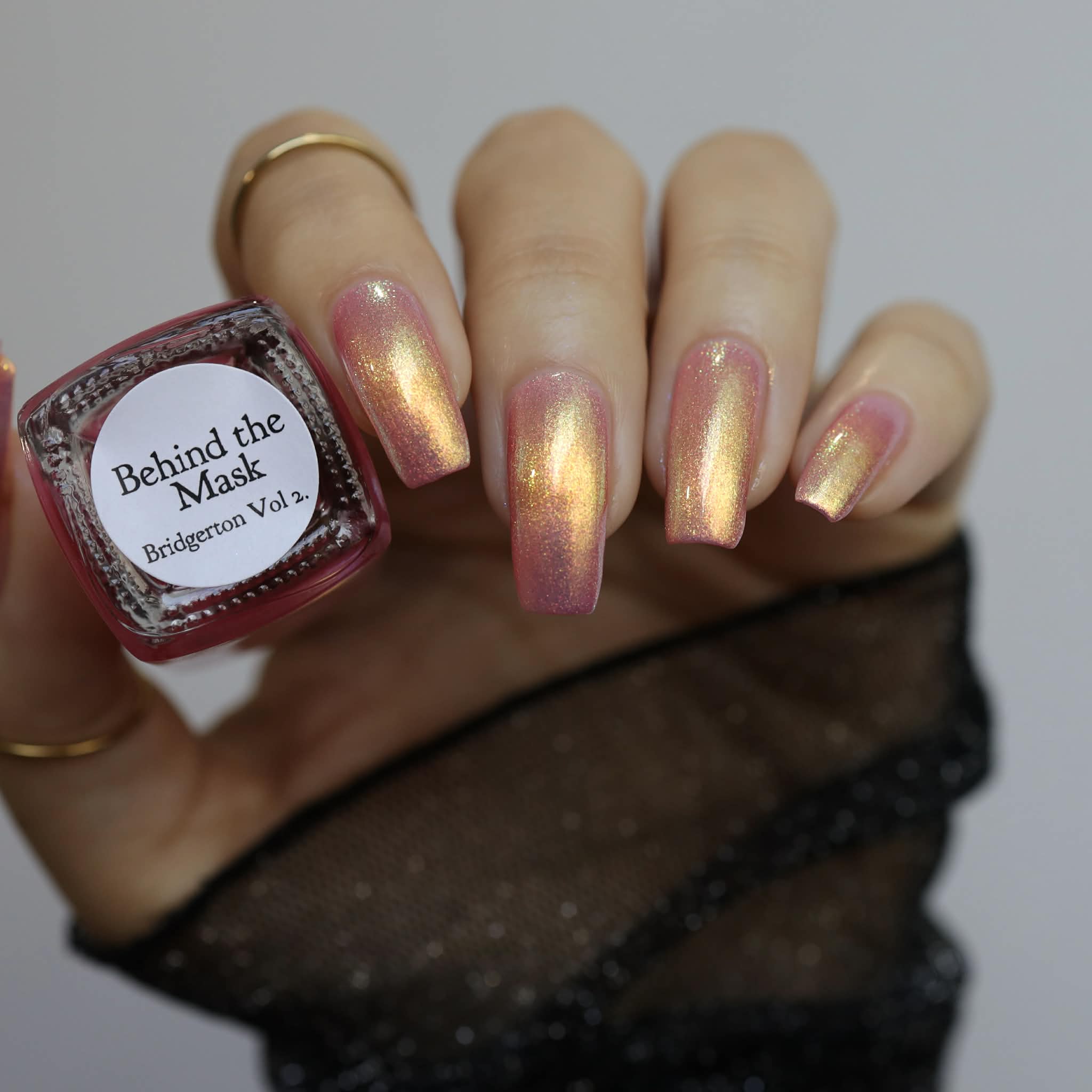 Behind the mask – strawberry pink with and orangey gold pastel chrome shimmer