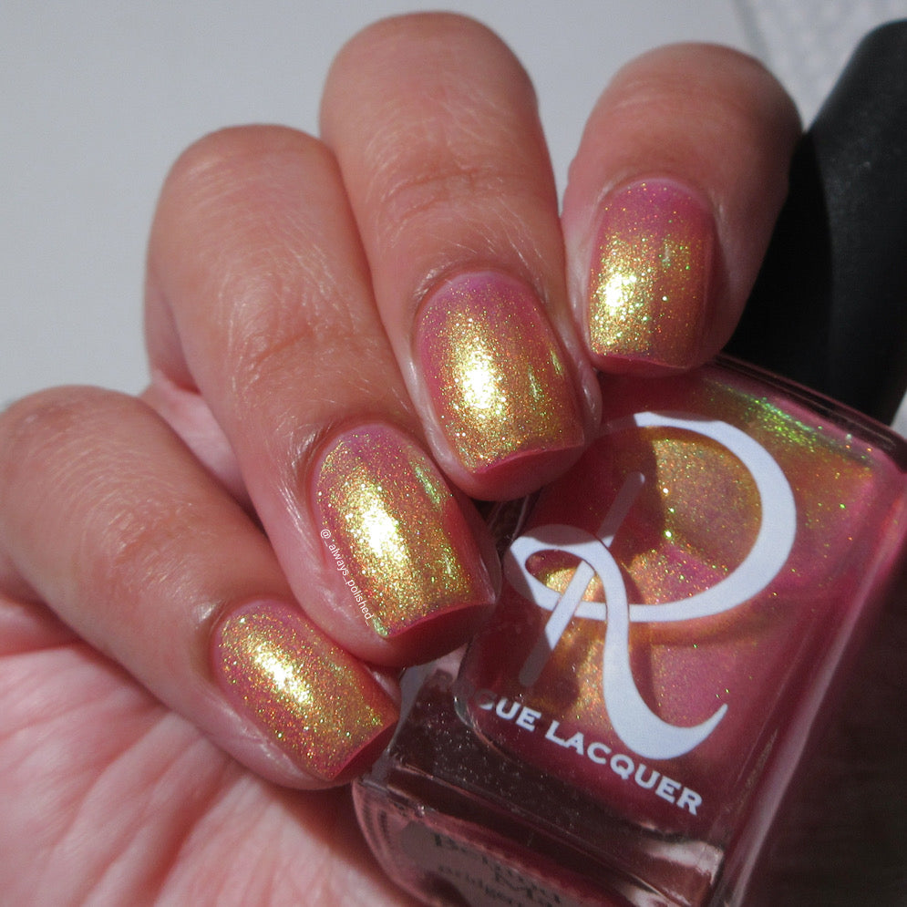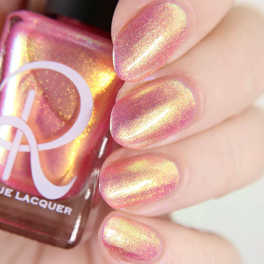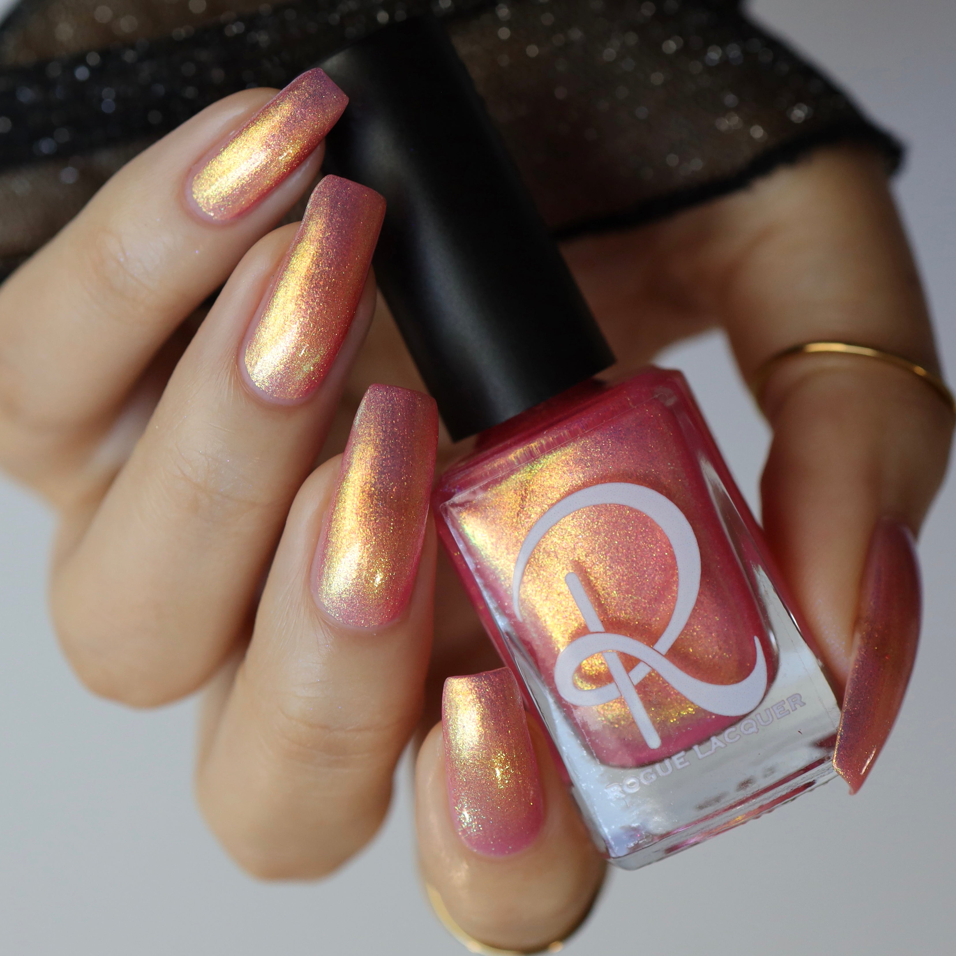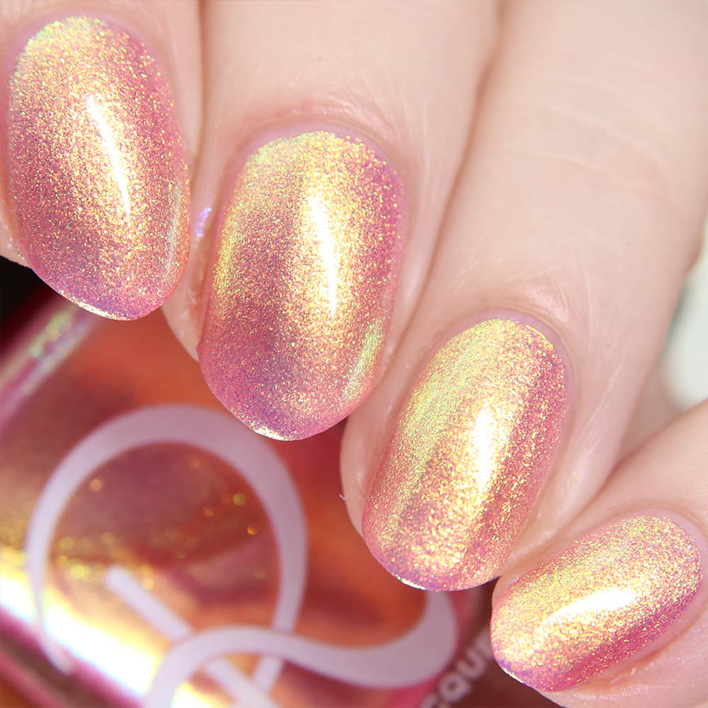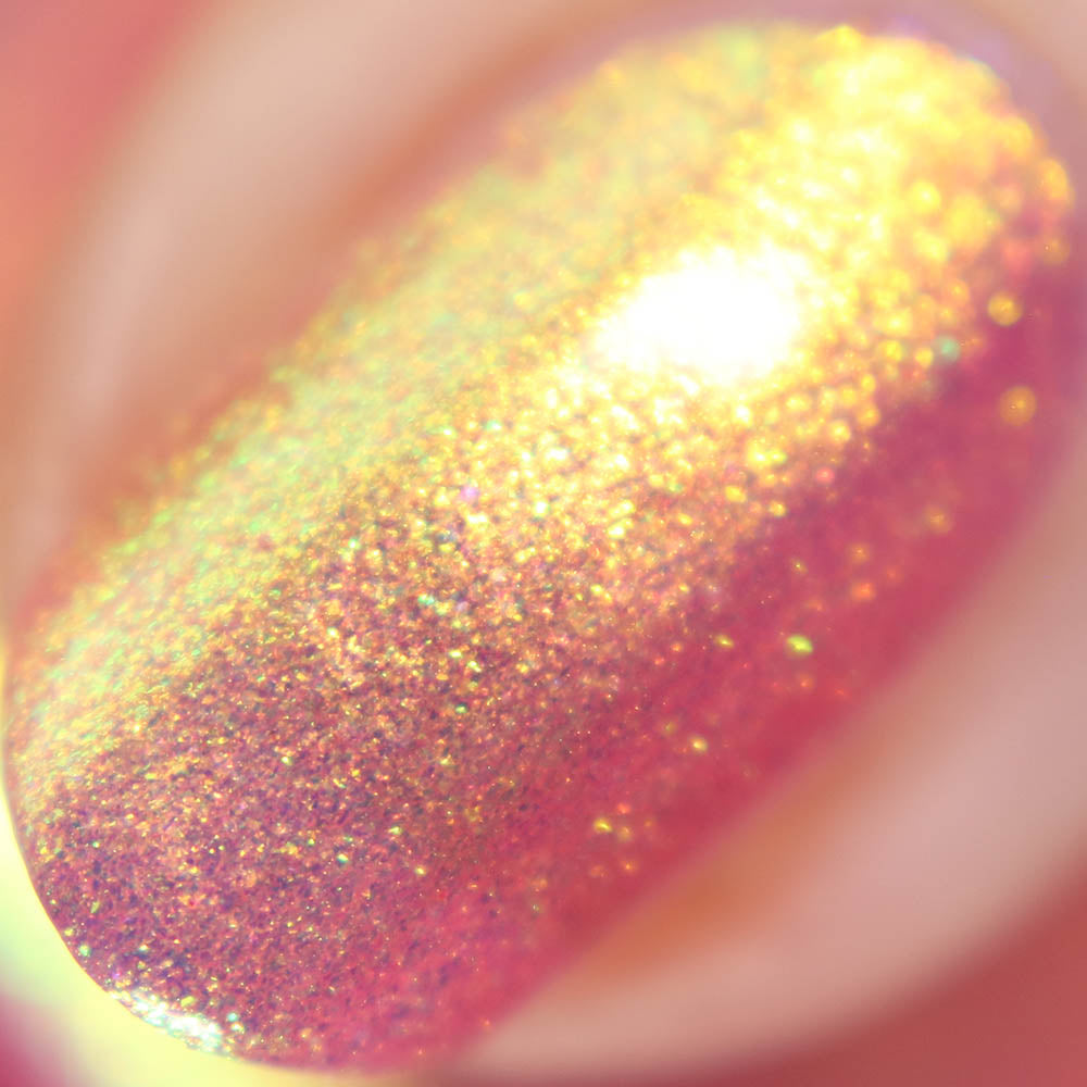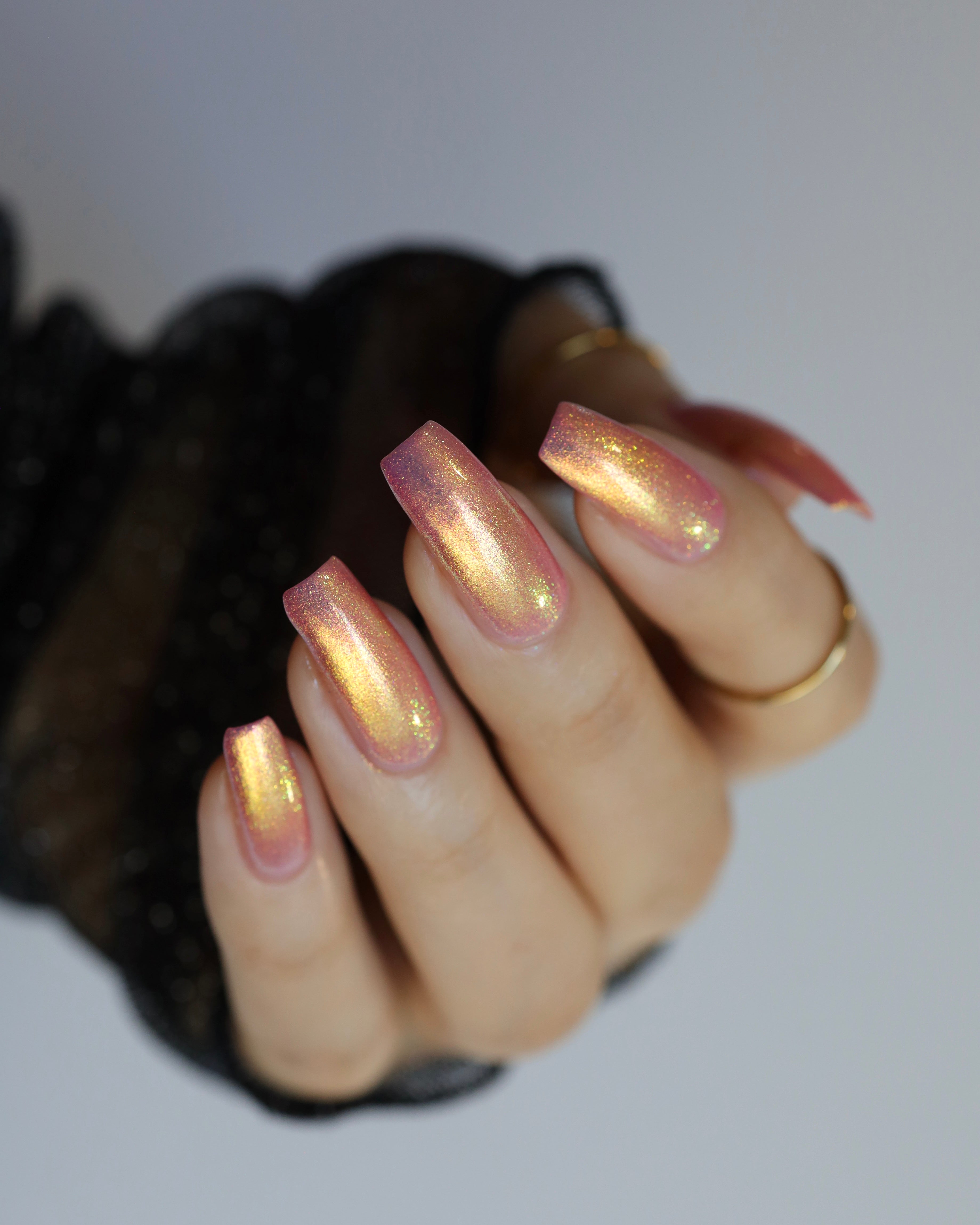 Behind the mask – strawberry pink with and orangey gold pastel chrome shimmer