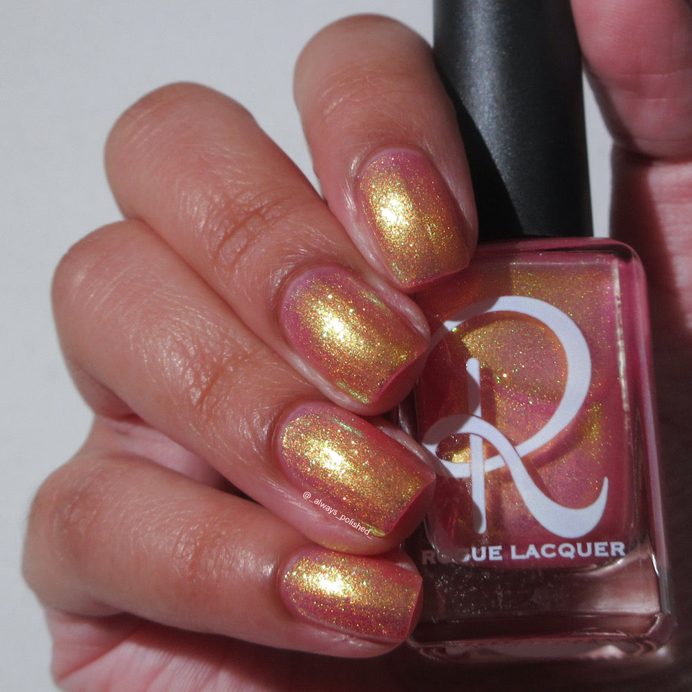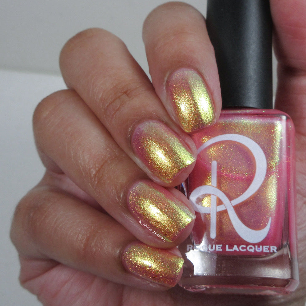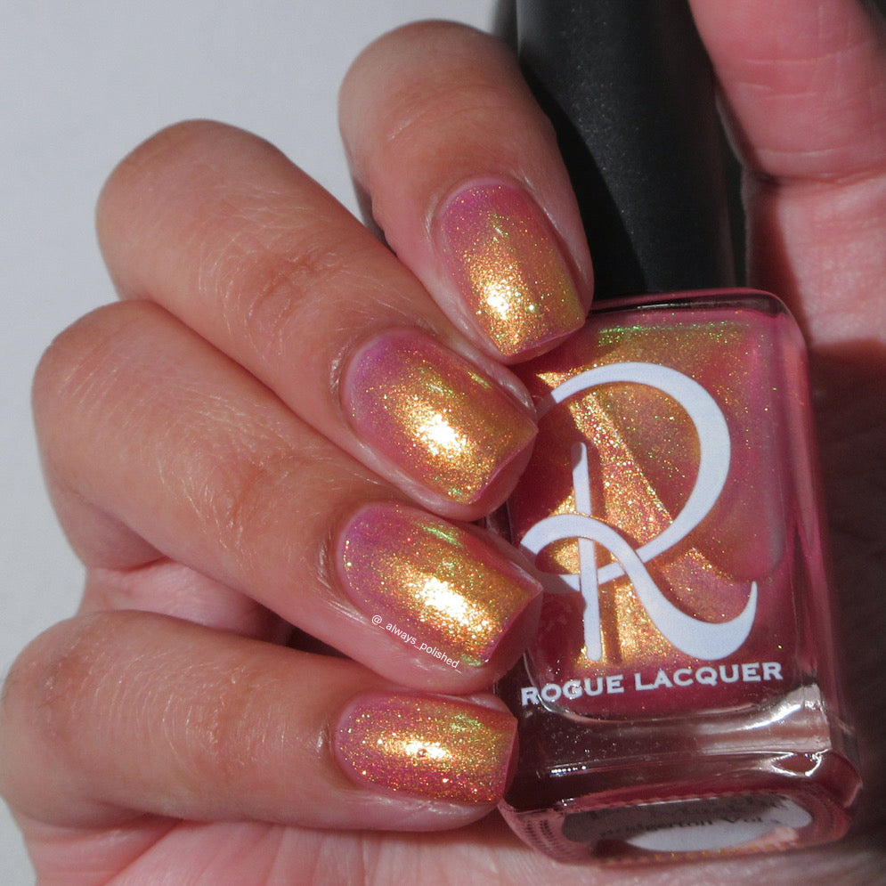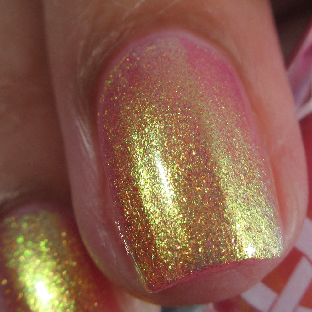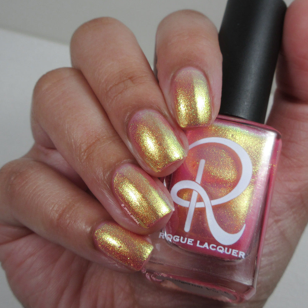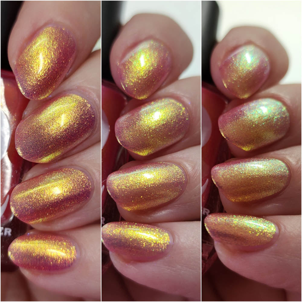 Behind the mask – strawberry pink with and orangey gold pastel chrome shimmer