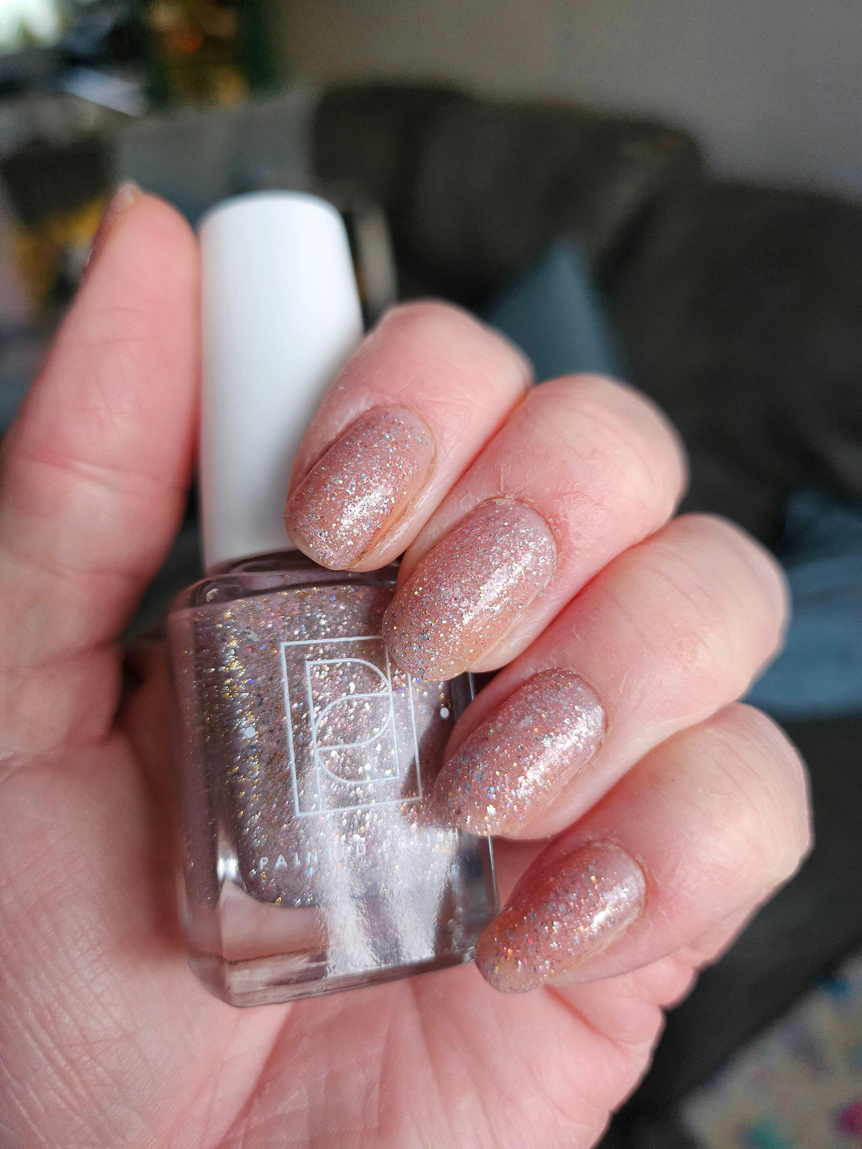 This shade features a champagne mix of gold and silver reflective glitters, pink galaxy holographic glitters, pink and silver metallic flakies in a charm pink crelly base!