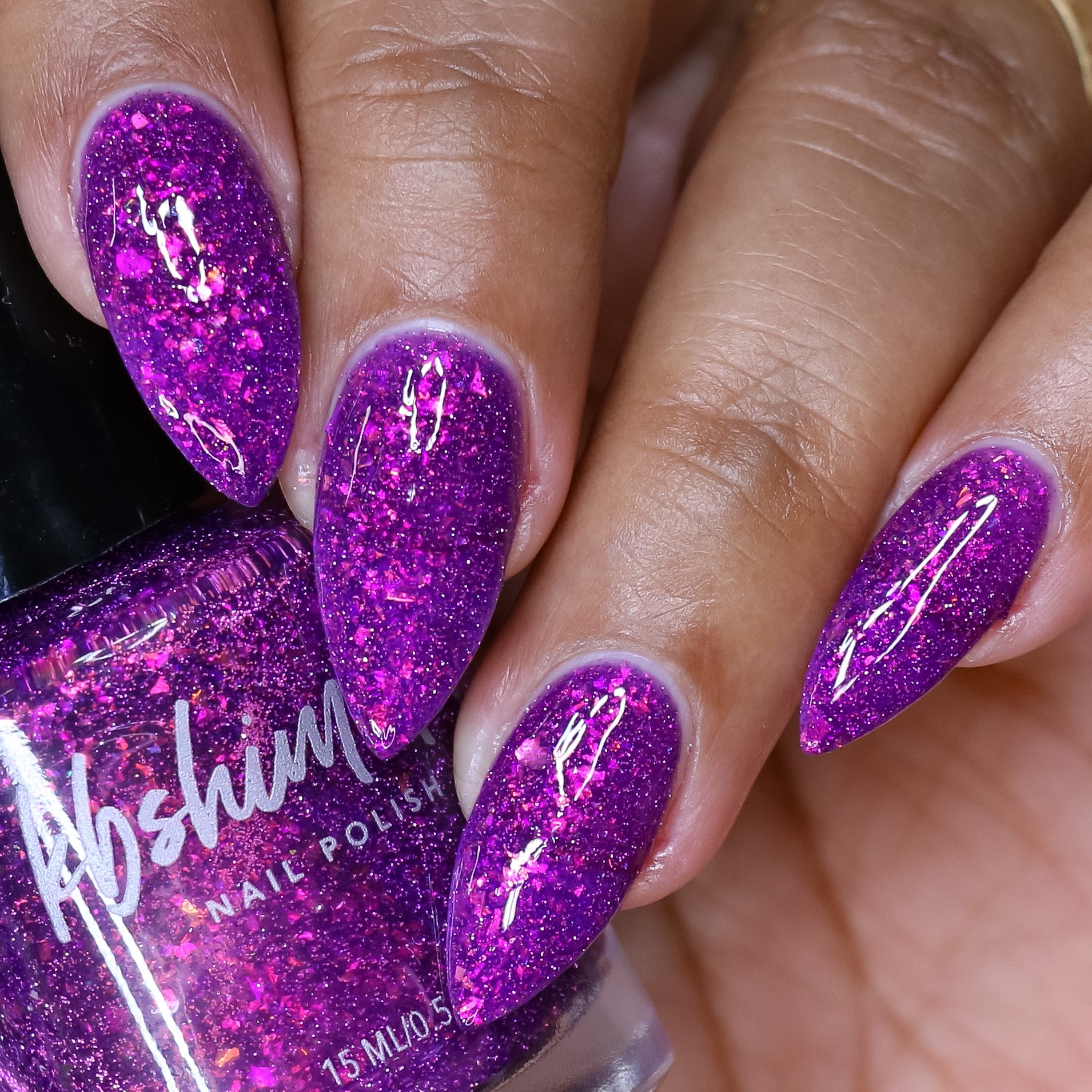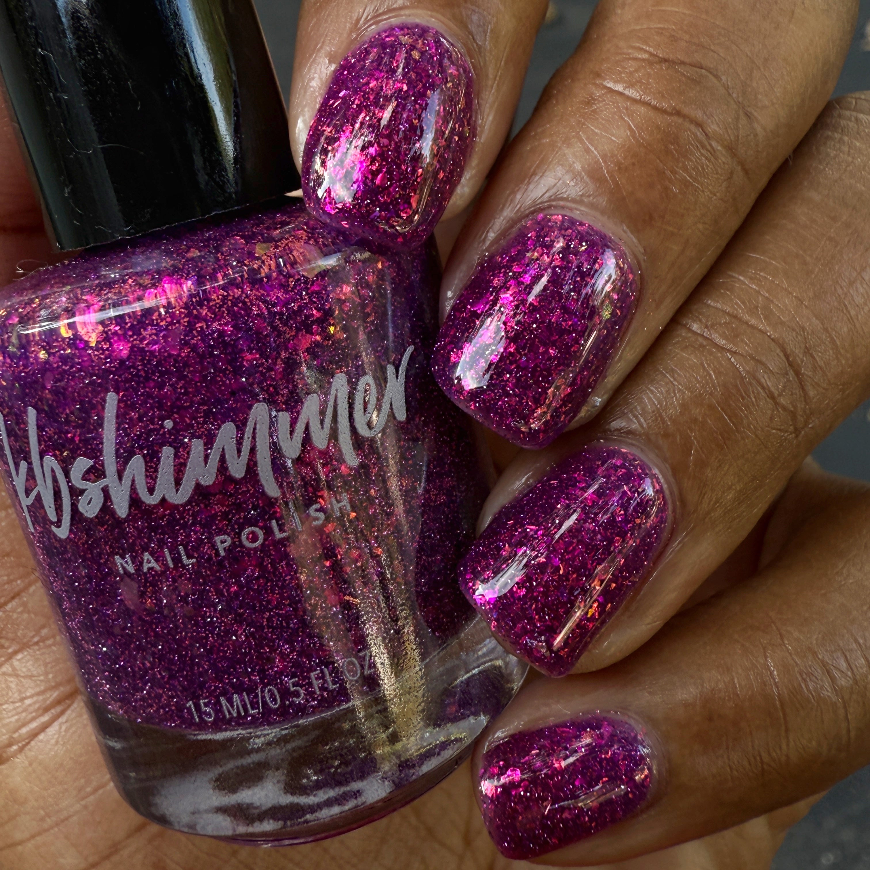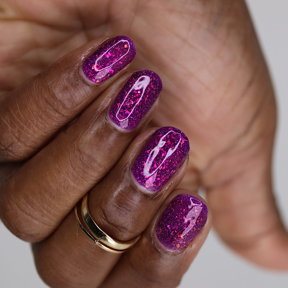 Blanket Statement is a purple jelly nail polish with raspberry undertones. A scattering of fuchsia reflective glitters comes alive in light and with flash, adding a fun glittering effect. Color-shifting flakes steal the show, flashing from pink to gold, to orange and lime, for a show-stopping shade that will enthrall you.