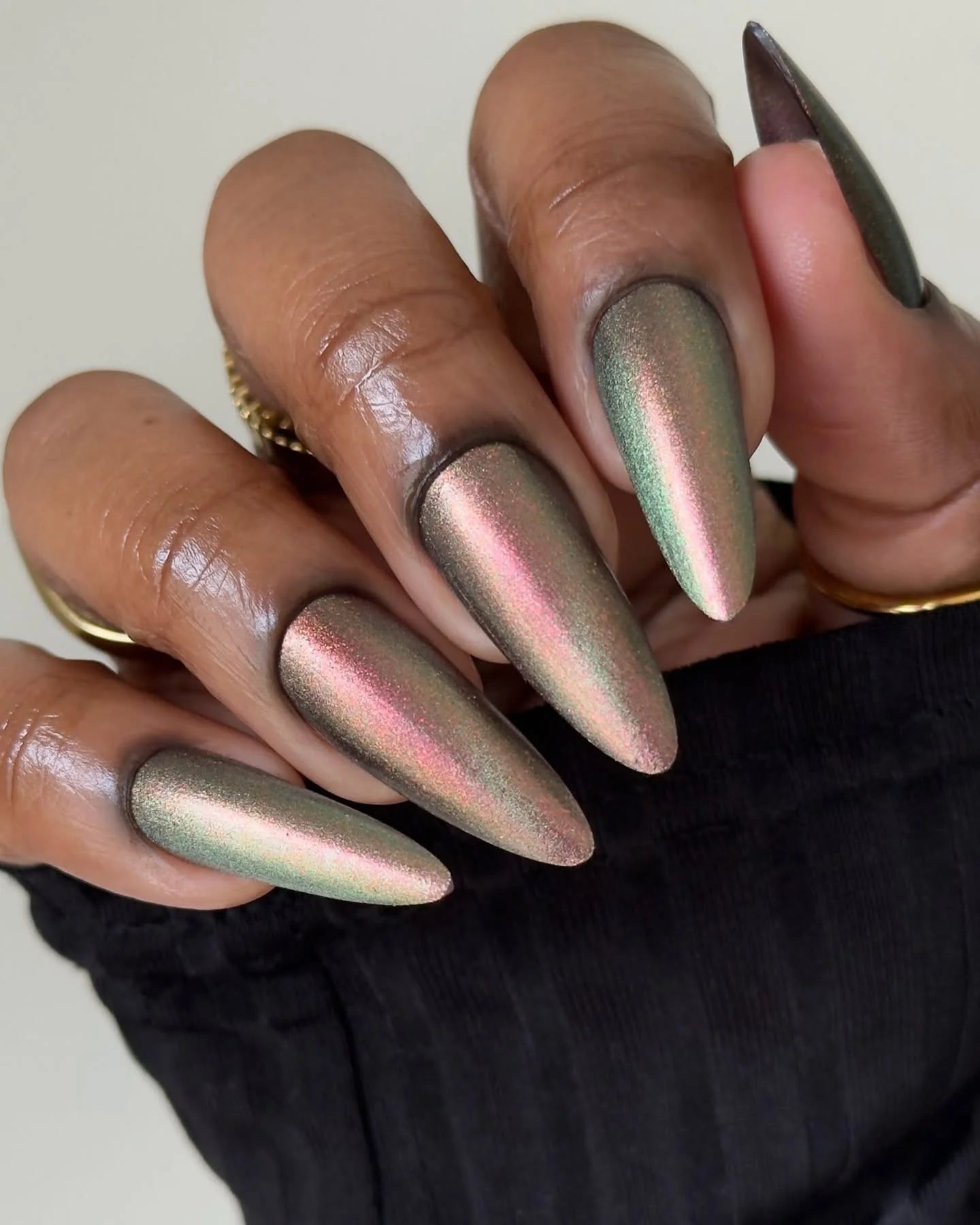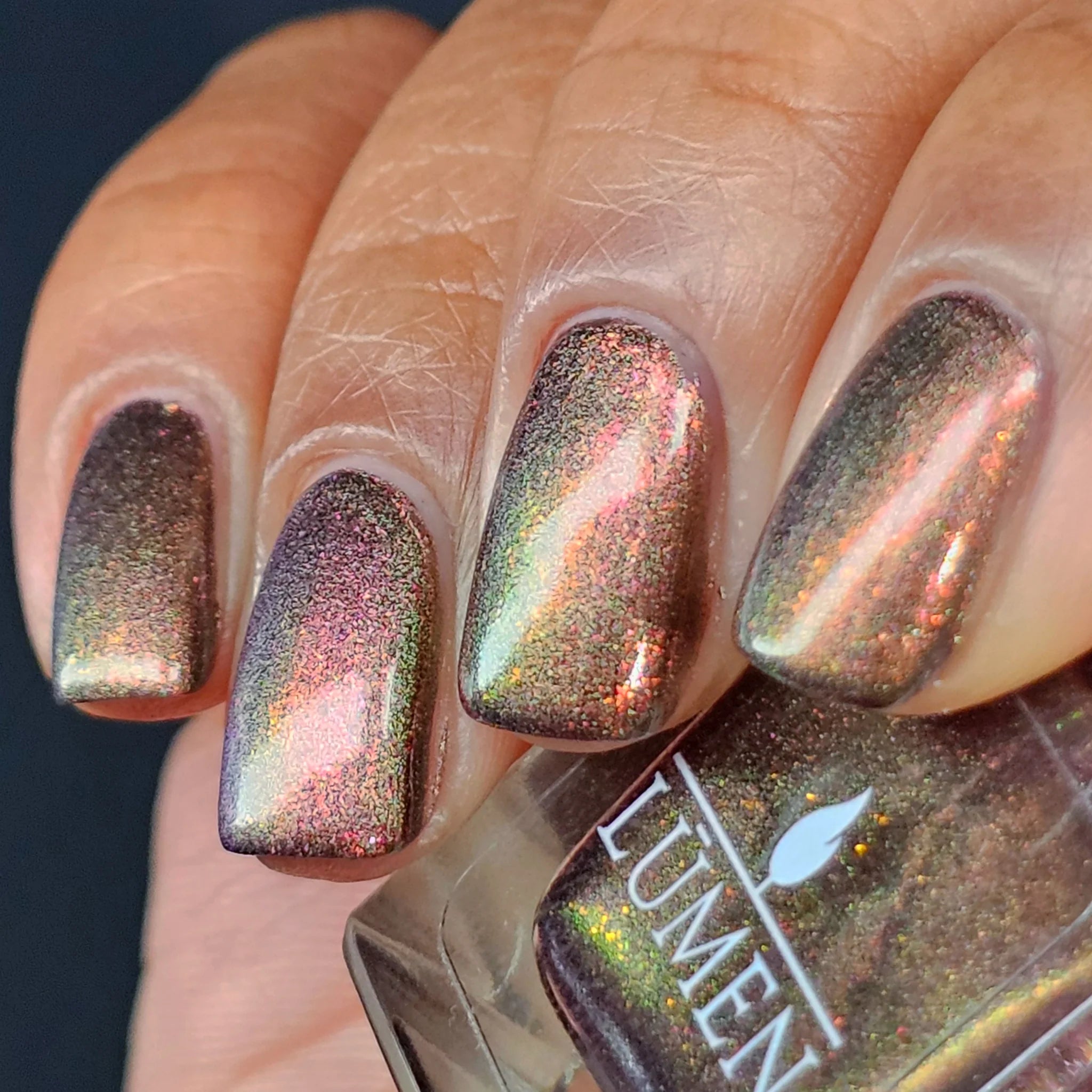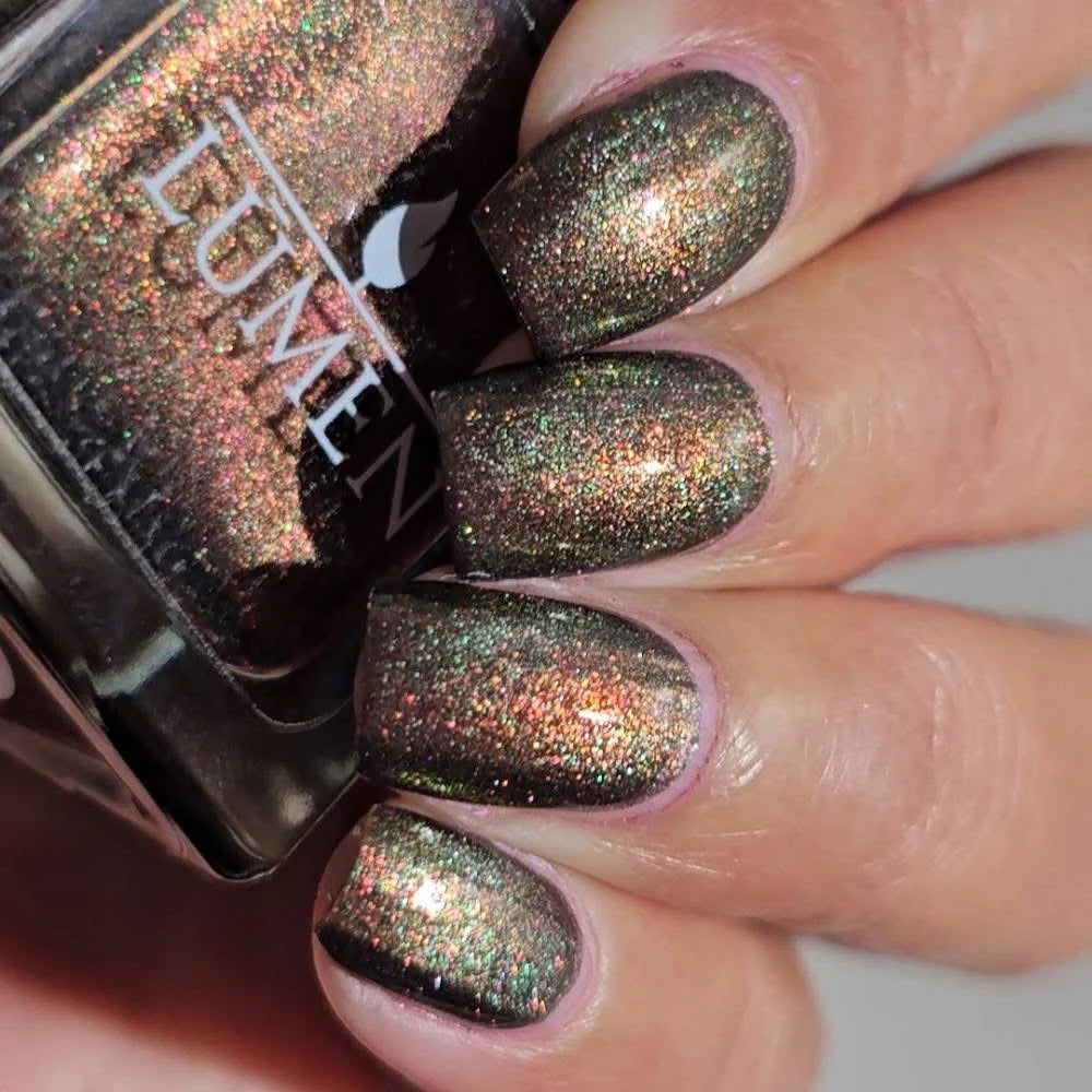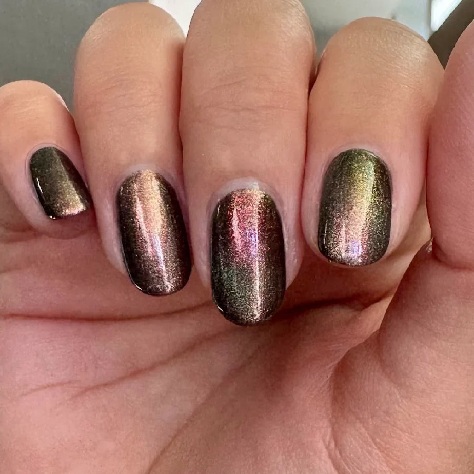 Create spellbinding depth with a luminous magnetic nail polish that shifts and moves with every pull of the magnet. Infused with ultra-fine magnetic pigment, this shade transforms from a shimmering Earth shade to a dimensional golden red that shifts with movement.
