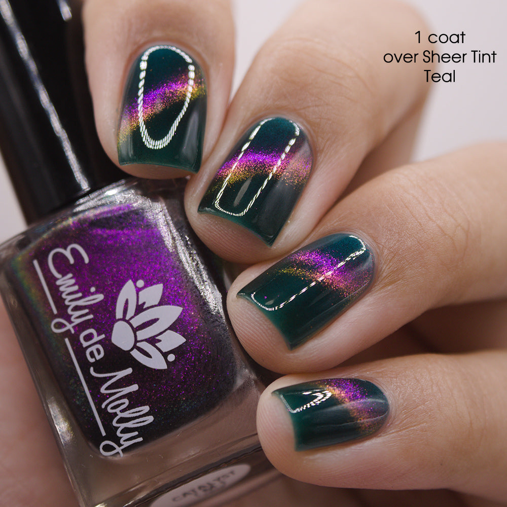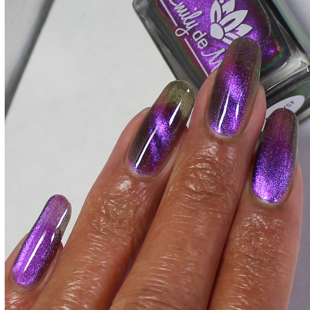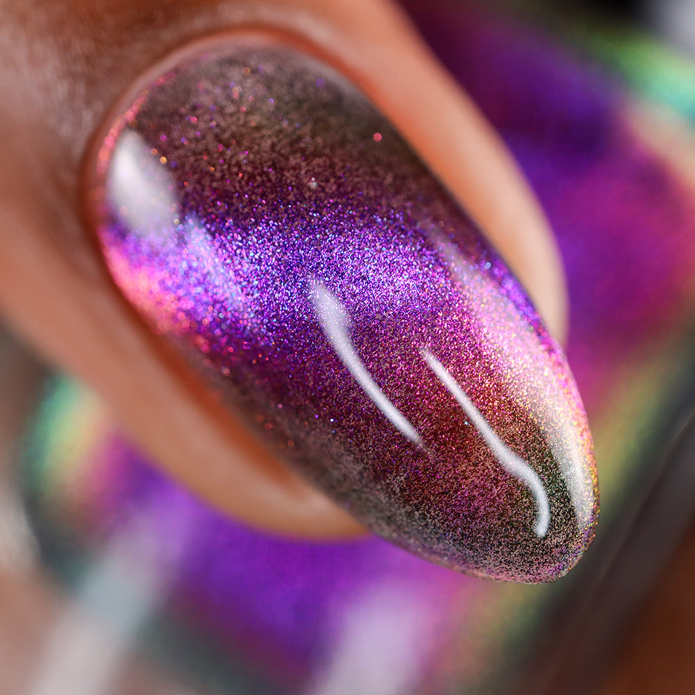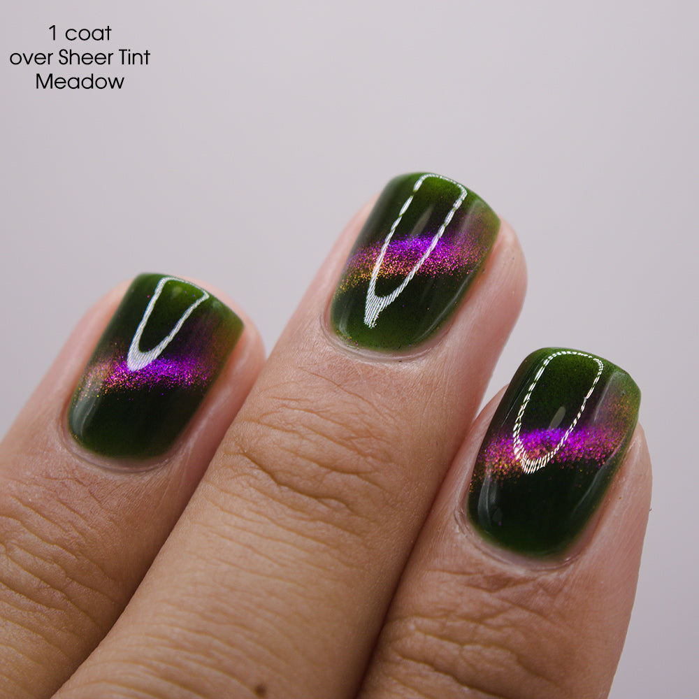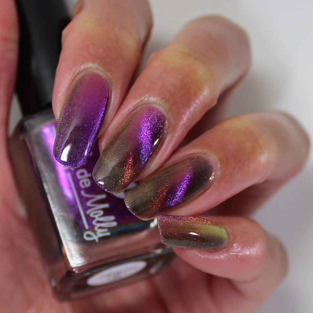 A clear nail polish with a purple / pink / gold / green shifting magnetic effect.