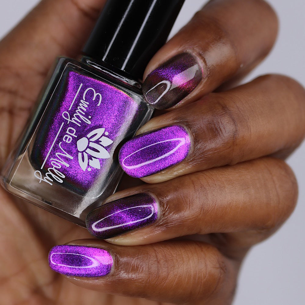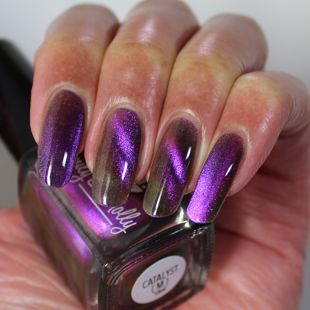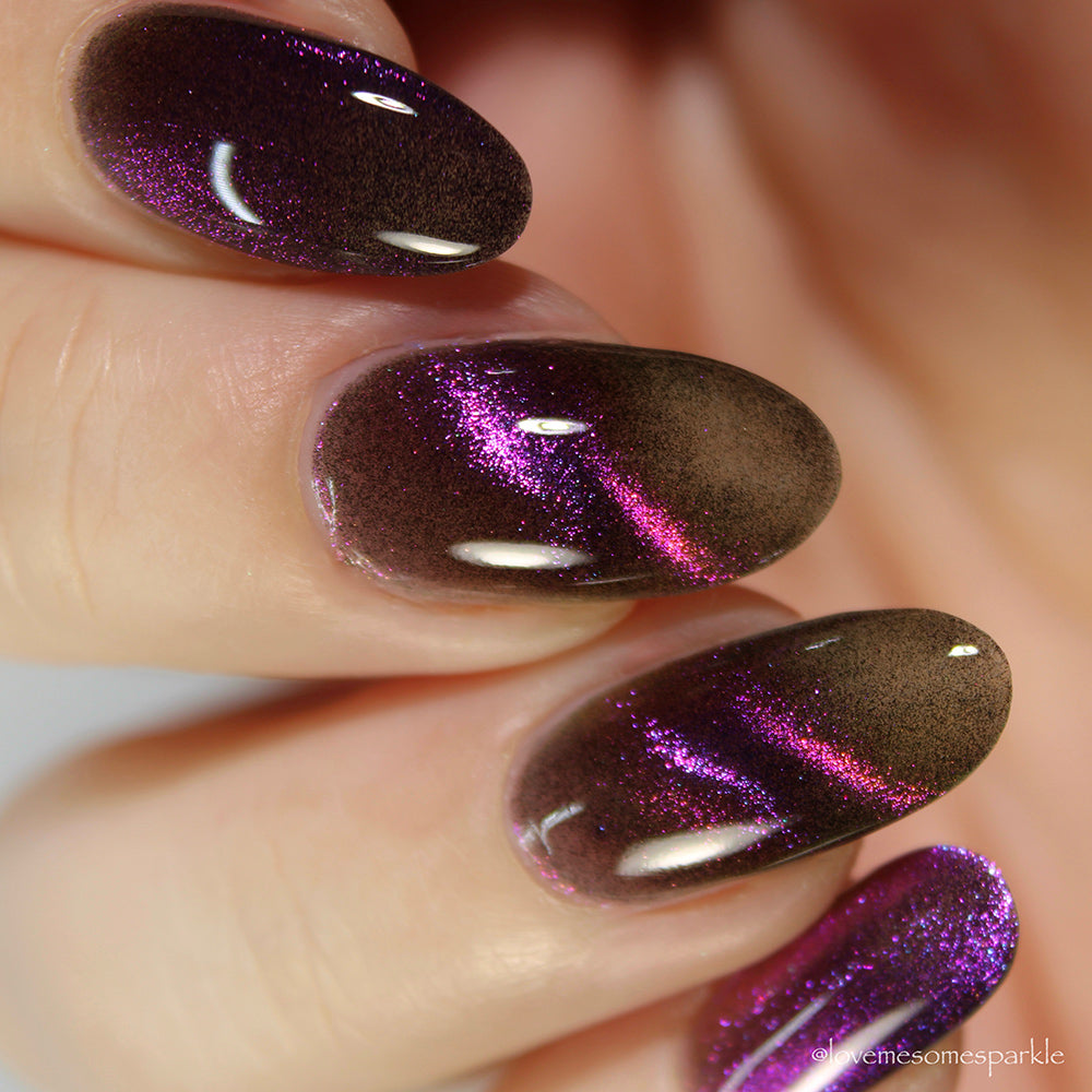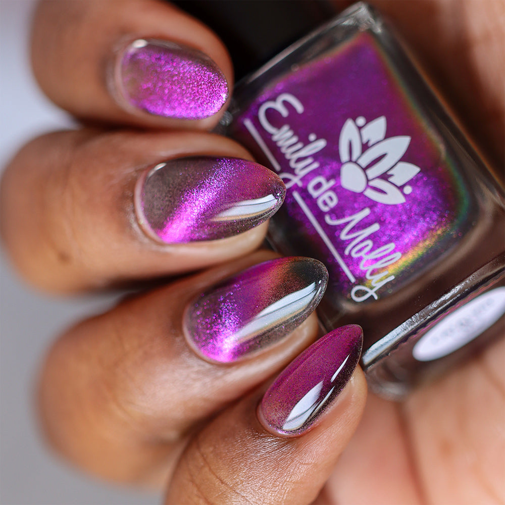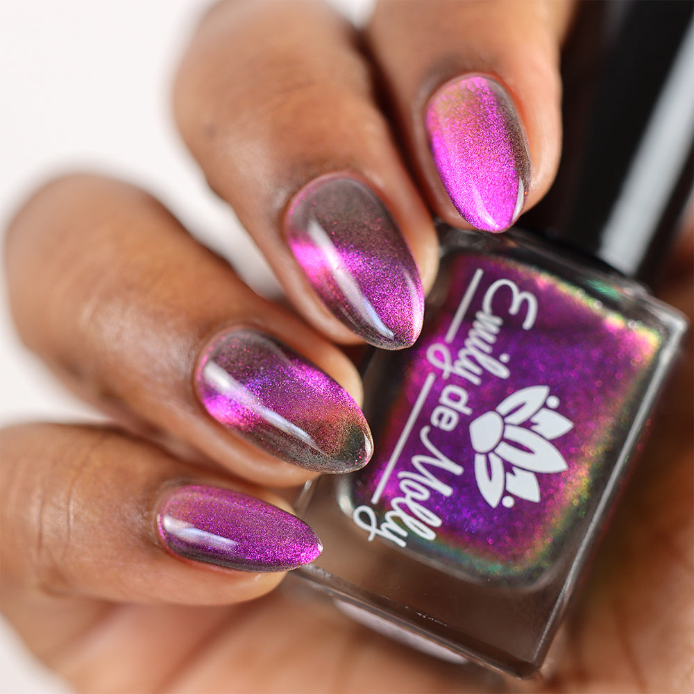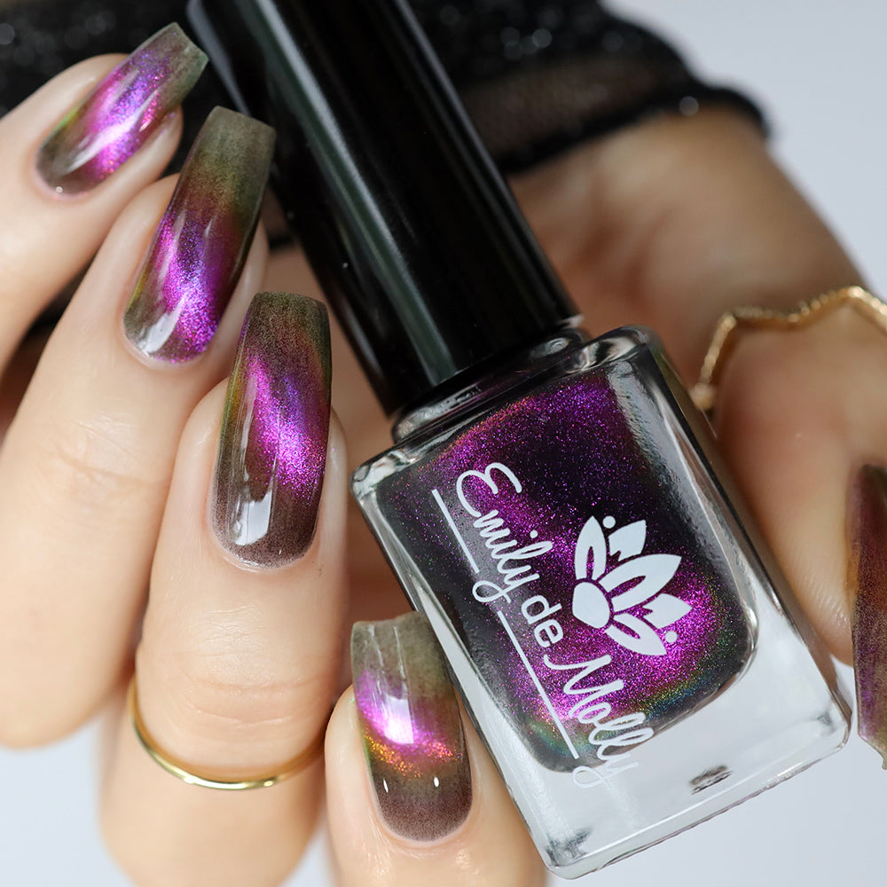 A clear nail polish with a purple / pink / gold / green shifting magnetic effect.