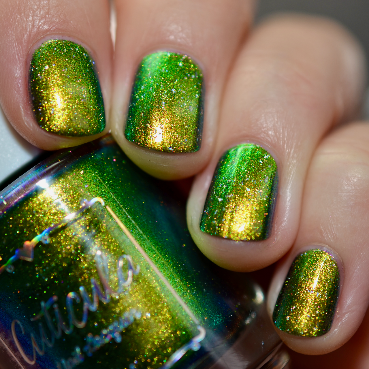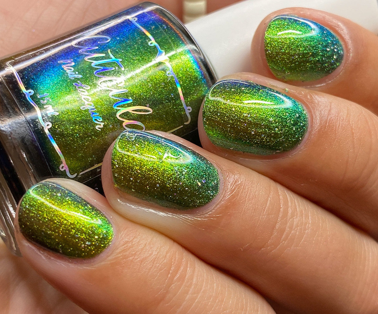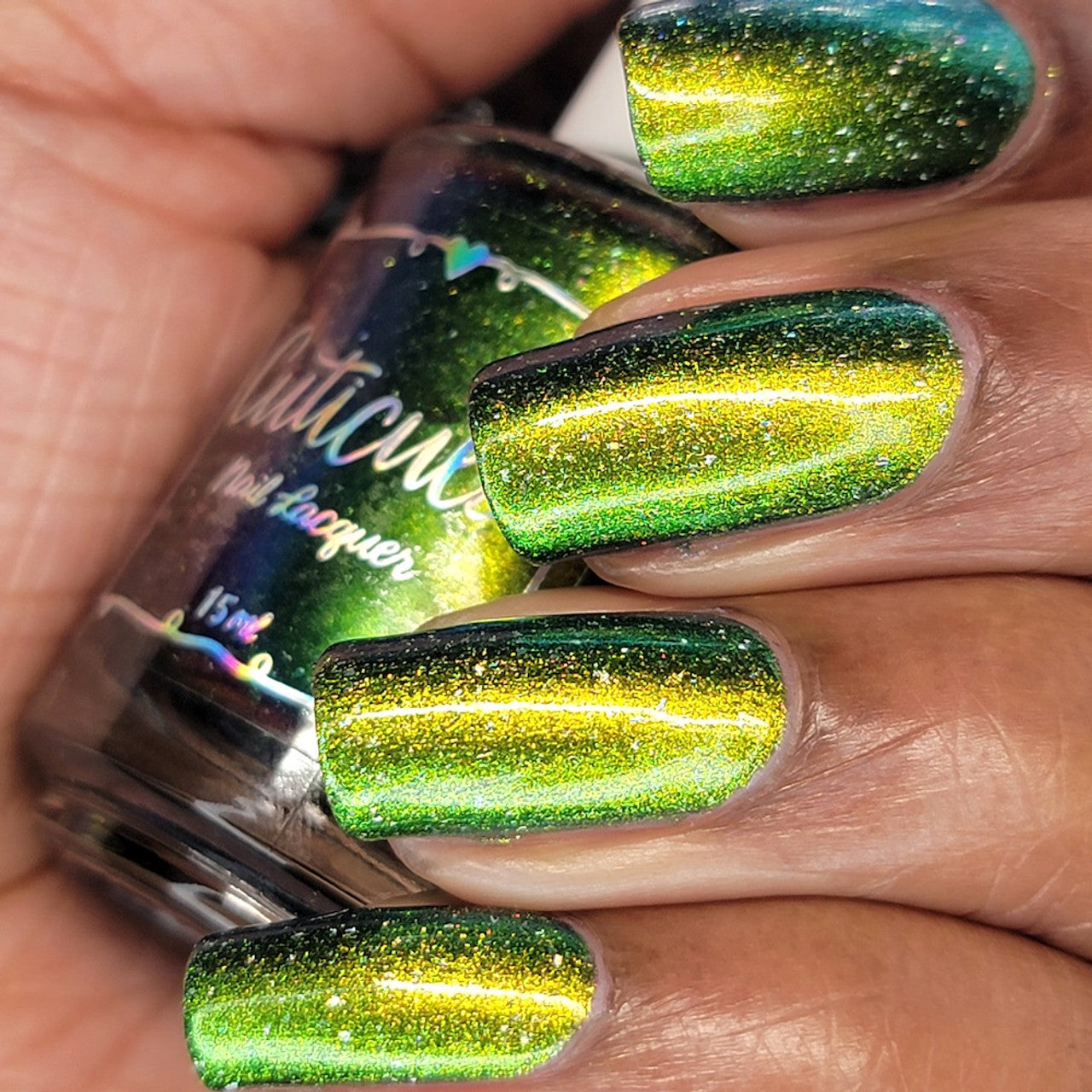 'Chromatose' is a black base with green/blue/gold shifting multichrome shimmer and silver holographic flakes.
