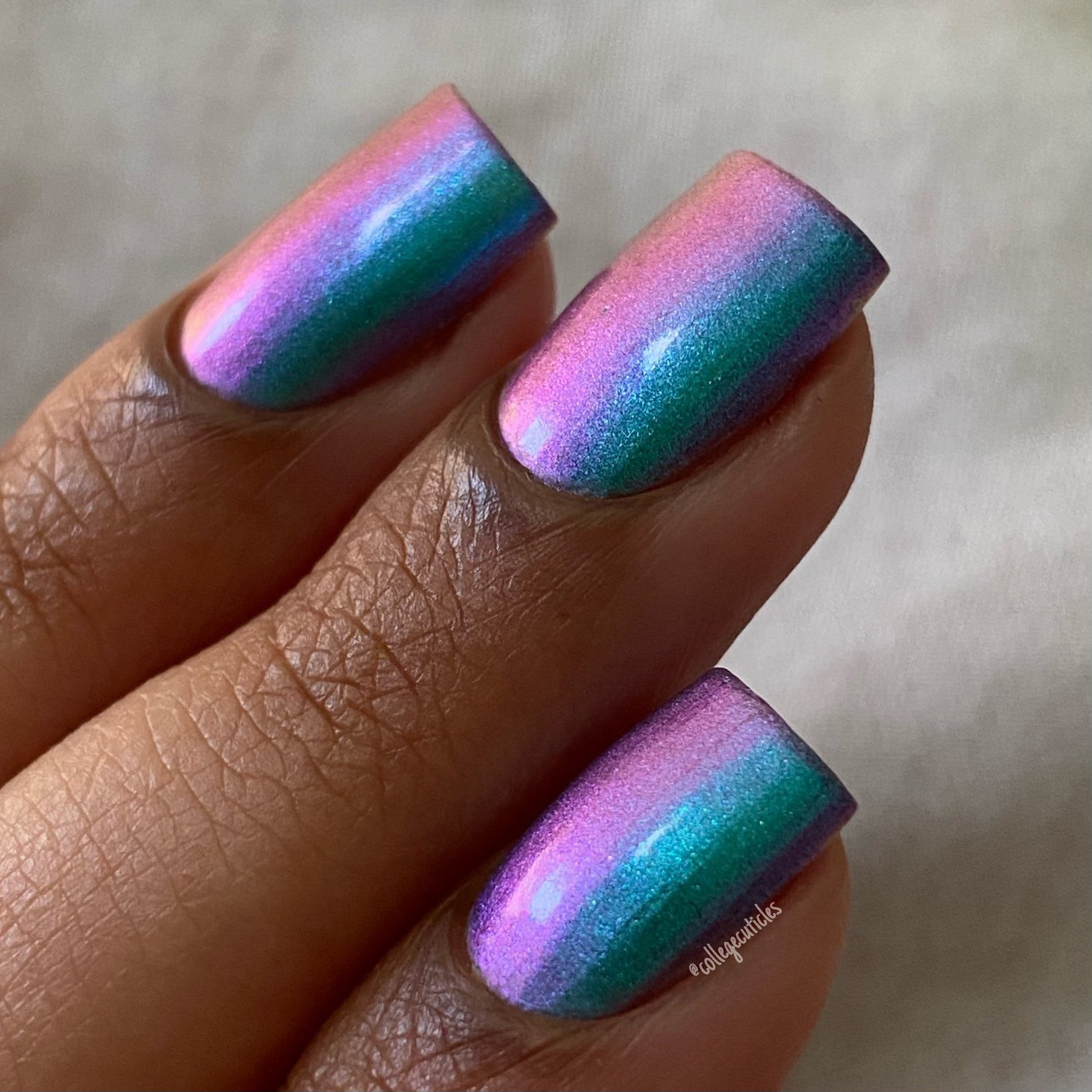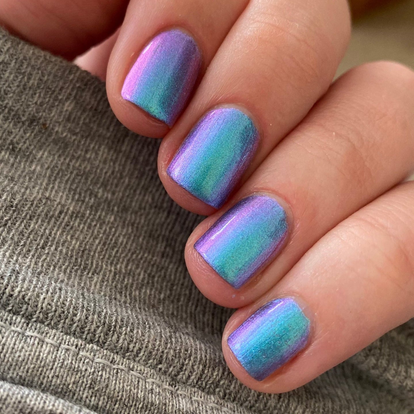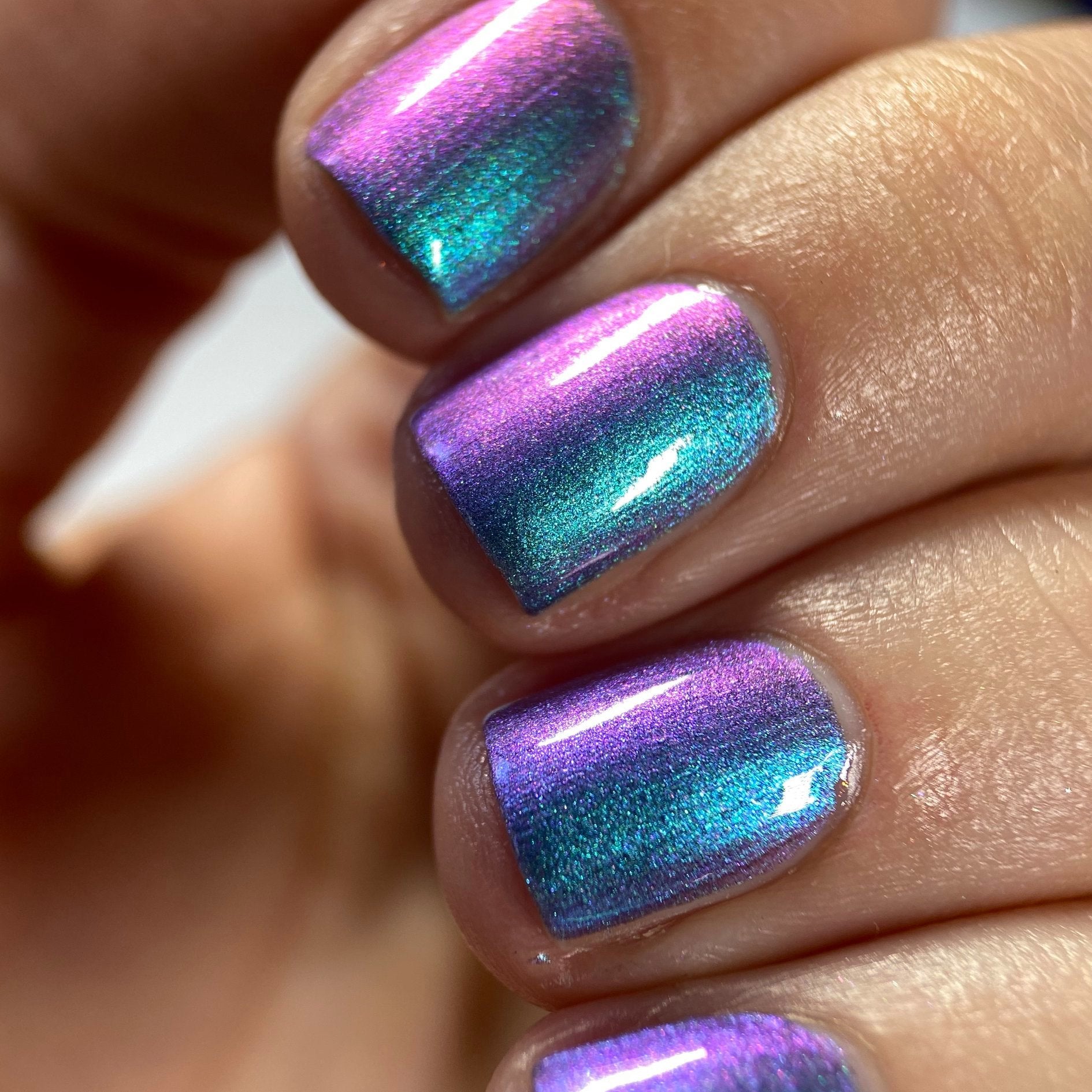Cloudburst - a pastel shifting multi chrome that shifts from teal-purple-pink-yellow (at the farthest shift). This hybrid formula combines multichrome pigment and aurora pigment making this glow in all lighting!
