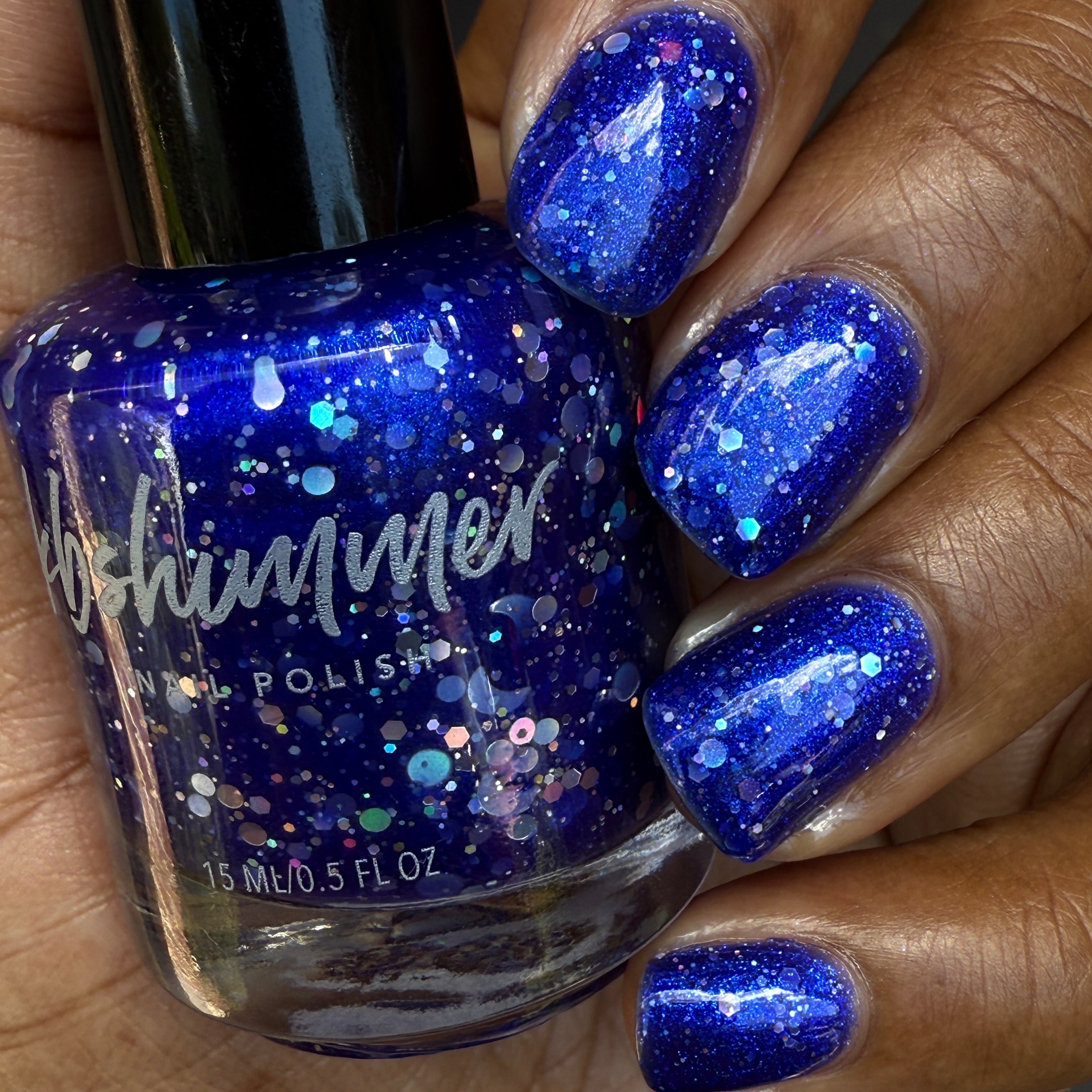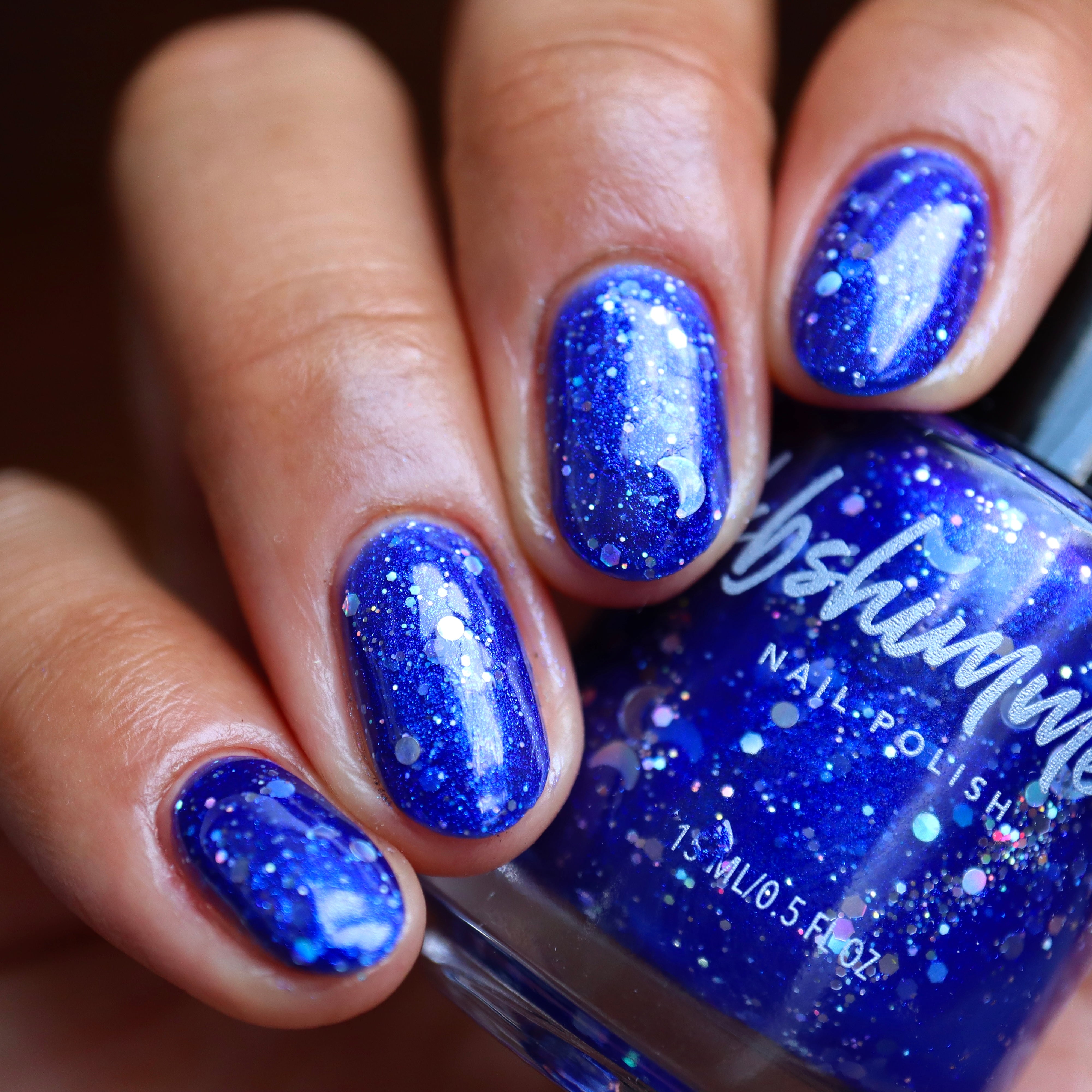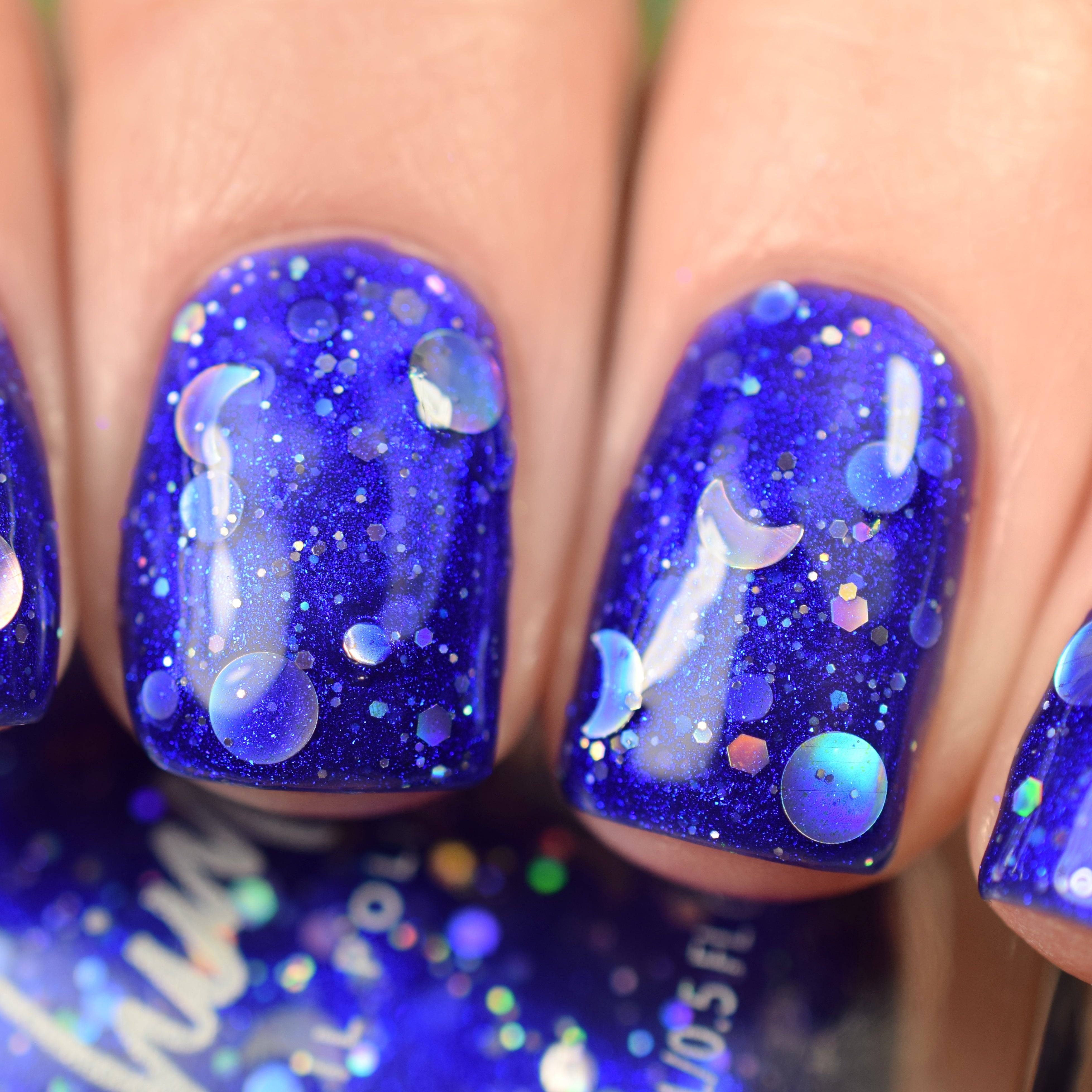 Constellation Prize is a bold and shimmery cobalt blue nail glitter nail polish. Like stars in the sky, mini silver hex holographic glitters float in the base, catching the light for an enchanting twinkle. Larger silver dots mimic stars, creating out-of-this-world sparkle. If lucky, you may catch a crescent moon, but if not, don’t worry—each polish includes a mini bag with holo silver full and crescent moons for easy nail art placement. Apply 2 coats of polish as normal, then use the polish brush or tweezers to place a moon if desired.