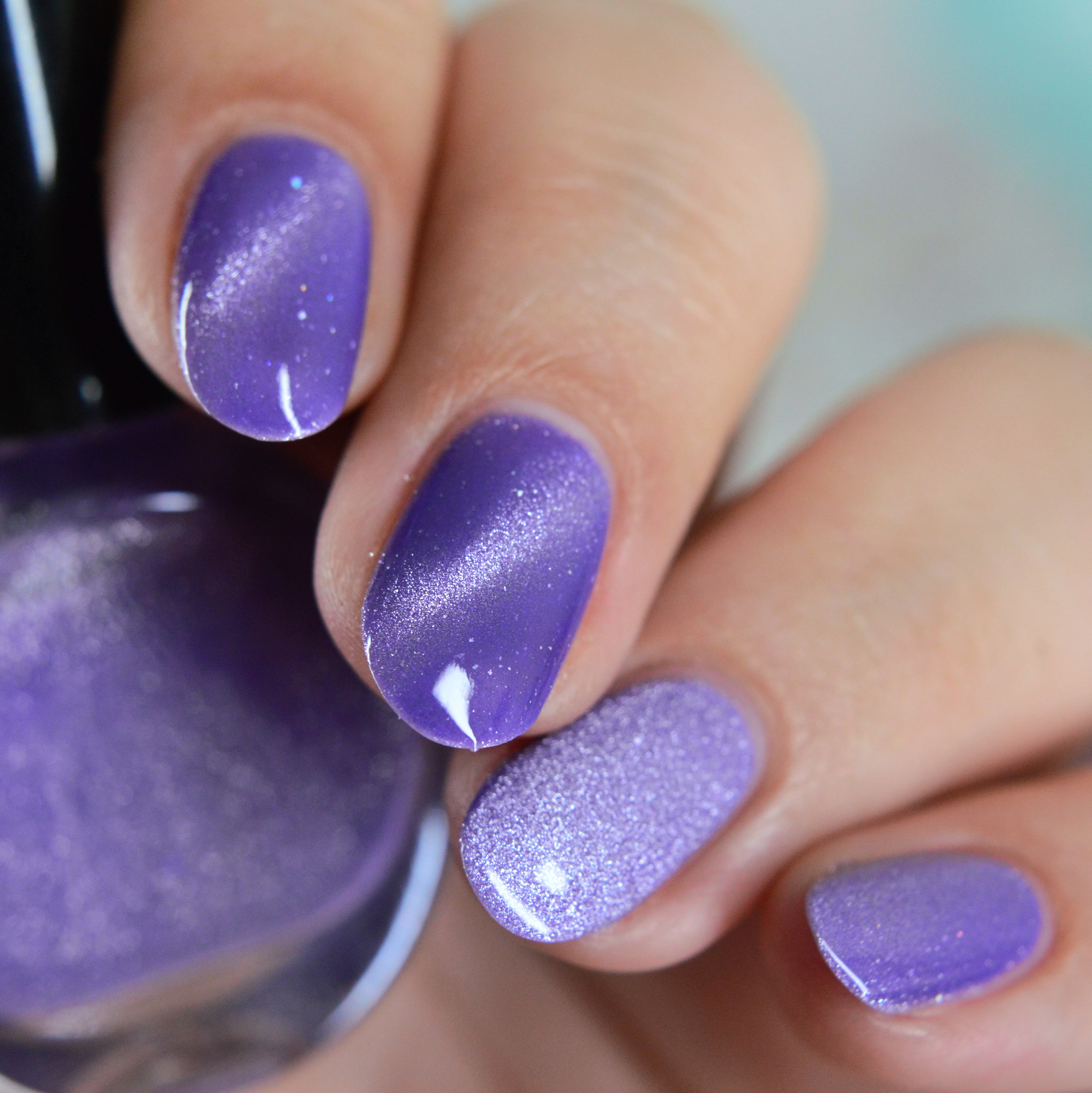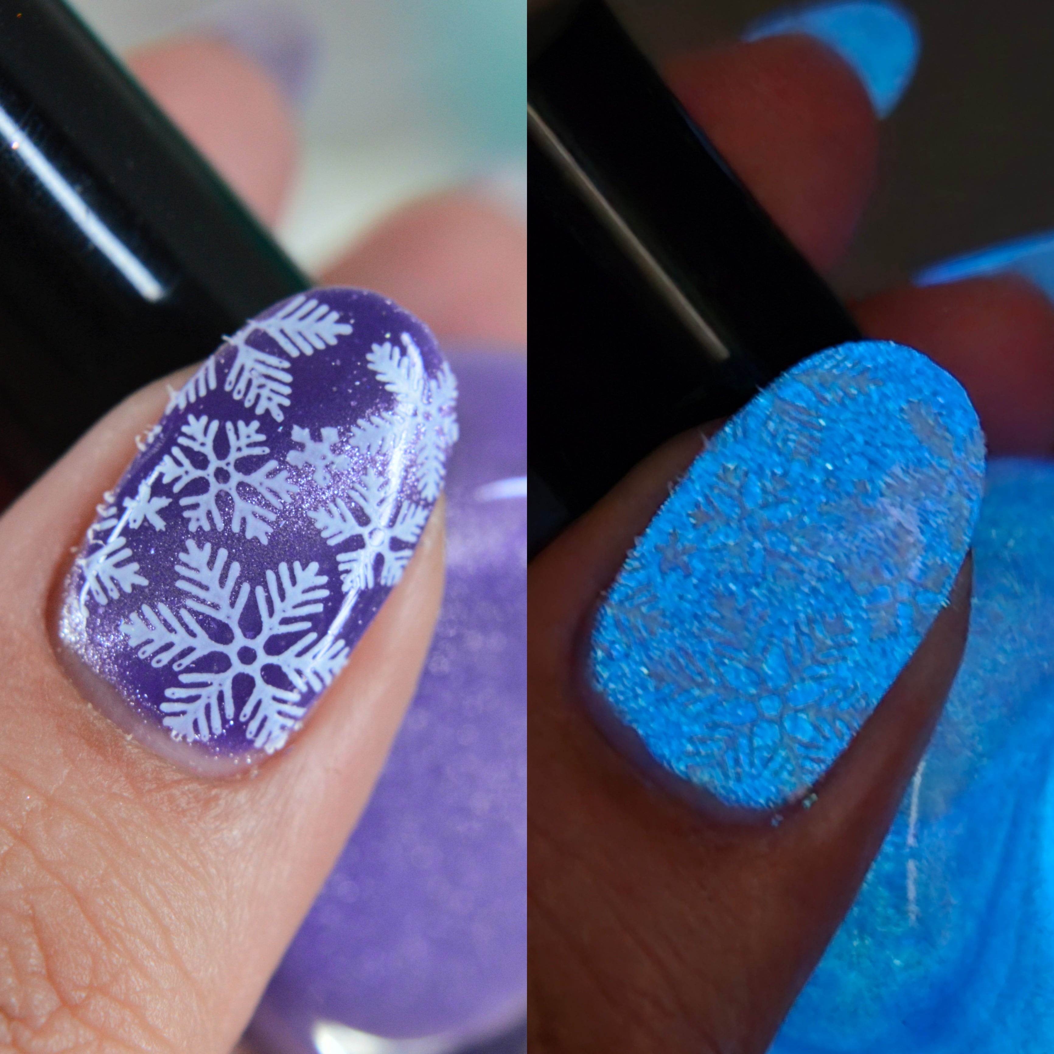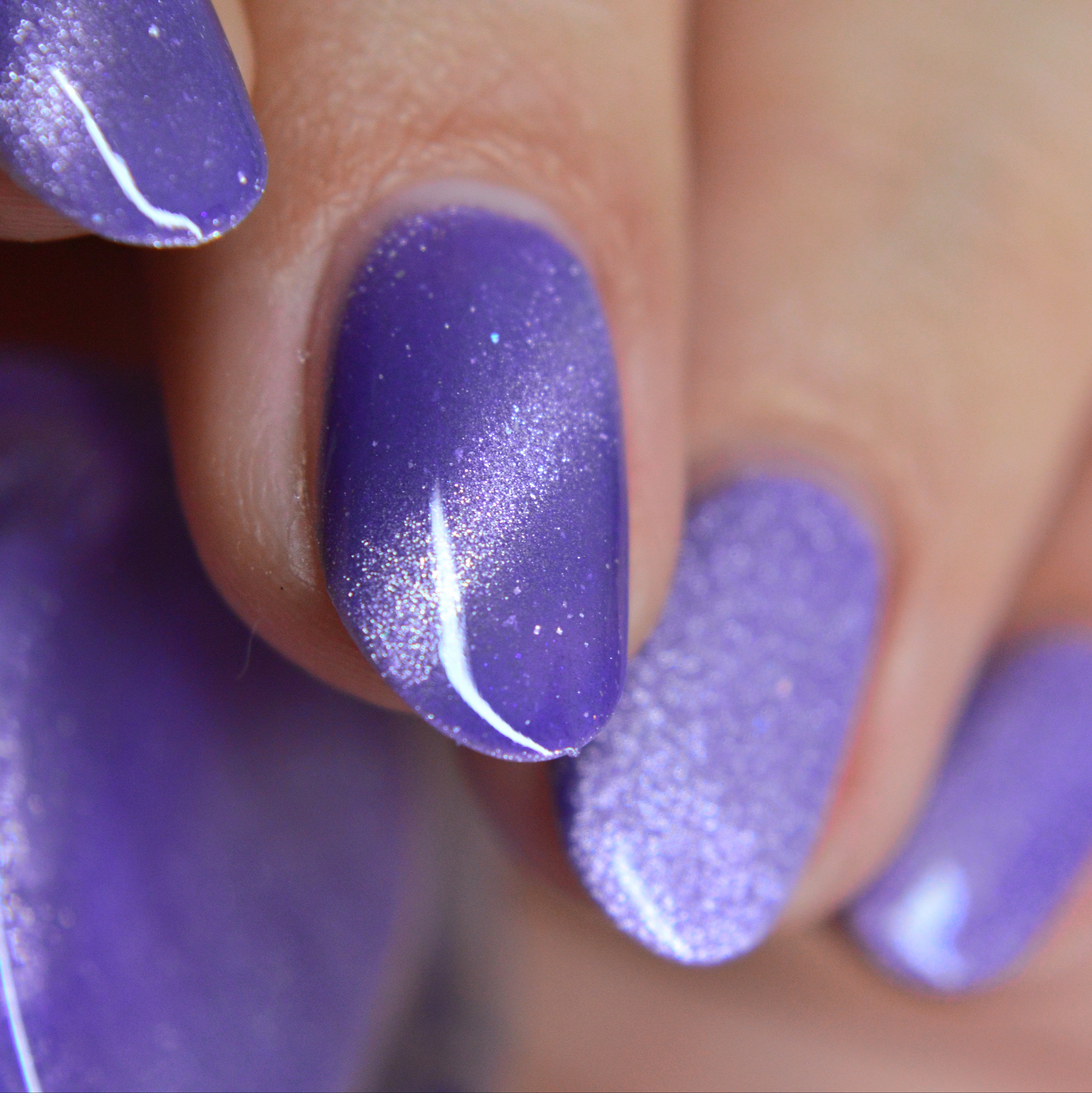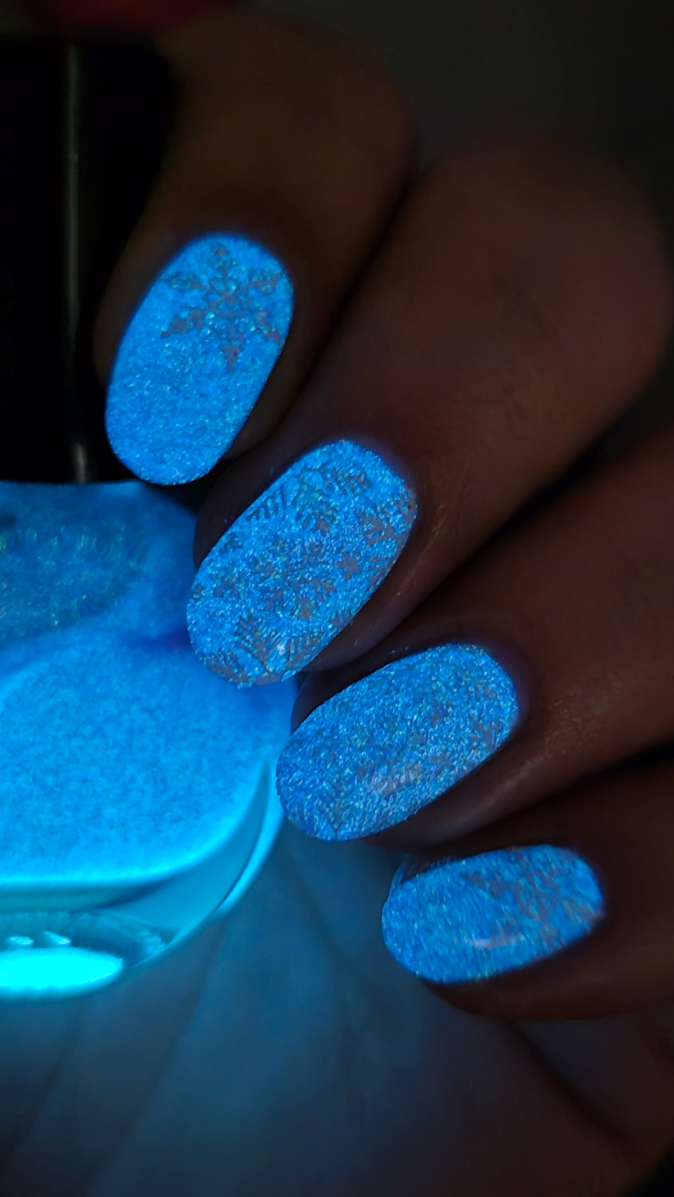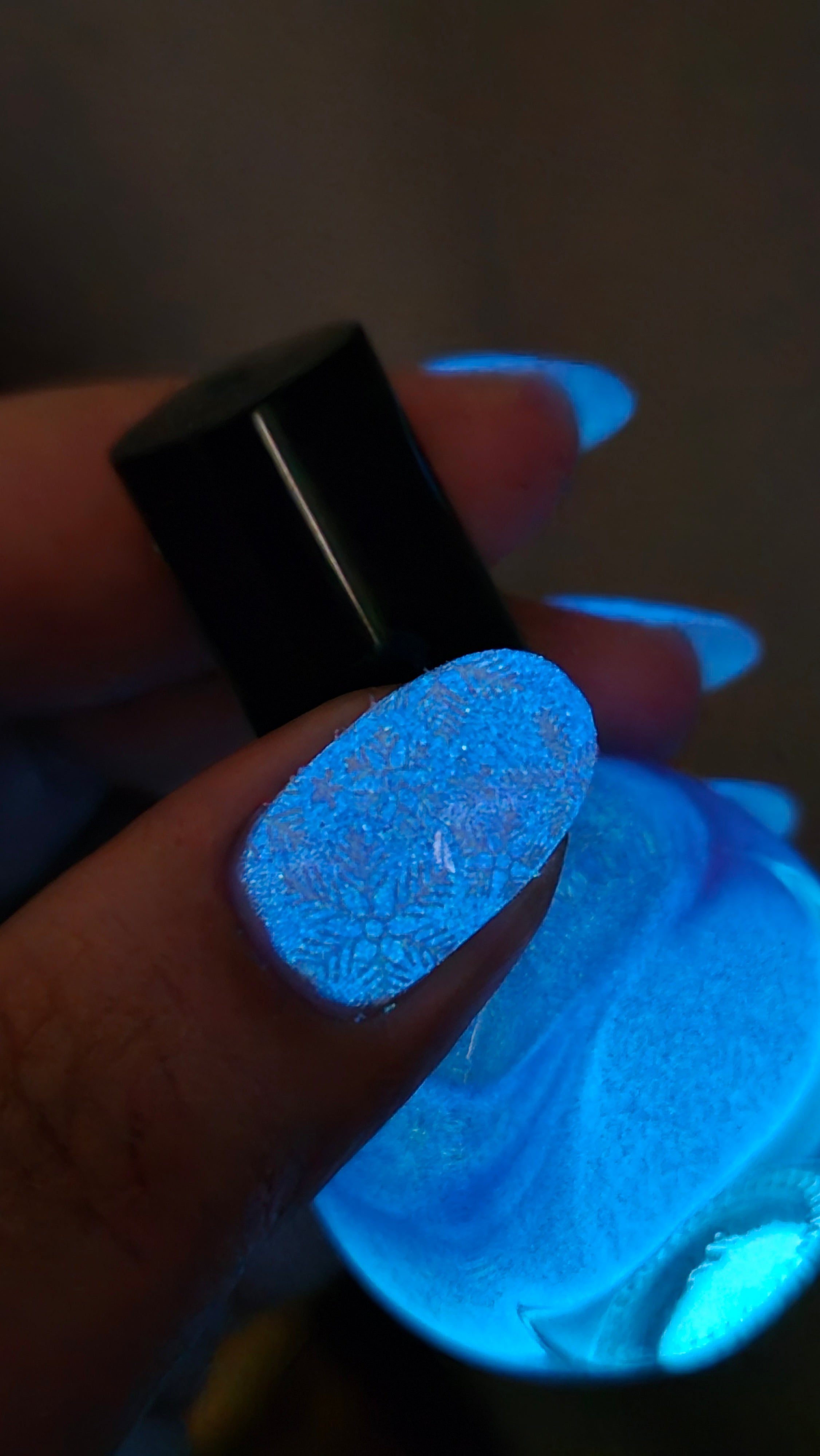 Blue to moss green solar polish with shimmery flakes, blue and black glitters.