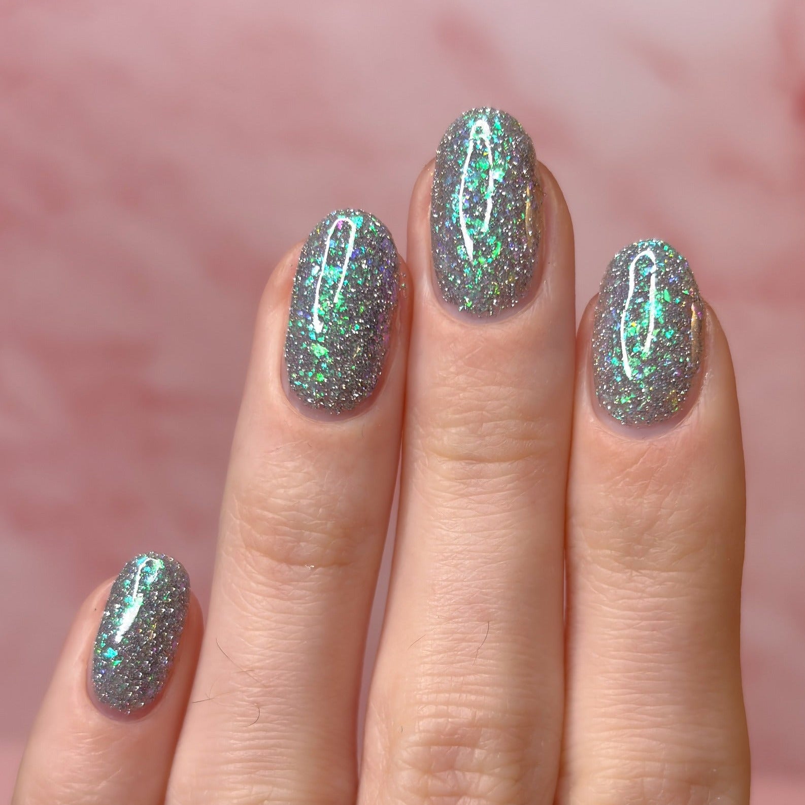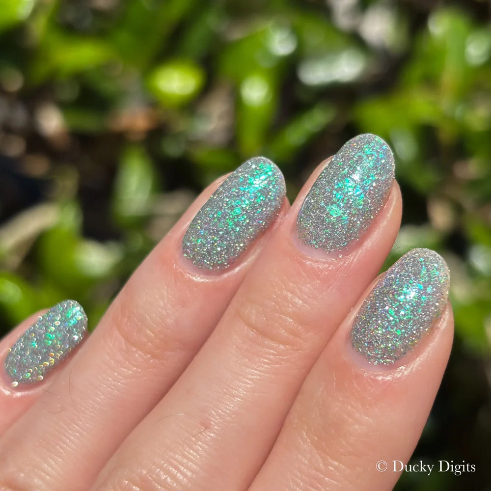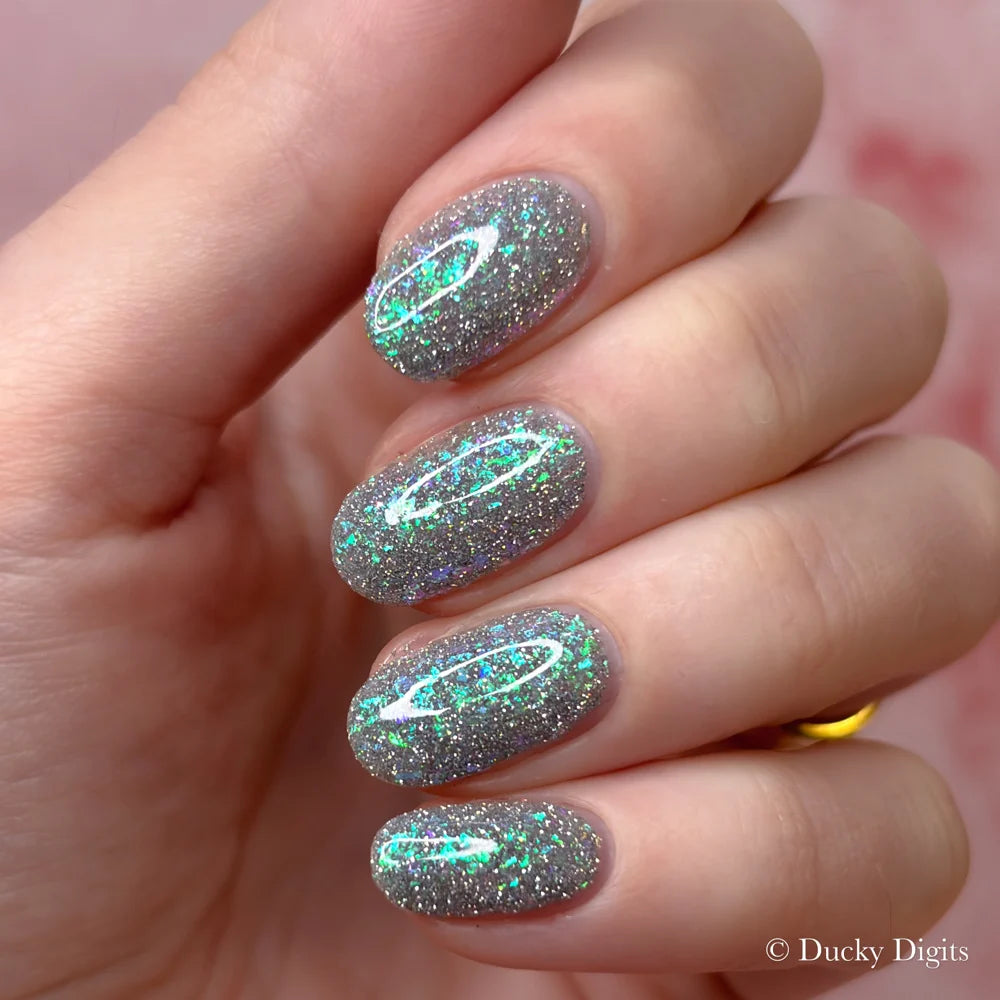 Diamond Dust – clear based polish loaded with silver reflective glitters and color shifting iridescent flakes that shift green/blue/purple/pink