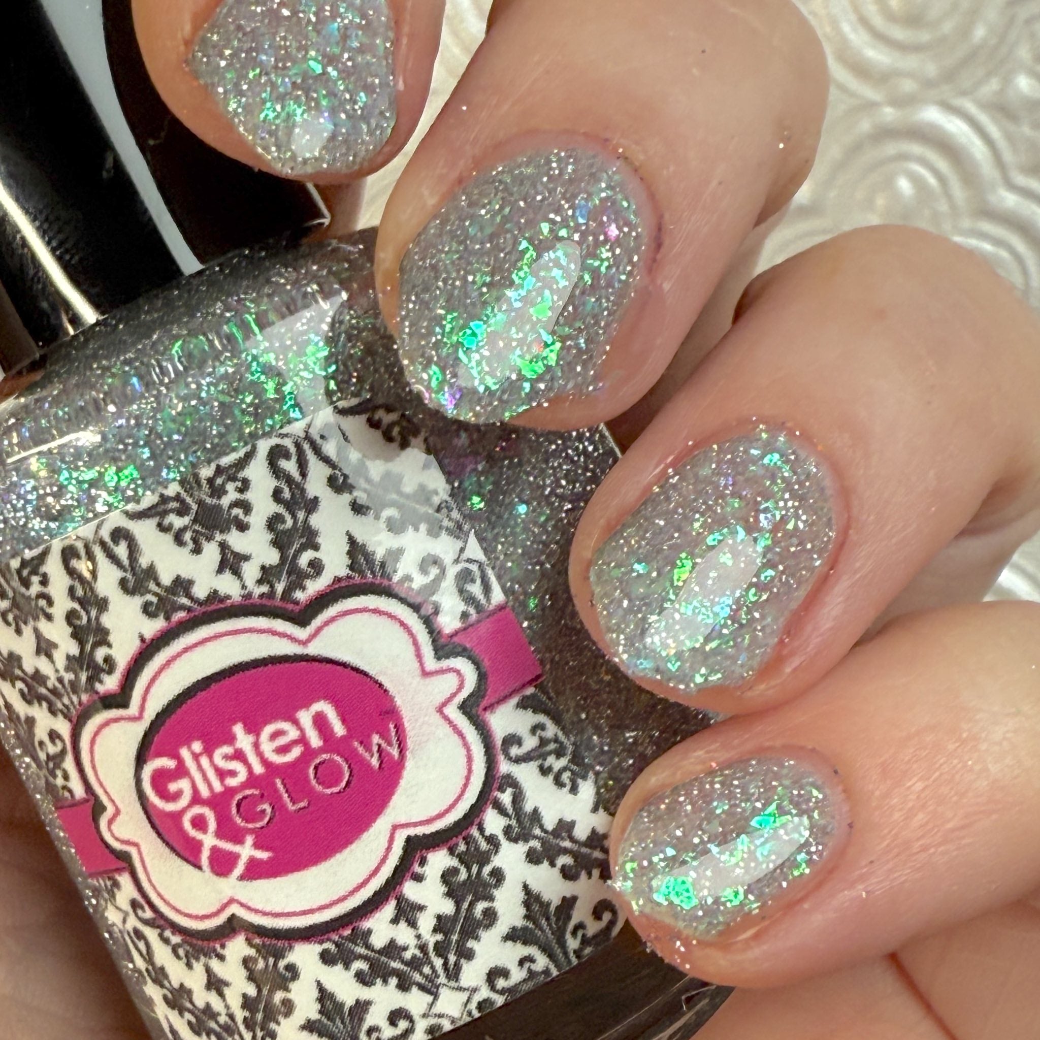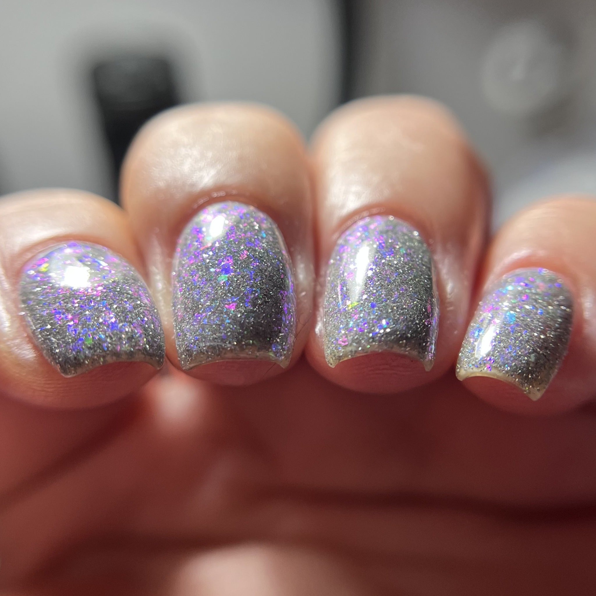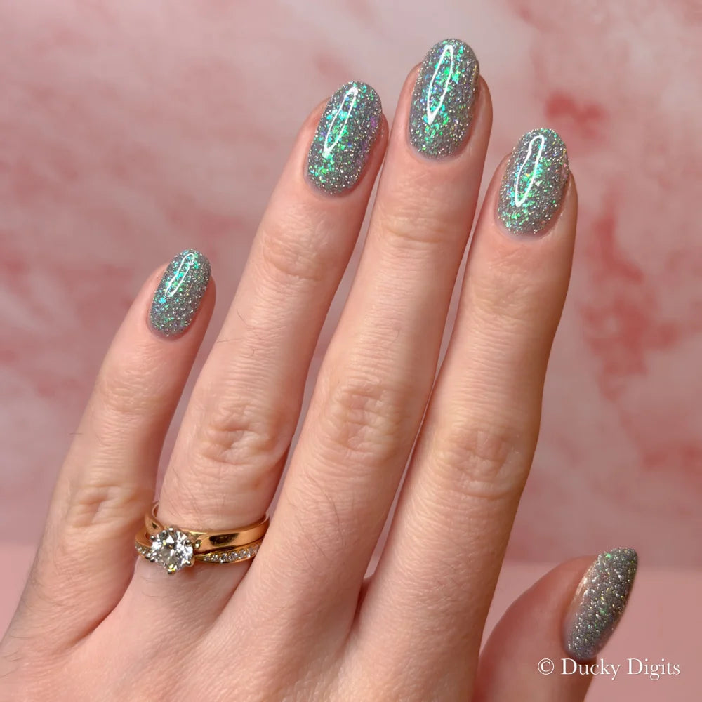 Diamond Dust – clear based polish loaded with silver reflective glitters and color shifting iridescent flakes that shift green/blue/purple/pink