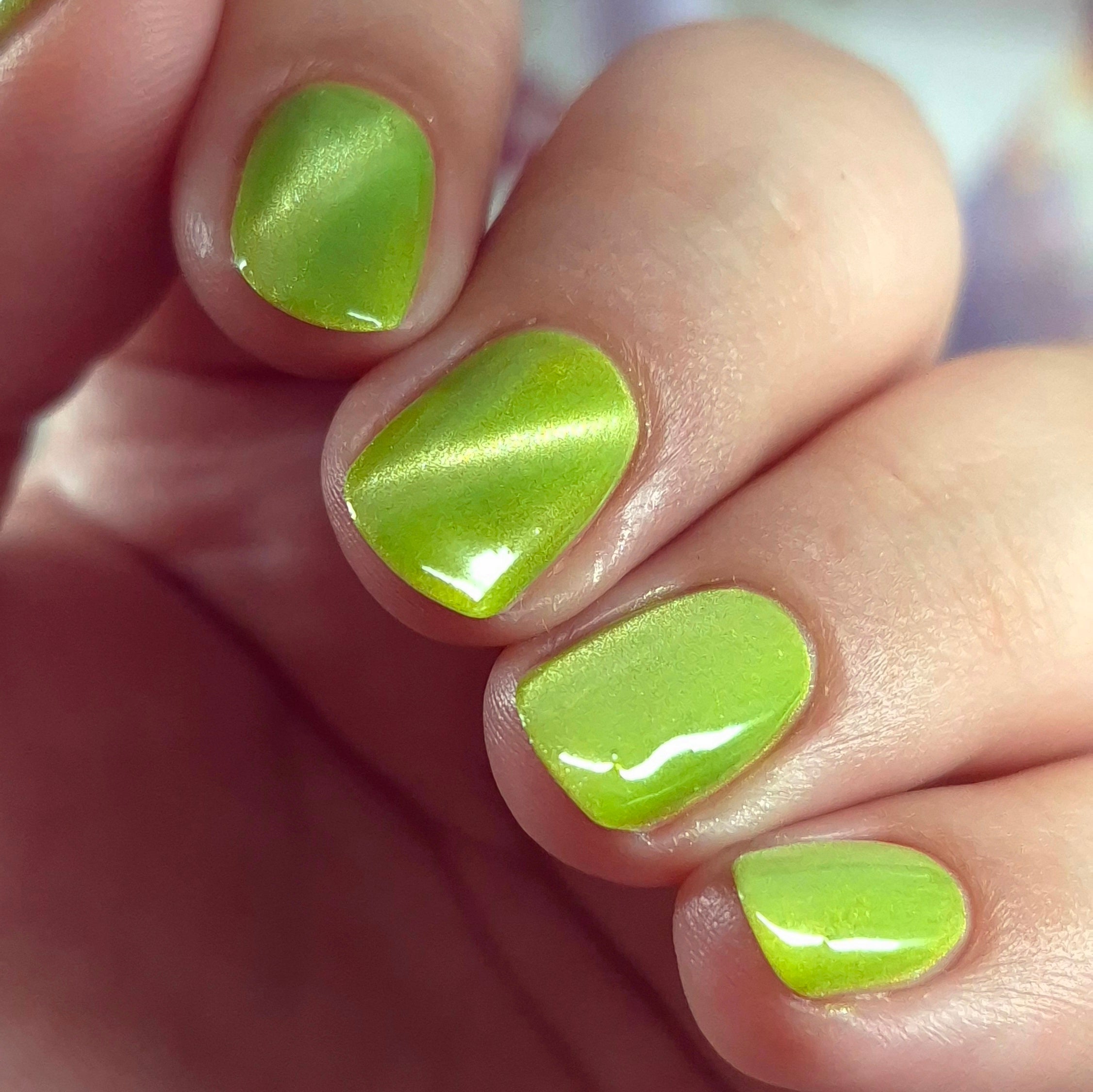 Blue to moss green solar polish with shimmery flakes, blue and black glitters.