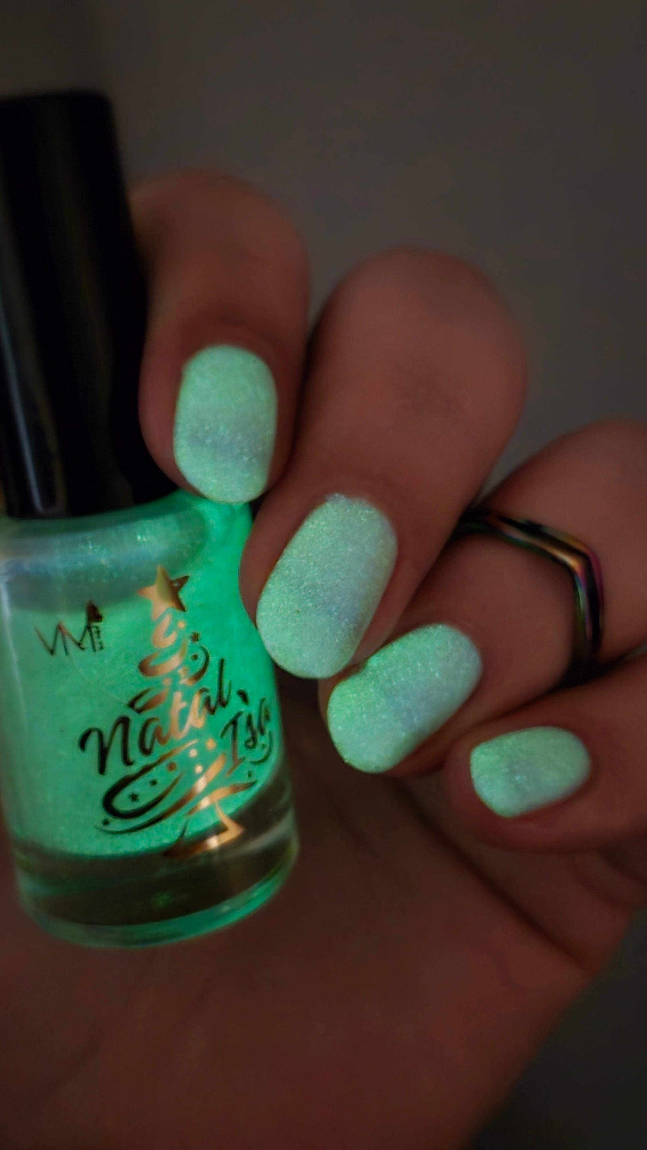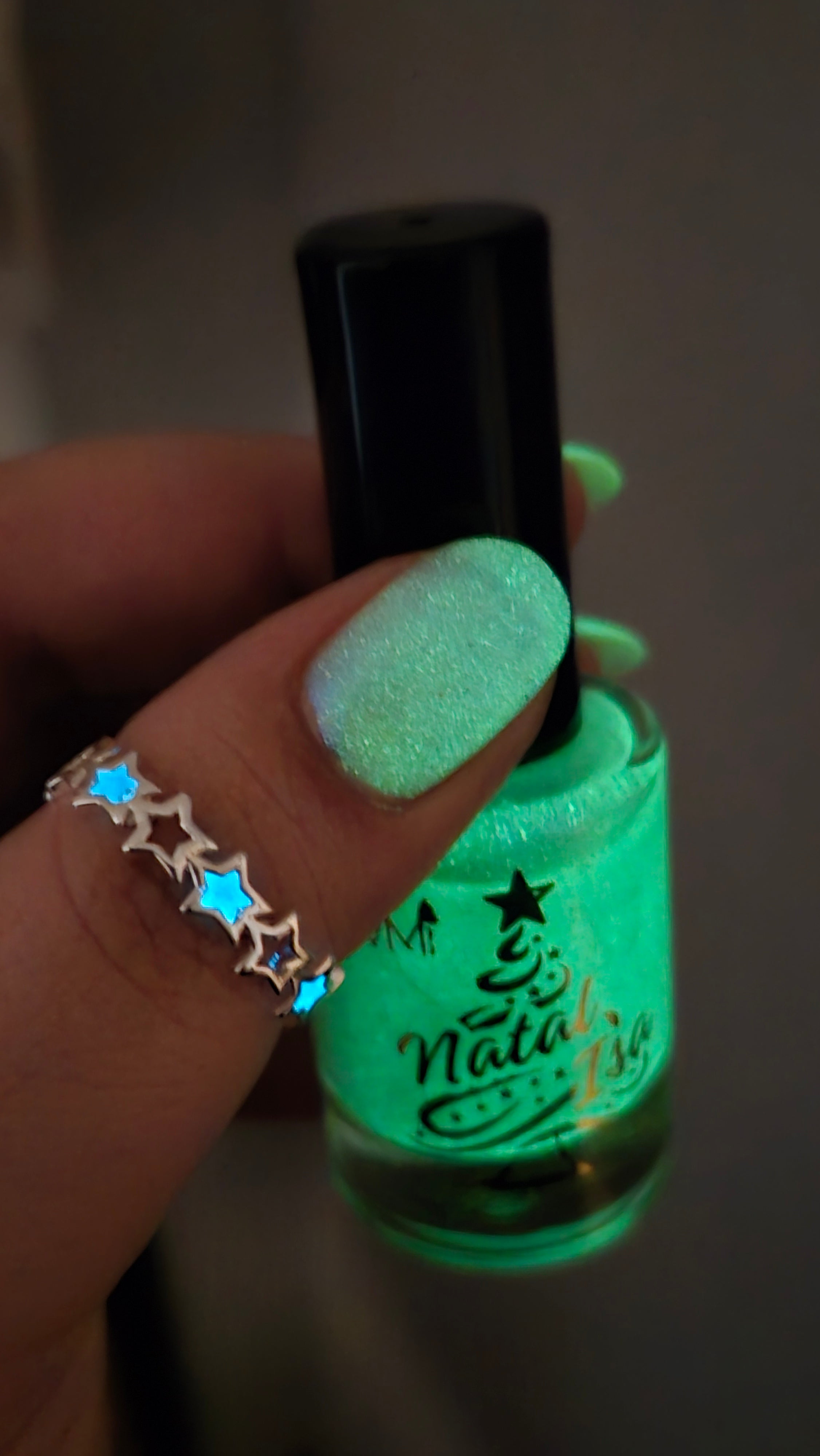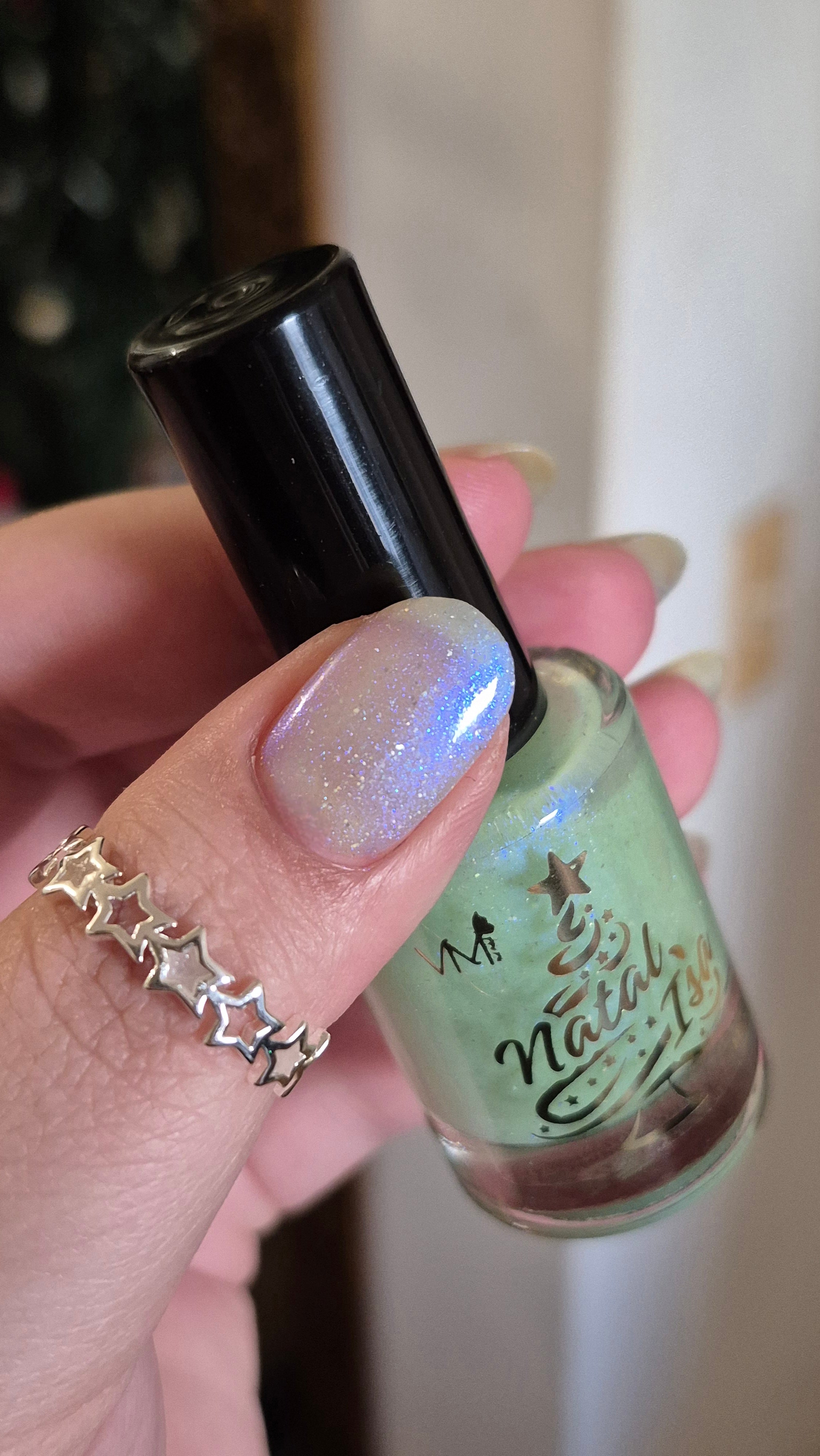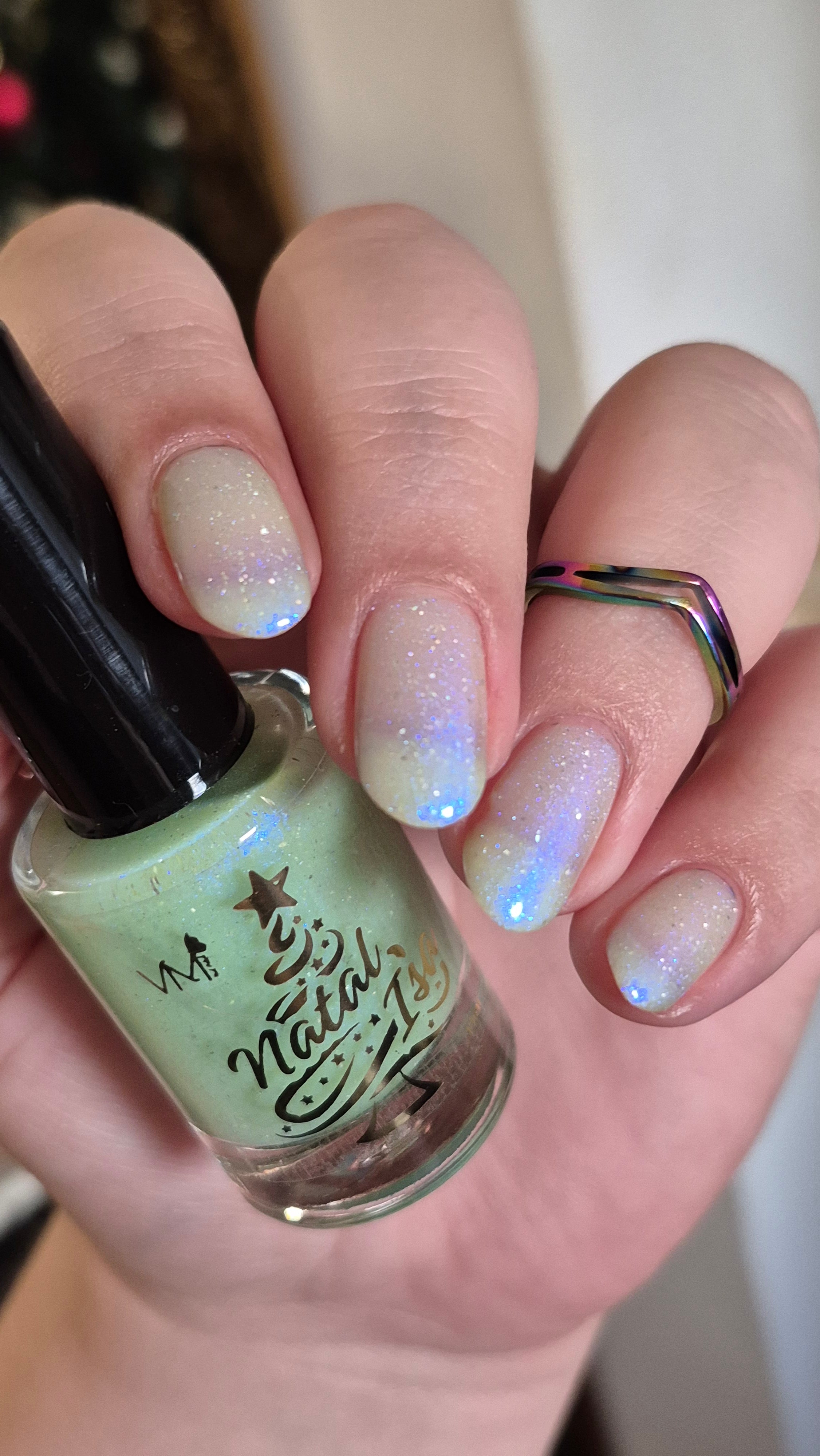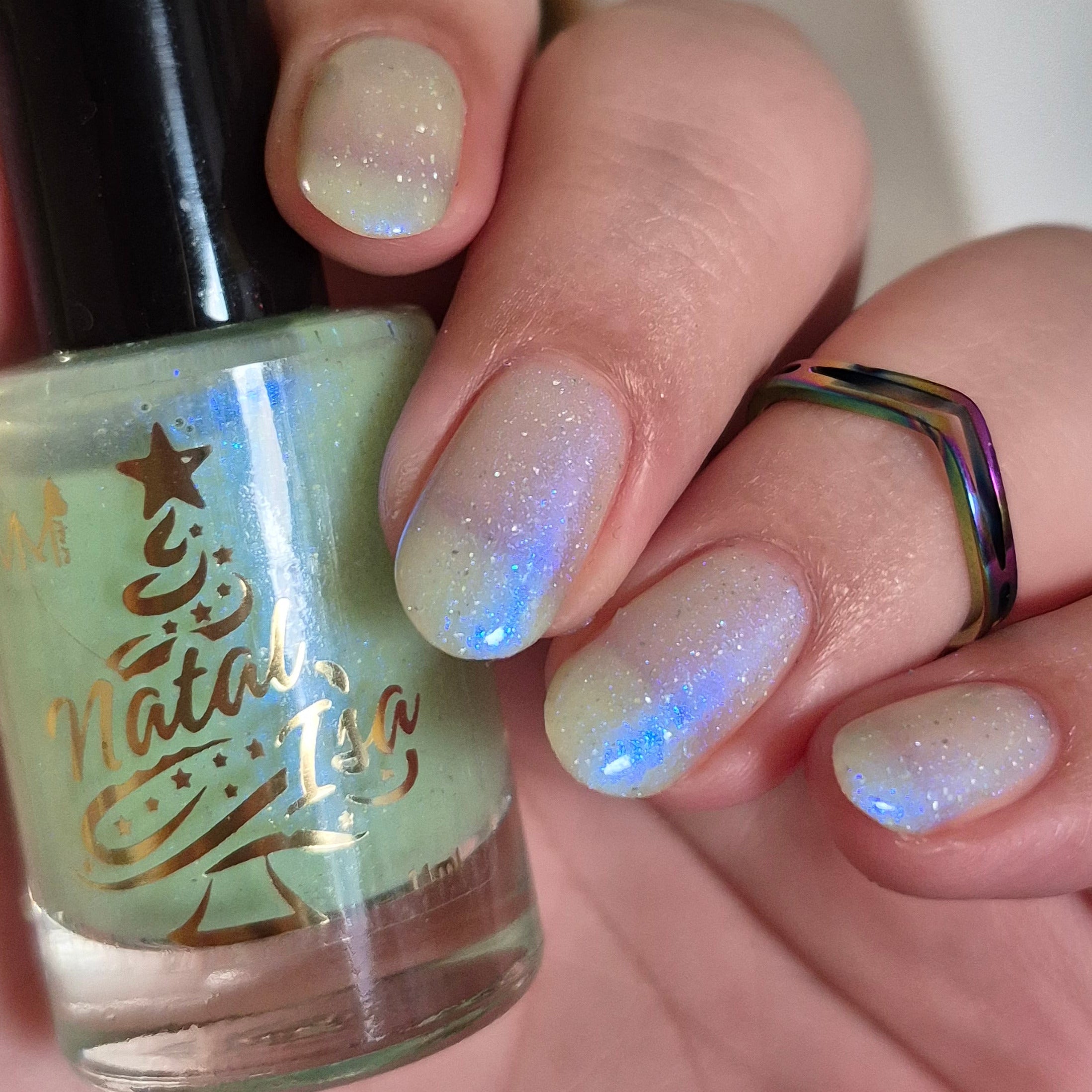Blue to moss green solar polish with shimmery flakes, blue and black glitters.