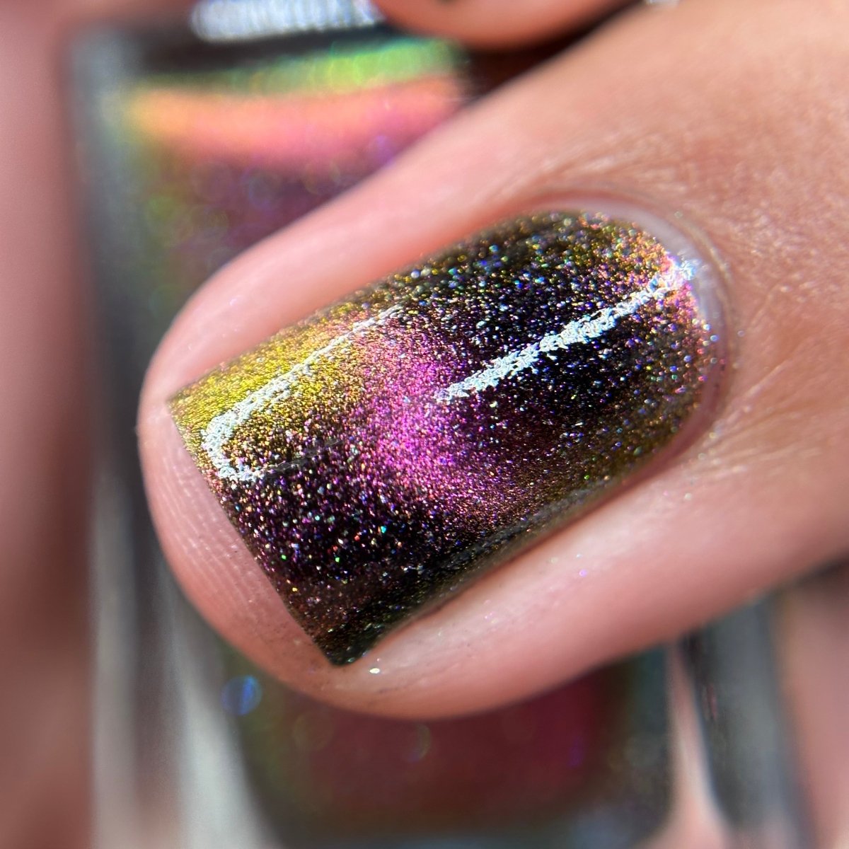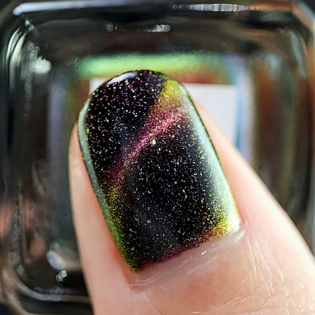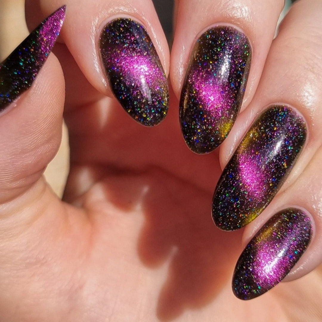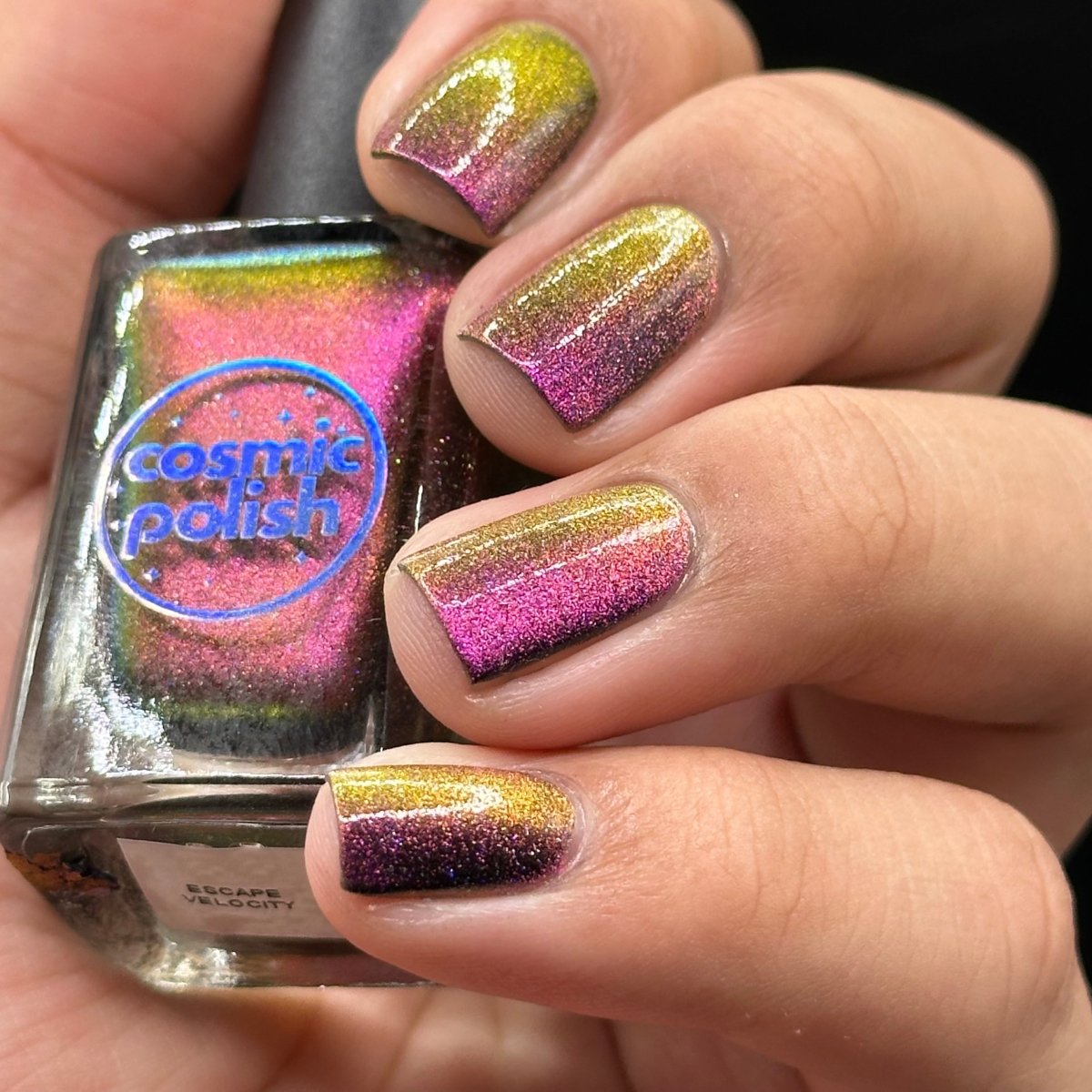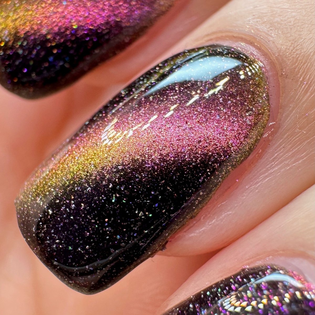 Launch at a dizzying rate with this polish! Escape Velocity is a black-based magnetic polish with a pink to gold shifting stripe and scattered holo. Become a gorgeous bright streak of colour and light at this speed - gravity is no match for your nails!