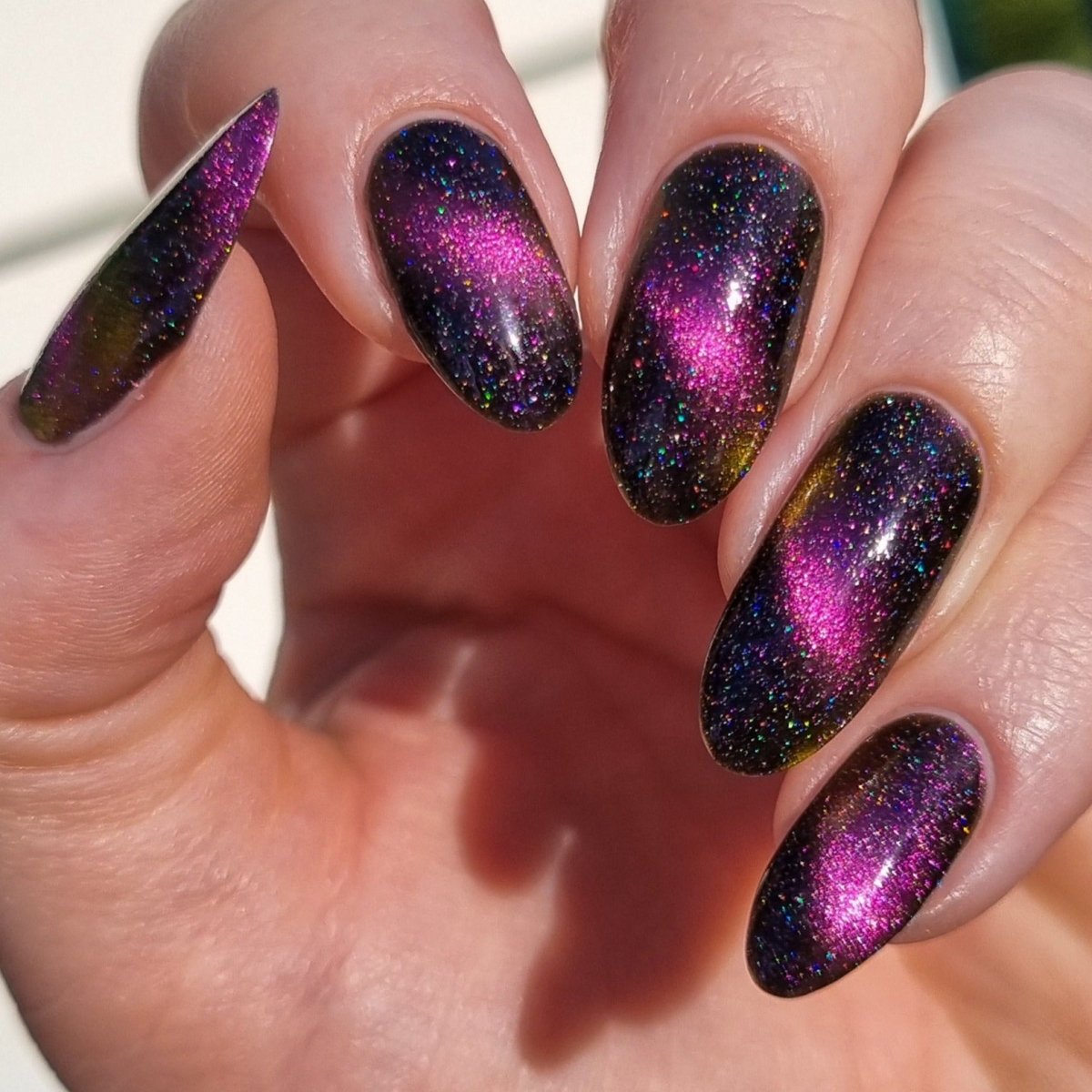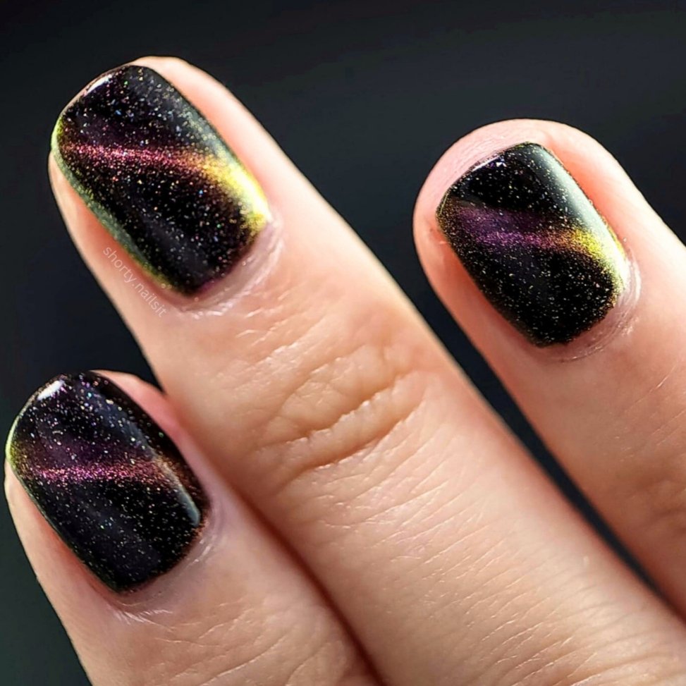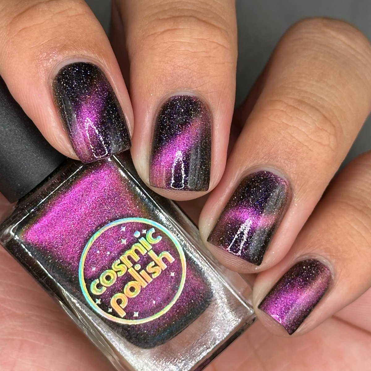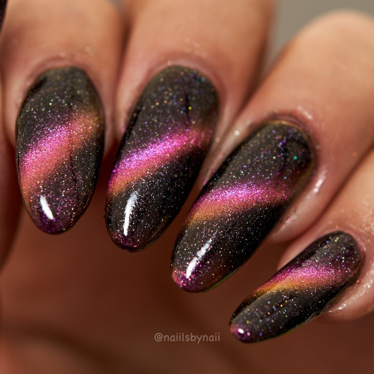 Launch at a dizzying rate with this polish! Escape Velocity is a black-based magnetic polish with a pink to gold shifting stripe and scattered holo. Become a gorgeous bright streak of colour and light at this speed - gravity is no match for your nails!