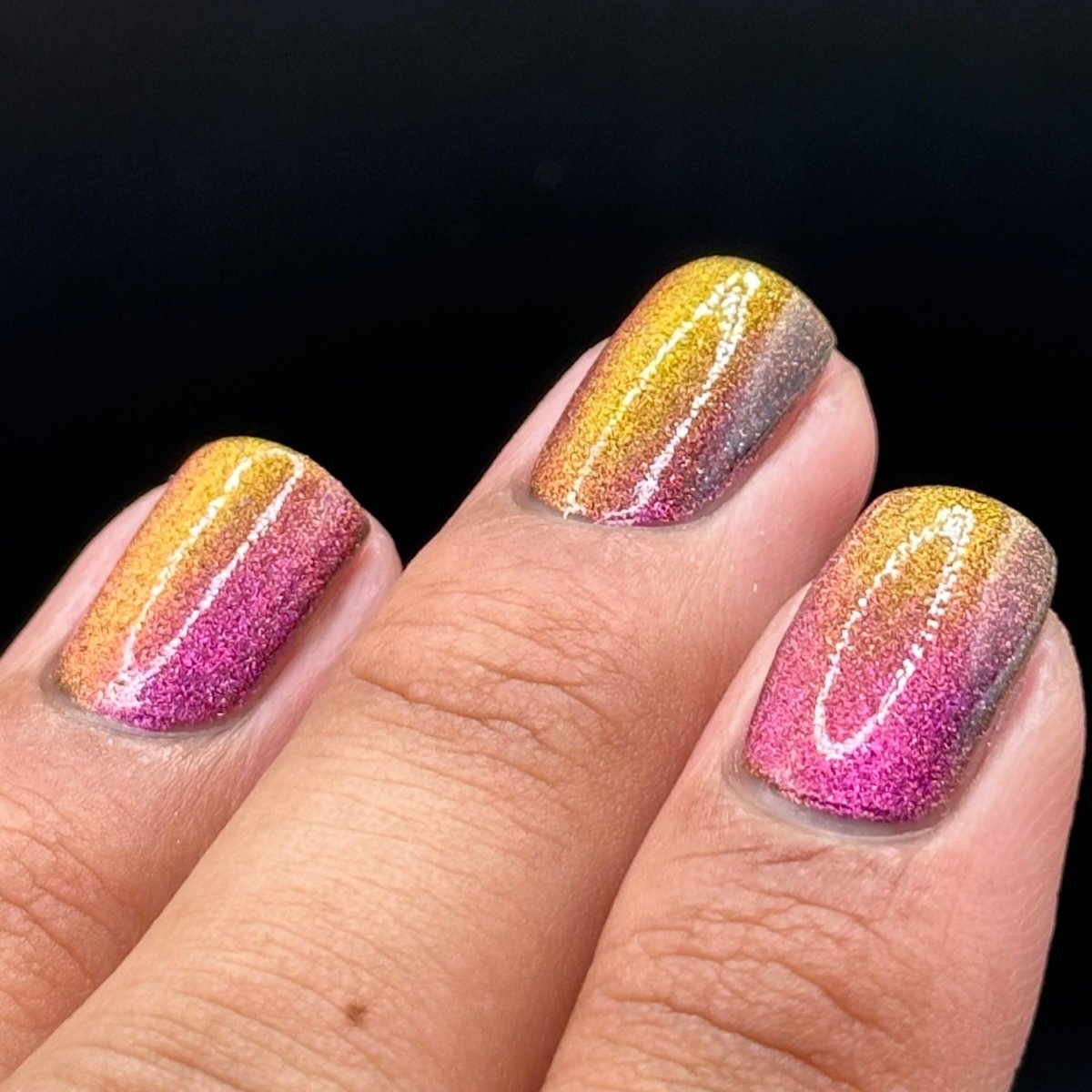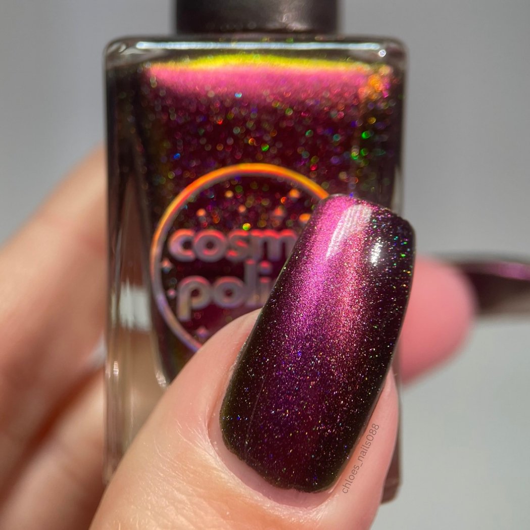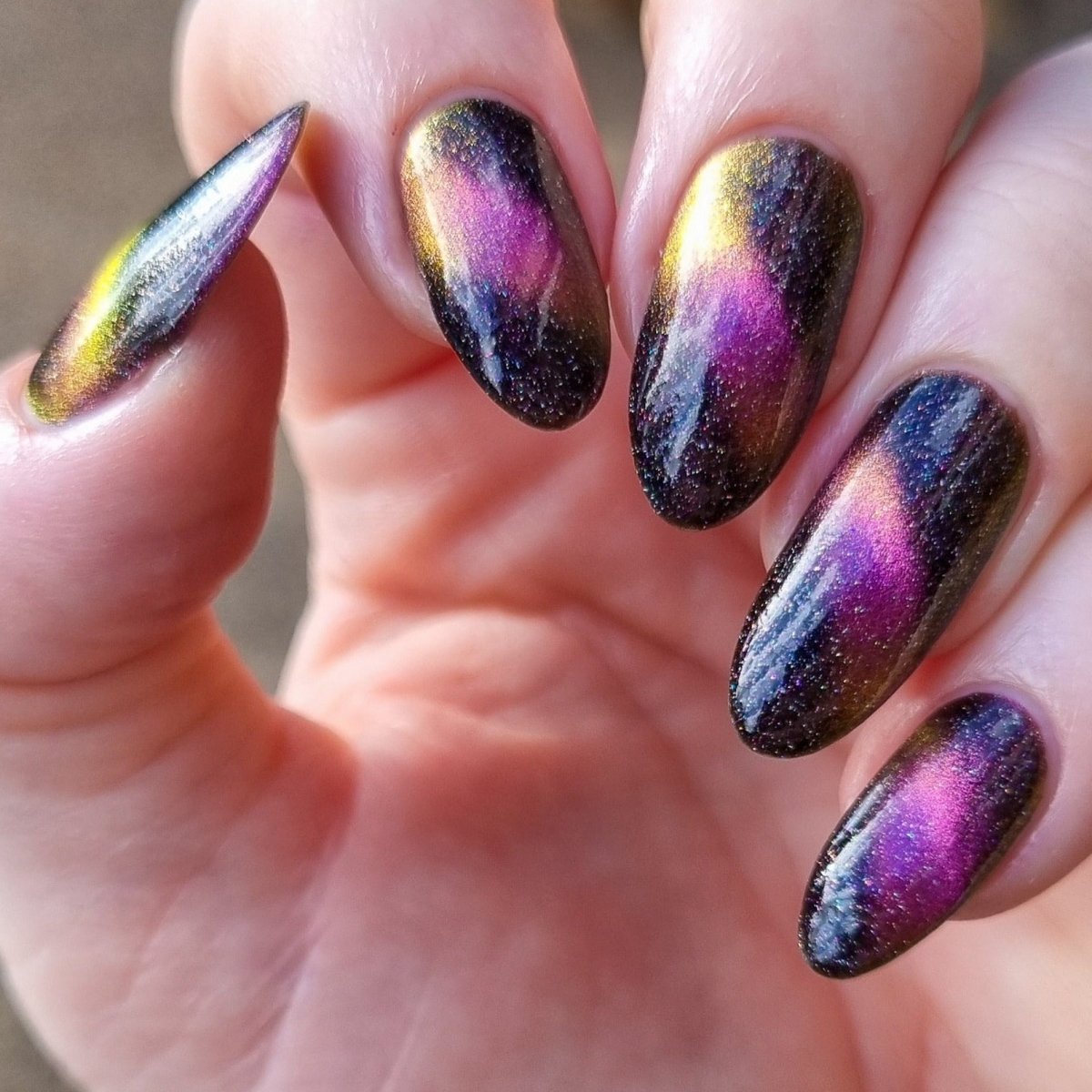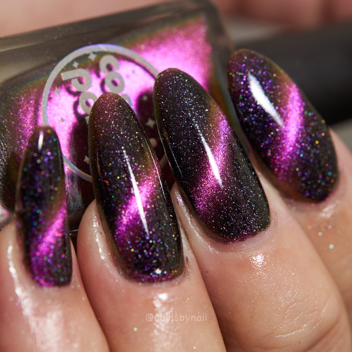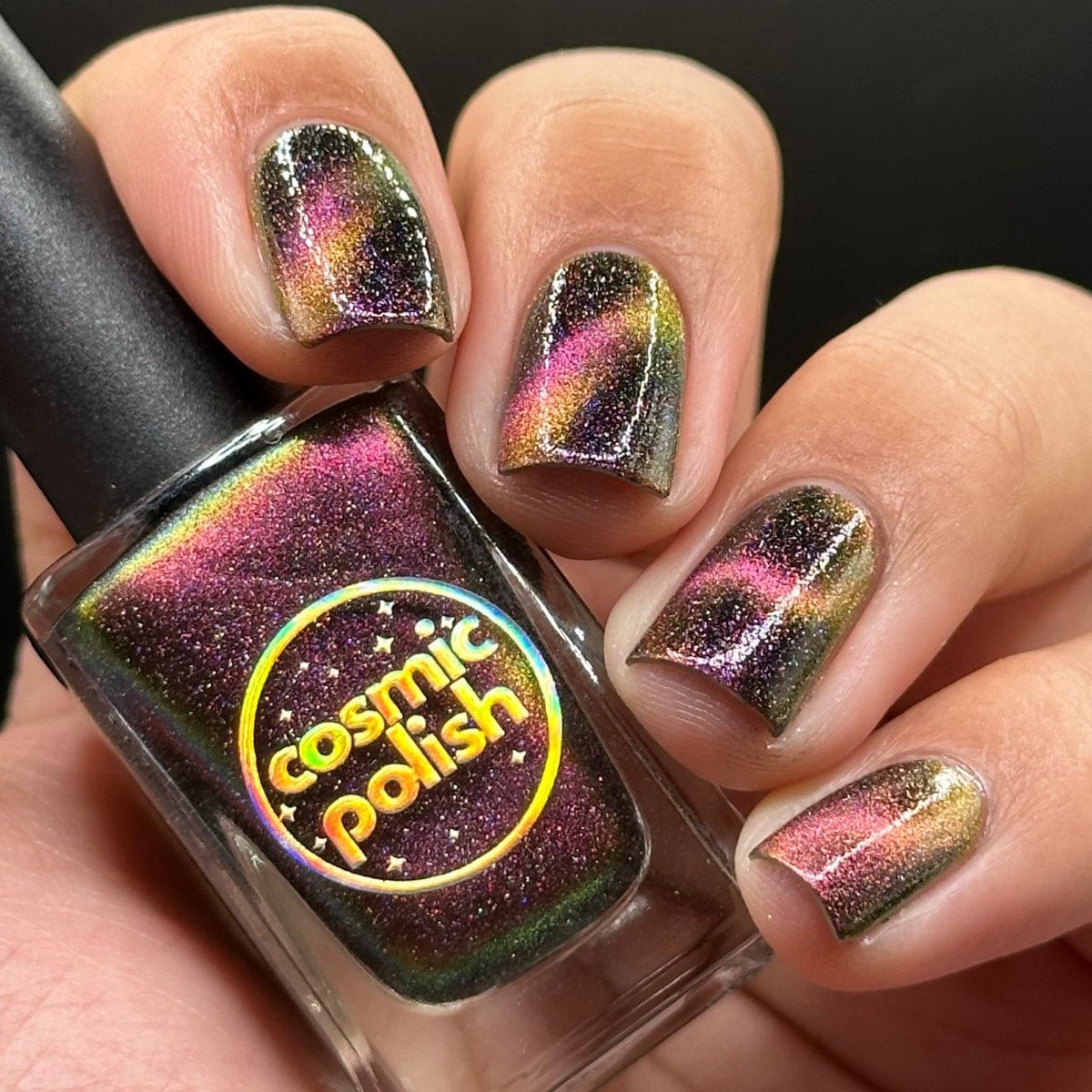 Launch at a dizzying rate with this polish! Escape Velocity is a black-based magnetic polish with a pink to gold shifting stripe and scattered holo. Become a gorgeous bright streak of colour and light at this speed - gravity is no match for your nails!