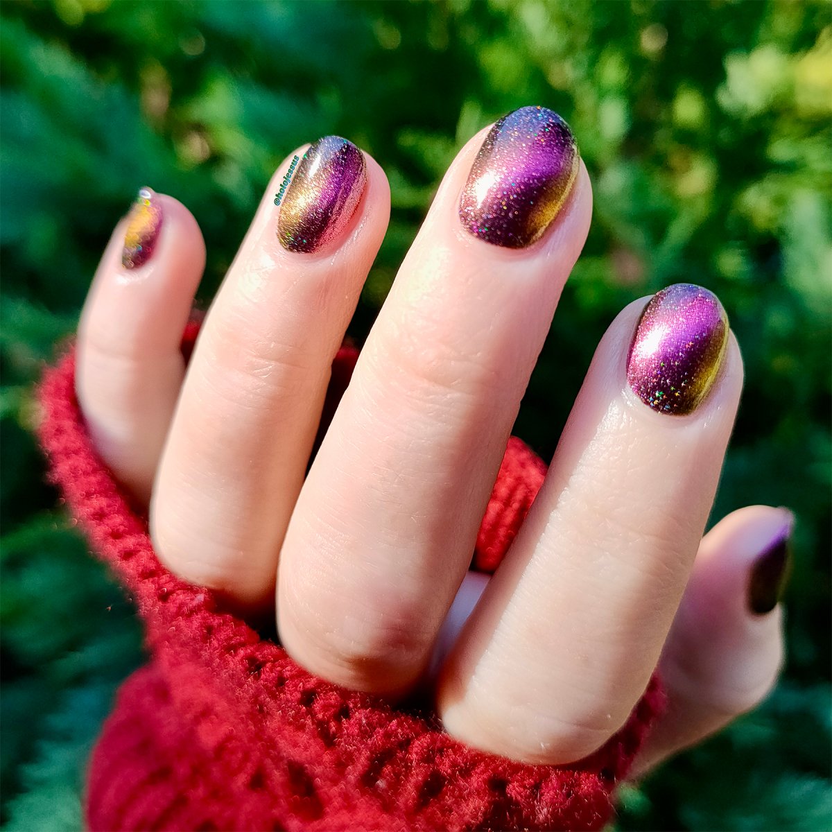 A multichrome nail polish that shifts from bronze to green, to a dark blue. Opaque in 2 - 3 coats depending on your application, top coat recommended for a glossy...
