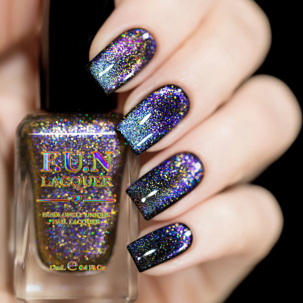 Fancy Twilight captures the captivating charm of holiday evenings, where city lights shimmer and the sky glows in rich twilight tones. This multichrome magnetic polish shifts beautifully from deep violet to sapphire blue with glints of reflective gold, creating a luxurious jewel-tone effect that feels both festive and elegantly dramatic. Holographic particles scatter across the surface, producing bursts of rainbow sparkle that enhance the multidimensional finish.