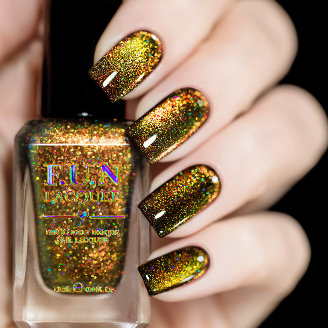 Inspired by the joyful spirit of gatherings, from cheerful dinners to sparkling parties, Festive Gleam brings a sense of warmth and celebration to any look. Its magnetic effect creates a vivid cat-eye beam reminiscent of twinkling lights and glowing ornaments hanging on a shimmering tree. Under bright light, the shade explodes with holographic reflections, while dim light reveals deeper, smoldering tones for a luxurious, glowing finish.