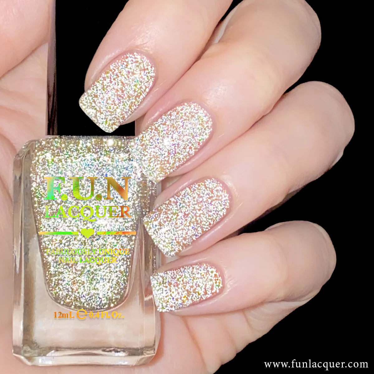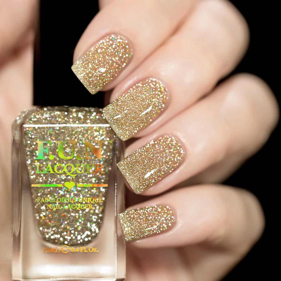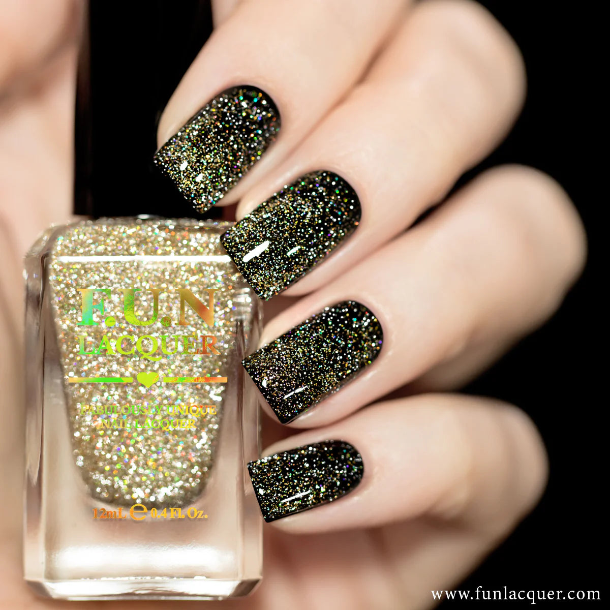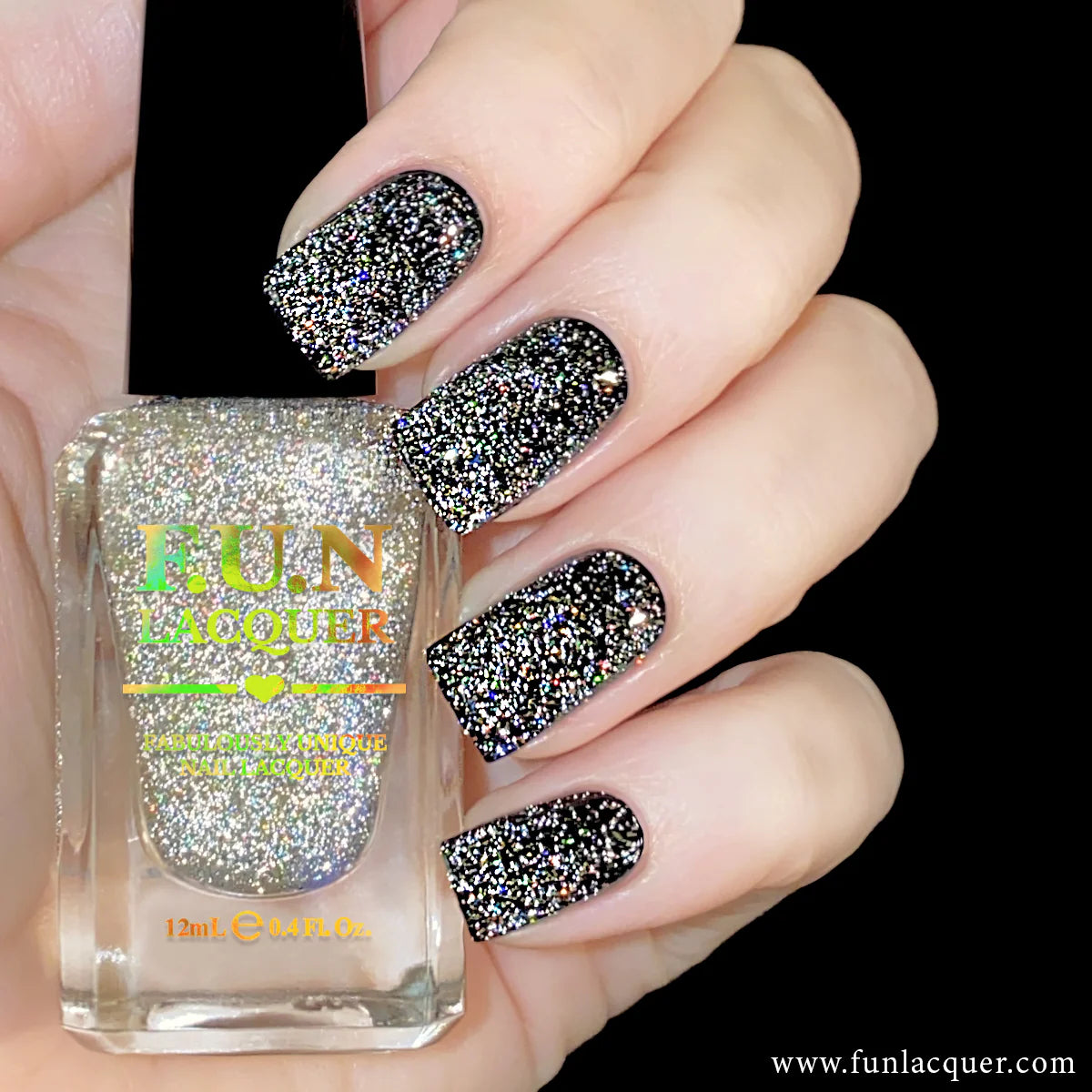 Contain 100% real gold holographic micro fine glitter and super reflective silver fine glitter in clear base, rainbow sparkle at every angle, the coolest polish ever! The reflective effects can be captured with the phone flash. It's looks like mini diamonds all over!