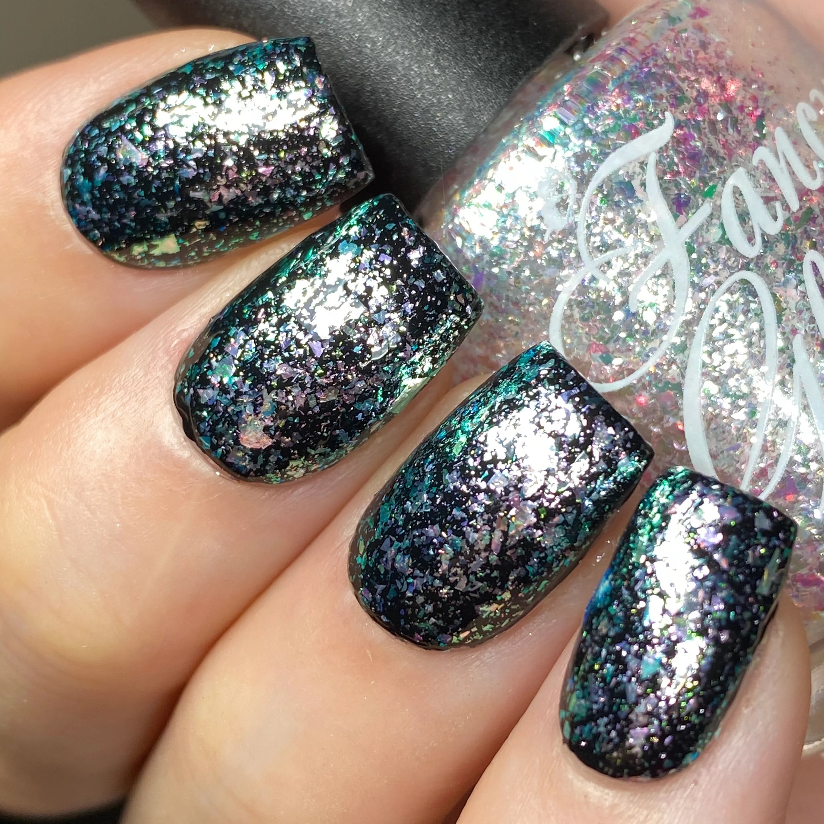 ANTIVENOM is a duochrome lacquer filled with holographic glitter that shifts between shades of soft white and green. 12ml