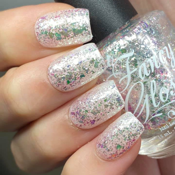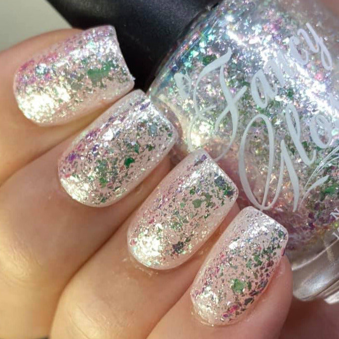 A sheer, neutral beige with a blue to purple shifting shimmer and holo flakies.