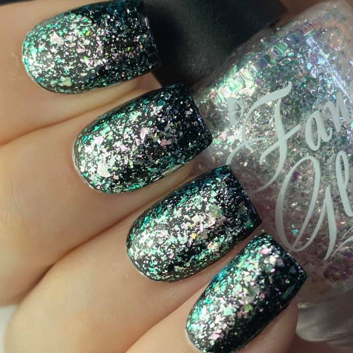 This topper has copper/chartreuse/gold clear flakes. It adds a beautiful finish to all polishes especially cremes. Shown over a black base in some photos